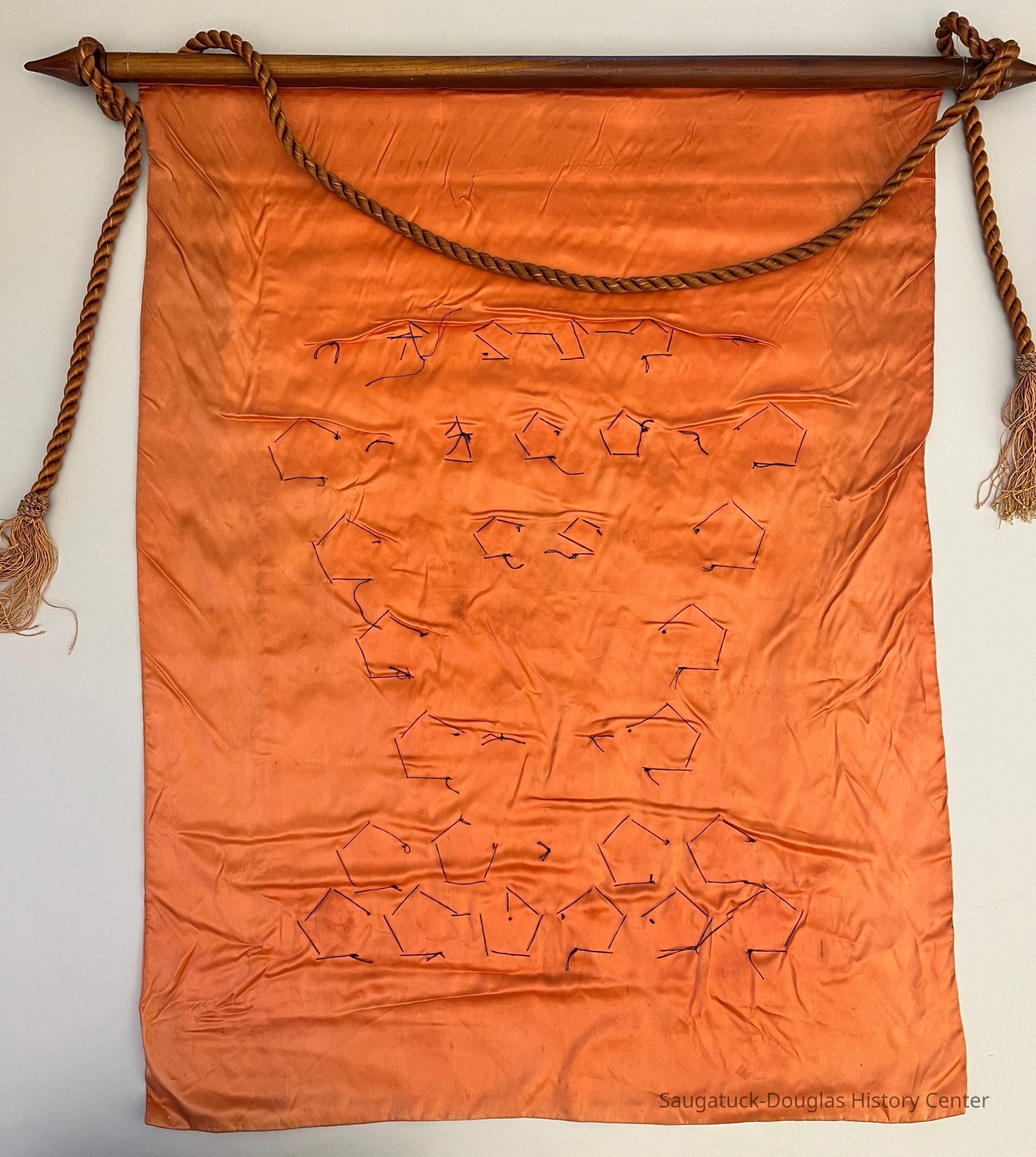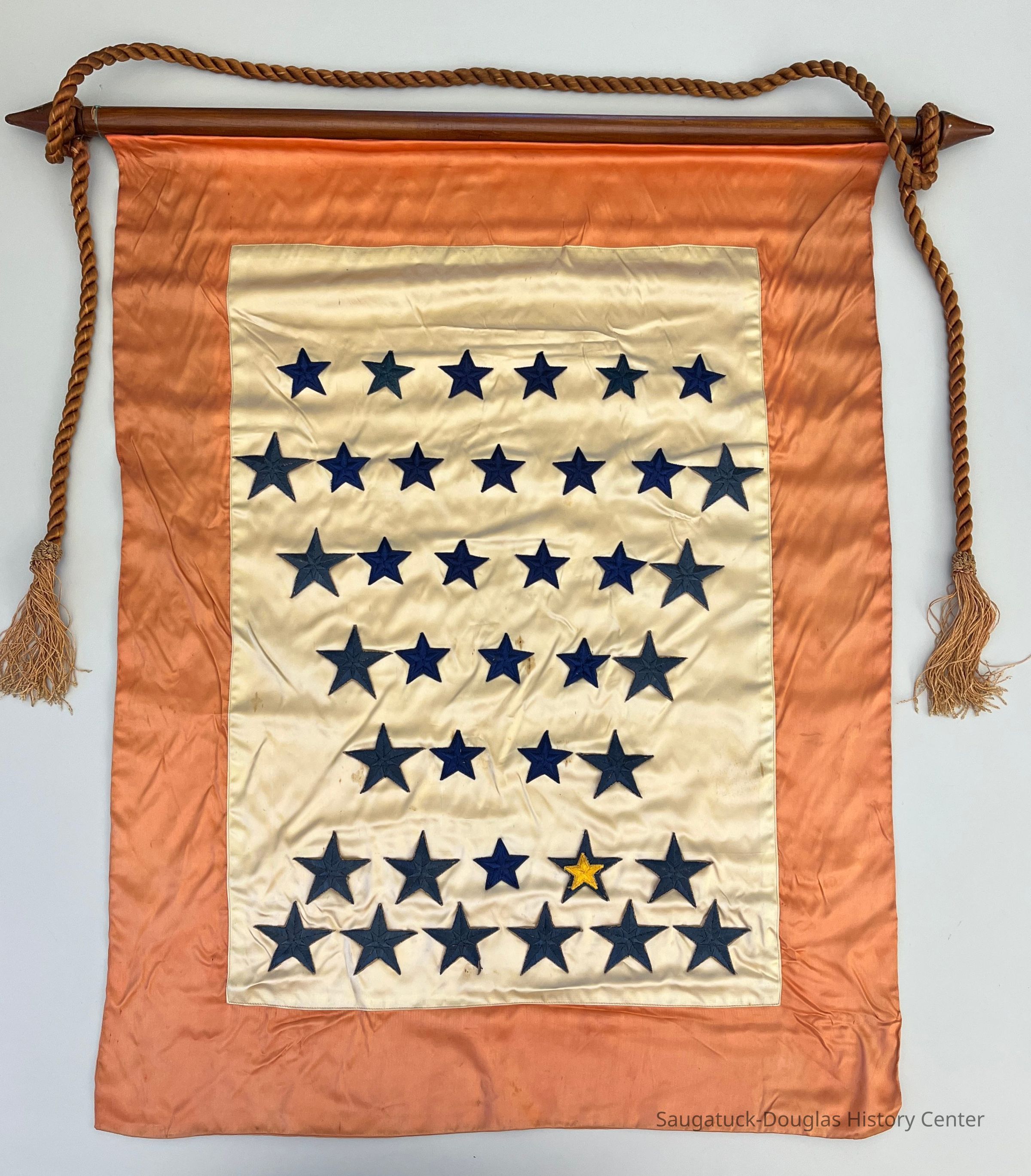 Rectangular banner made of silky, pale red fabric with a white inset. The inset is a field for 21 small and 18 larger blue embroidered stars that hand stitched to the banner. One blue star is topped with a gold star. The banner is attached to wooden pole with fishing line. The pole has pointed finials and a gold braided handing cord with tasseled ends.Collection