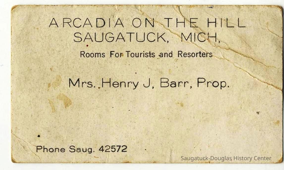 Arcadia on the Hill at Barr farm, Barr, Henry John 1872-1938, Barr, Olga Helene (Schmidt) 1878-1977, Barr, Edna Paula, Barr, Arnold Henry 1901-1977, 6594 Old Allegan Rd/Whitney/Barr/Cappelletti house, Saugatuck Middle & High School 1950-present, Saugatuck Public School 1897-1950, Reed, Leah, Petertyl, Margaret, Robinson, Abbie (Wheeler) 1865-1903, Brink, Helen Takken 1899-1987, Funk, Julia (Whipple) 1903-1998, Barr, Jeanette (Walker) 1902-1979, Pear, Elizabeth Aldean 1902-1991, Heath, Frances Louise (Comey) 1900-1980, Webster, Irene (Robinson) 1898-1991, Boyce, Edna 1902-1974, Hamilton, Helene, Reed, Natalie "Billie" or "Bill", Yaksic/Burns/Huntinghouse house, House, Walter Bradley 1857-1938, Grant, Frederick W. 1873-1919
