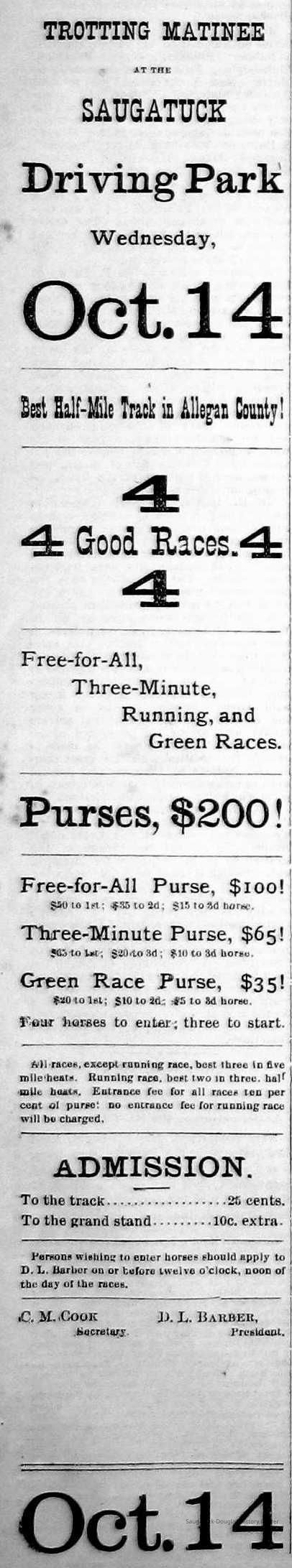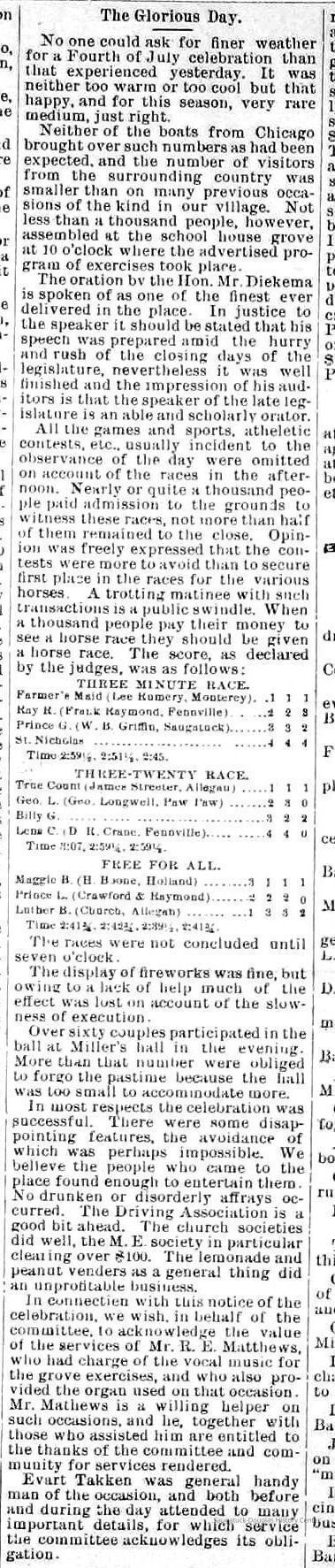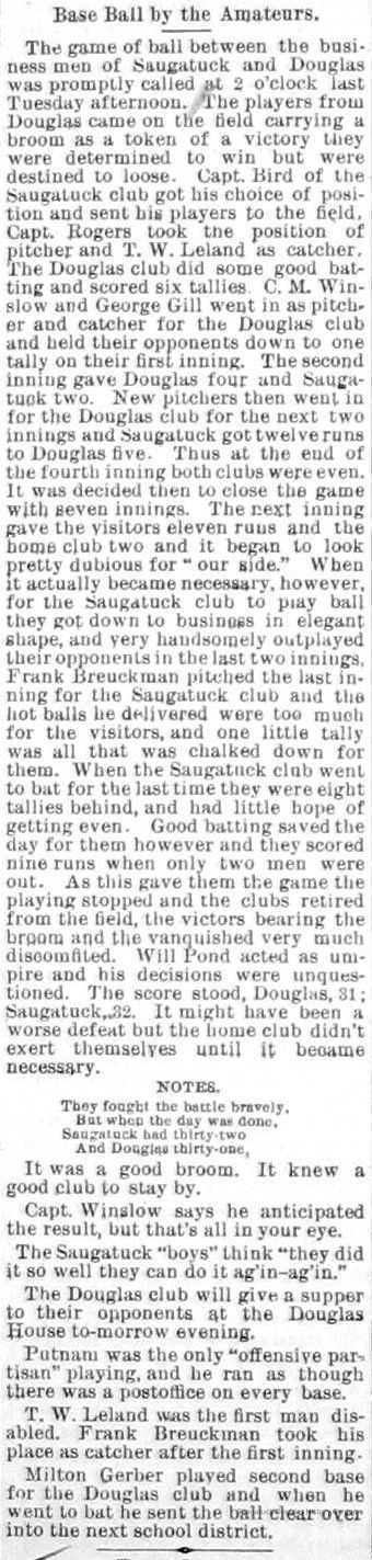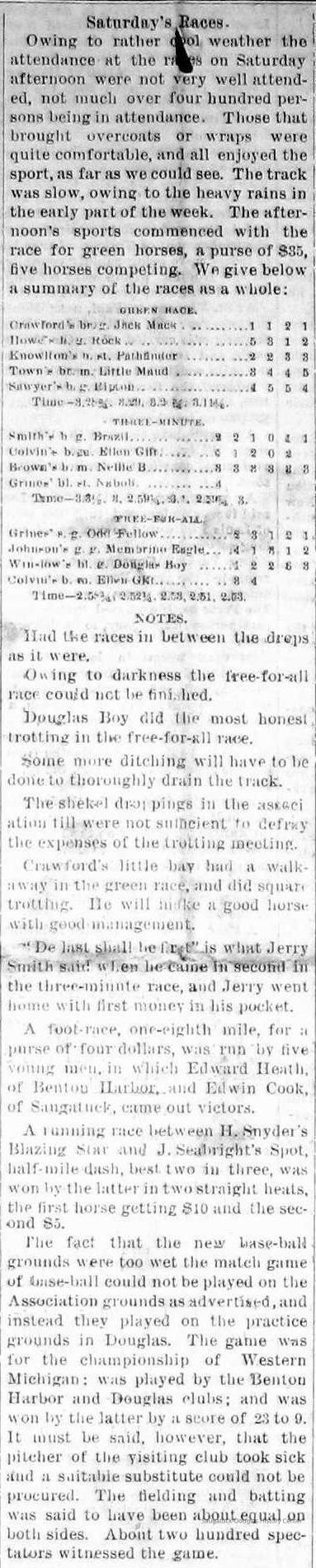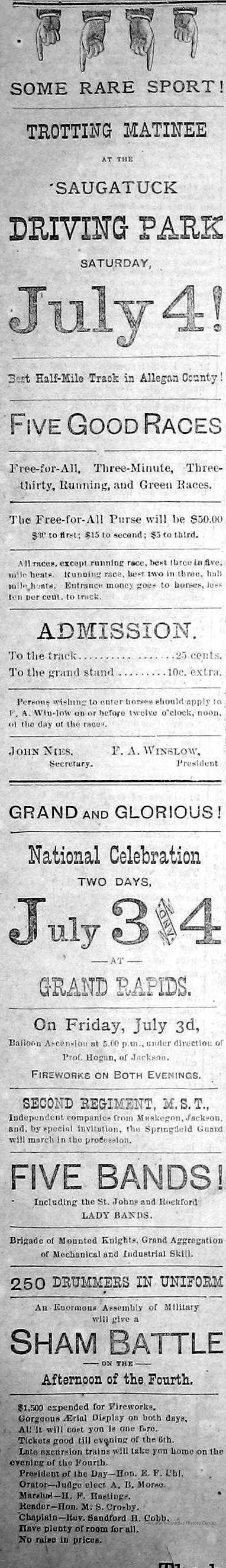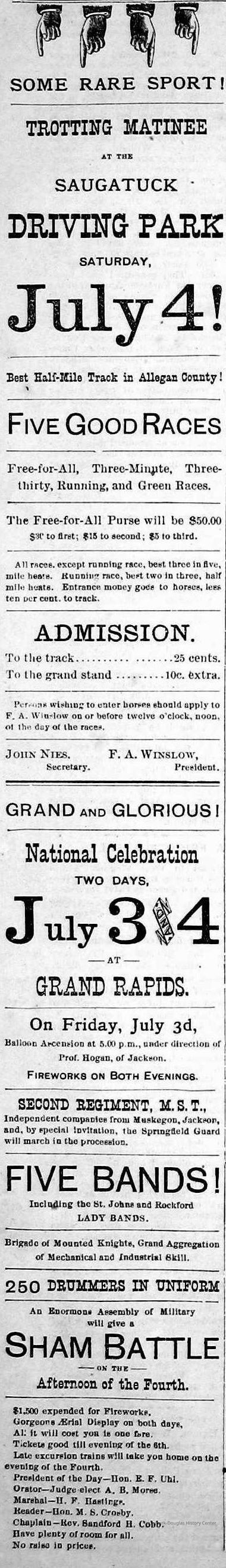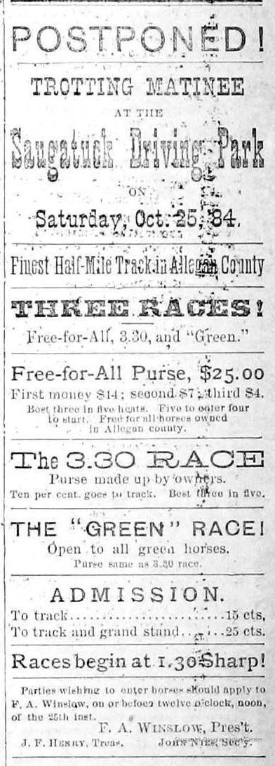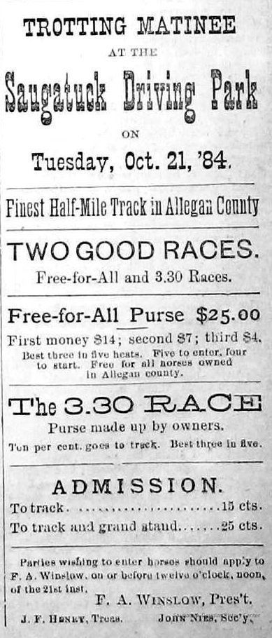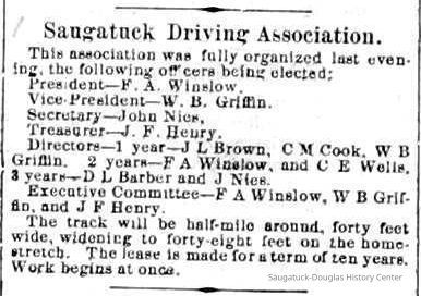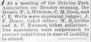 Baseball Ground/Driving Park/Saugatuck Driving Association, Winslow, Franklin A. 1853-1897, Griffin, Wallace B. 1842-1904, Nies, Jan "John" 1836-1920, Henry, John F. 1834/6-1918, Cook, Civilian Morse 1849-1928, Baldwin, S.A., Wells, C.E., Barber, Daniel L. 1840-1909, Babcock, George W. 1862-1941, Littlejohn, Flavius Josephus c1804-1880, Crawford, George 1846-1895, Rogers, Reuben Turner 1840-1926, Leland, Thornton W. 1850-1930, Winslow, Clarence Morton 1885-1958, Pond, William H. 1855-1929, Upham's Opera House/Miller's Hall, Takken, Evart E. "Edward" 1841-1916