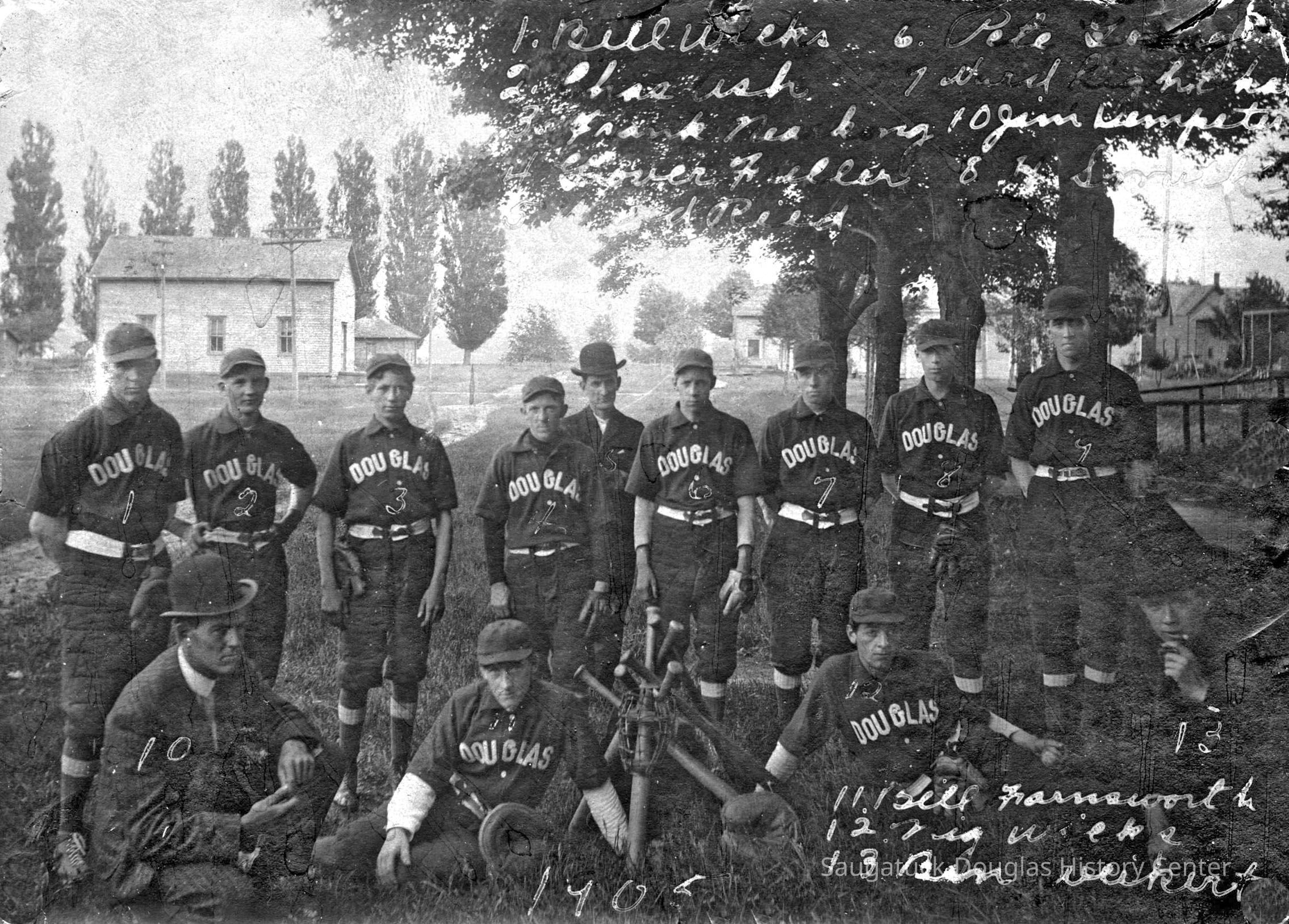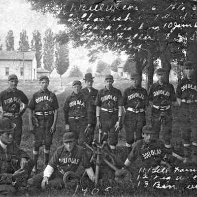Douglas baseball team photo with the names of the players written on the print. An index card lists the players as 1. Bill Wicks, 2. Charles Ash, 3. Frank Naracong, 4. Grover Fuller, 5. Ward Reid, 6. Pete Gomge, 7. Ward Lighthart, 10. Jim Dempster, 8. H. Smith, 11. Bill Farnsworth, 12. Nig? Wicks and 13. Ben Weigert