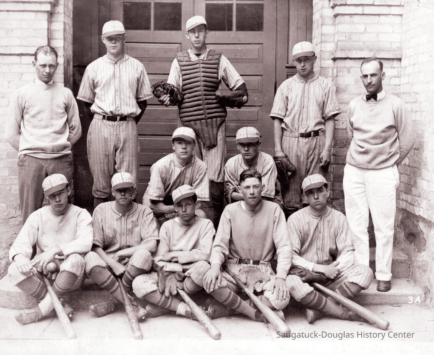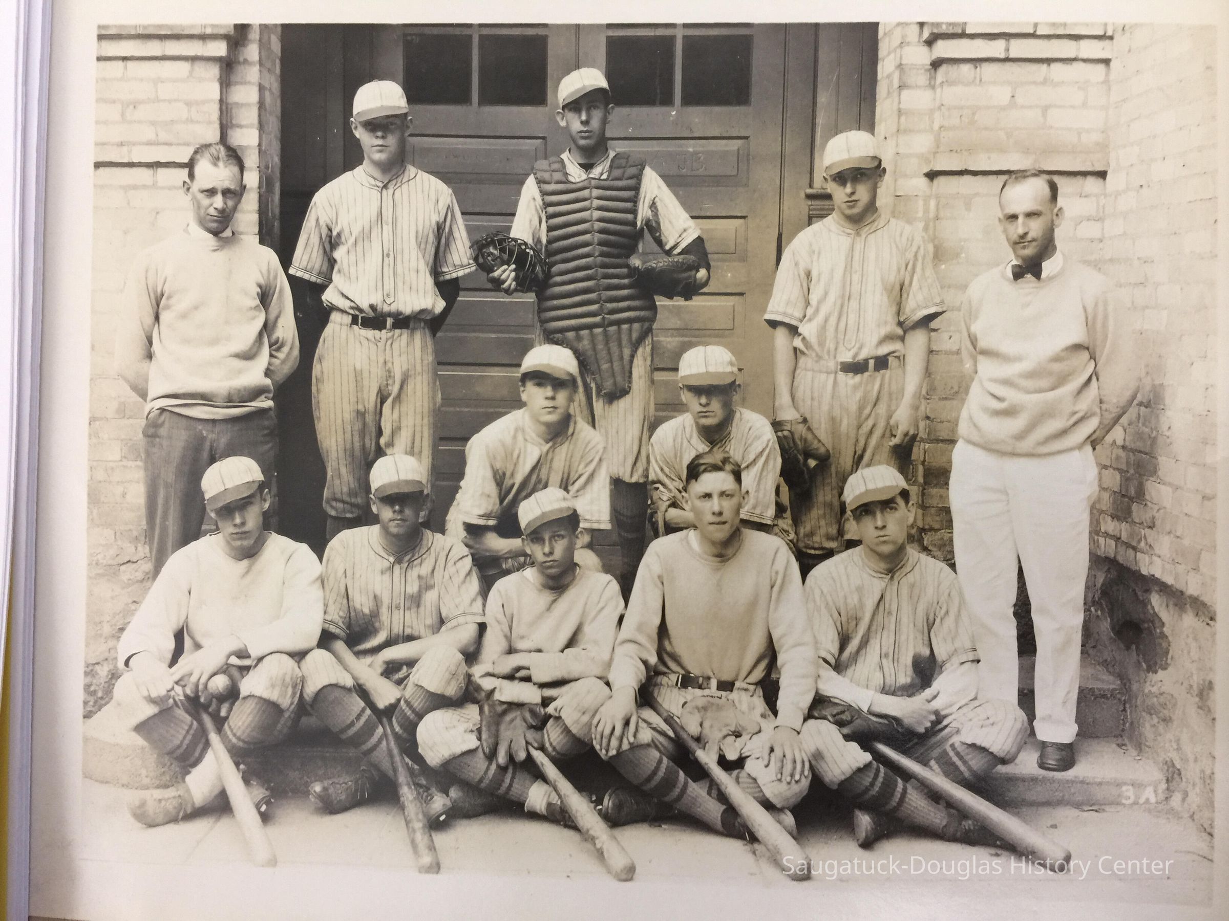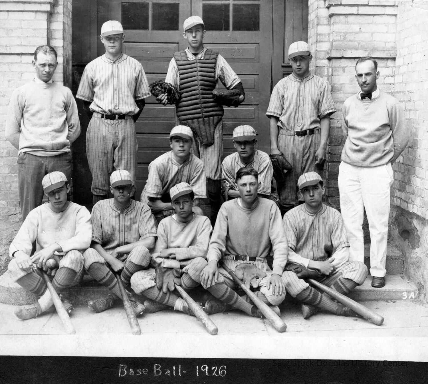 Photo of two men and ten boys. The boys are dressed in baseball uniforms with caps, gloves and bats. The group is standing outside the double wooden doors of the Saugatuck High School. 1926.