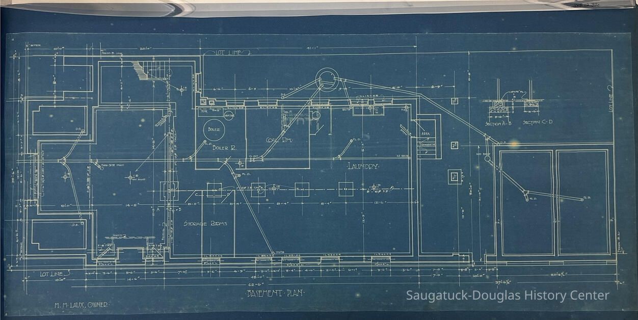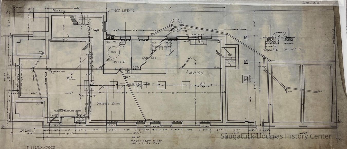 This architectural drawing shows a semi-detailed plan for the basement of the Laux flat building. It contains some name labels for certain rooms and measurements throughout.Collection