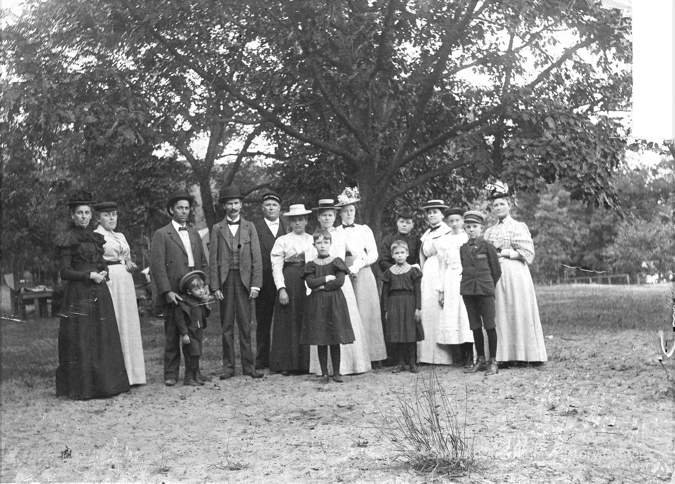 L to R: Sarah Kirby [mourning dress], Mrs. Gerber, E.E. Weed, Prof. Flanegan, D.M. Gerber, Lenore Spencer, Mrs. Weed, Faith Nevens, Bud Kirby, Sadie Thomas,Photograph Details
