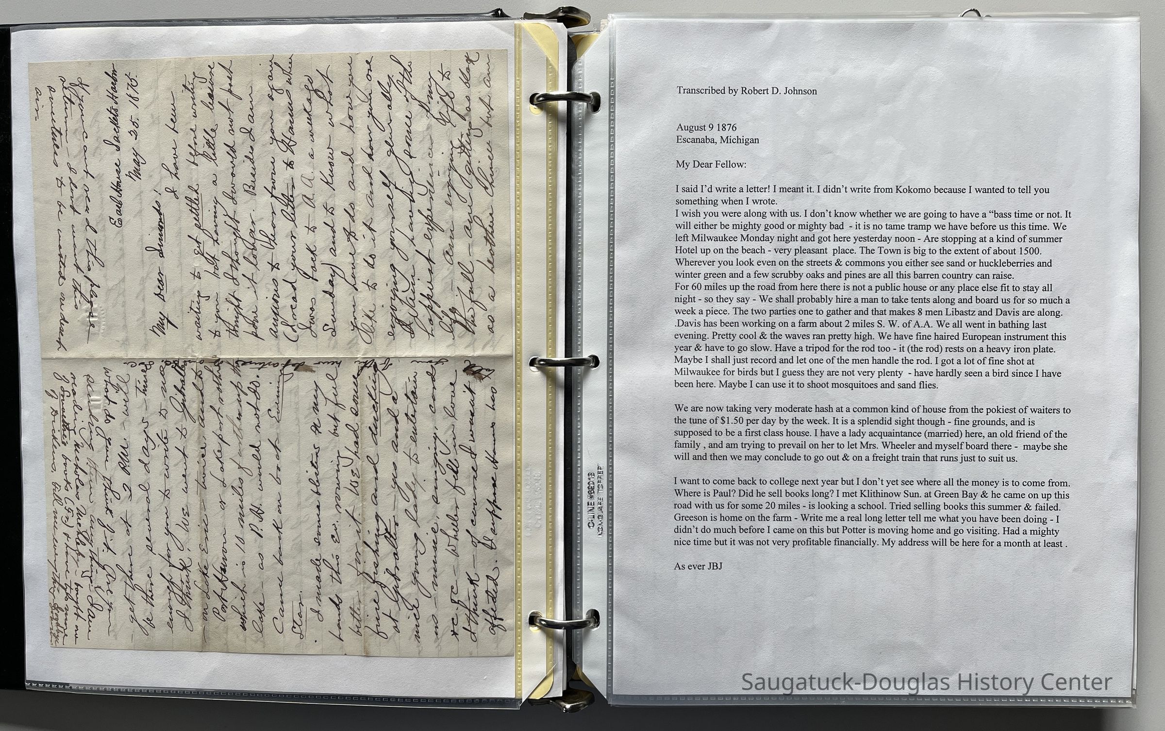 3-ring binder filled with letters and typed transcriptions of correspondence between John Butler Johnson and O.C. Simonds, D.W. Lockwood, C.R. Comstock, 1st Lt. Suanh S. Huch, A.E. Syanmes, the Mississippi River Comm, W.A. Worner, A.P. Berry & Co., Mr. & Mrs Henby (requesting their daughter's hand in marriage), his daughter Marjorie Daw Johnson and others. The letters date from 1875 until 1902, when John Butler was killed in a horse-and-wagon accident while traveling from Pier Cove to Fennville. Some envelopes are also included as well as provisions receipts and accounts for U.S. Survey Boat "Pioneer".