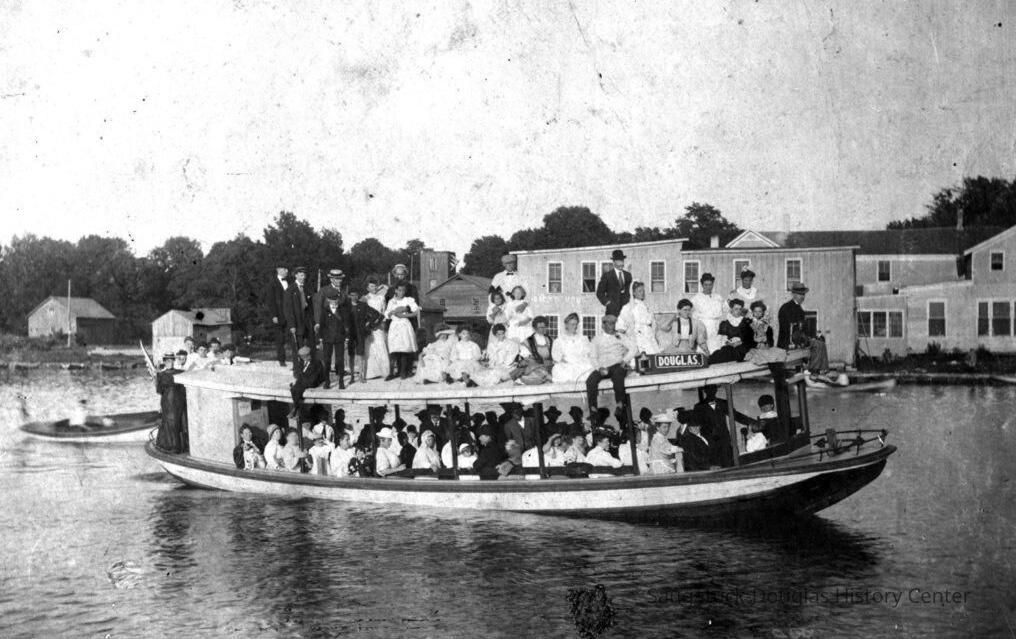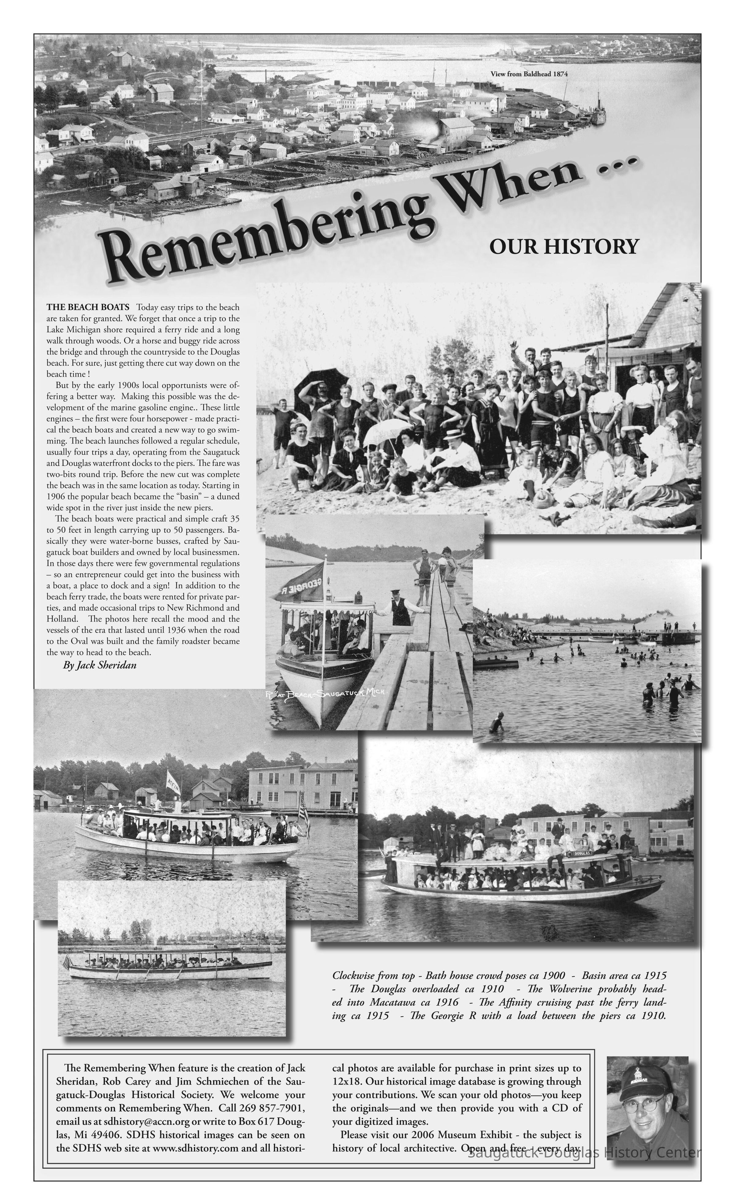 THE BEACH BOATS Today easy trips to the beach are taken for granted. We forget that once a trip to the Lake Michigan shore required a ferry ride and a long walk through woods. Or a horse and buggy ride across the bridge and through the countryside to the Douglas beach. For sure, just getting there cut way down on the beach time !