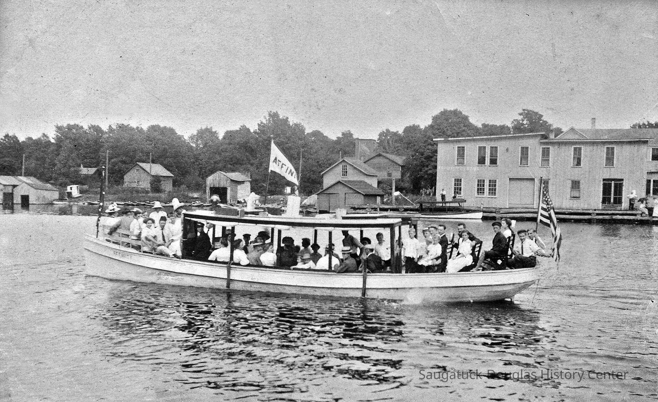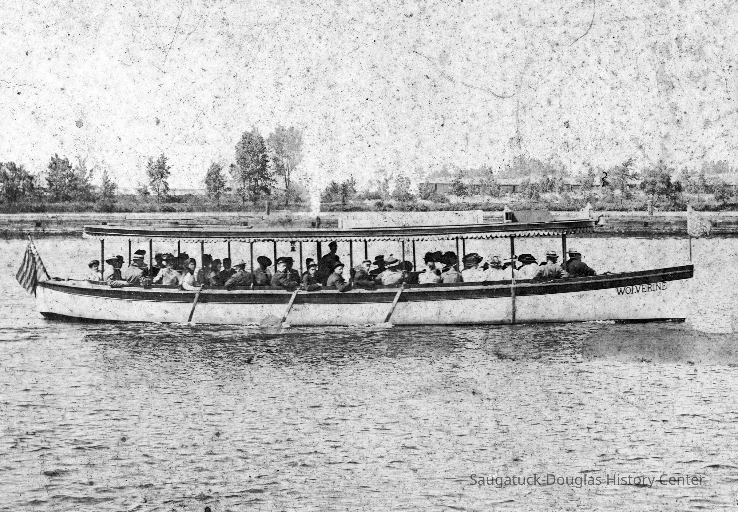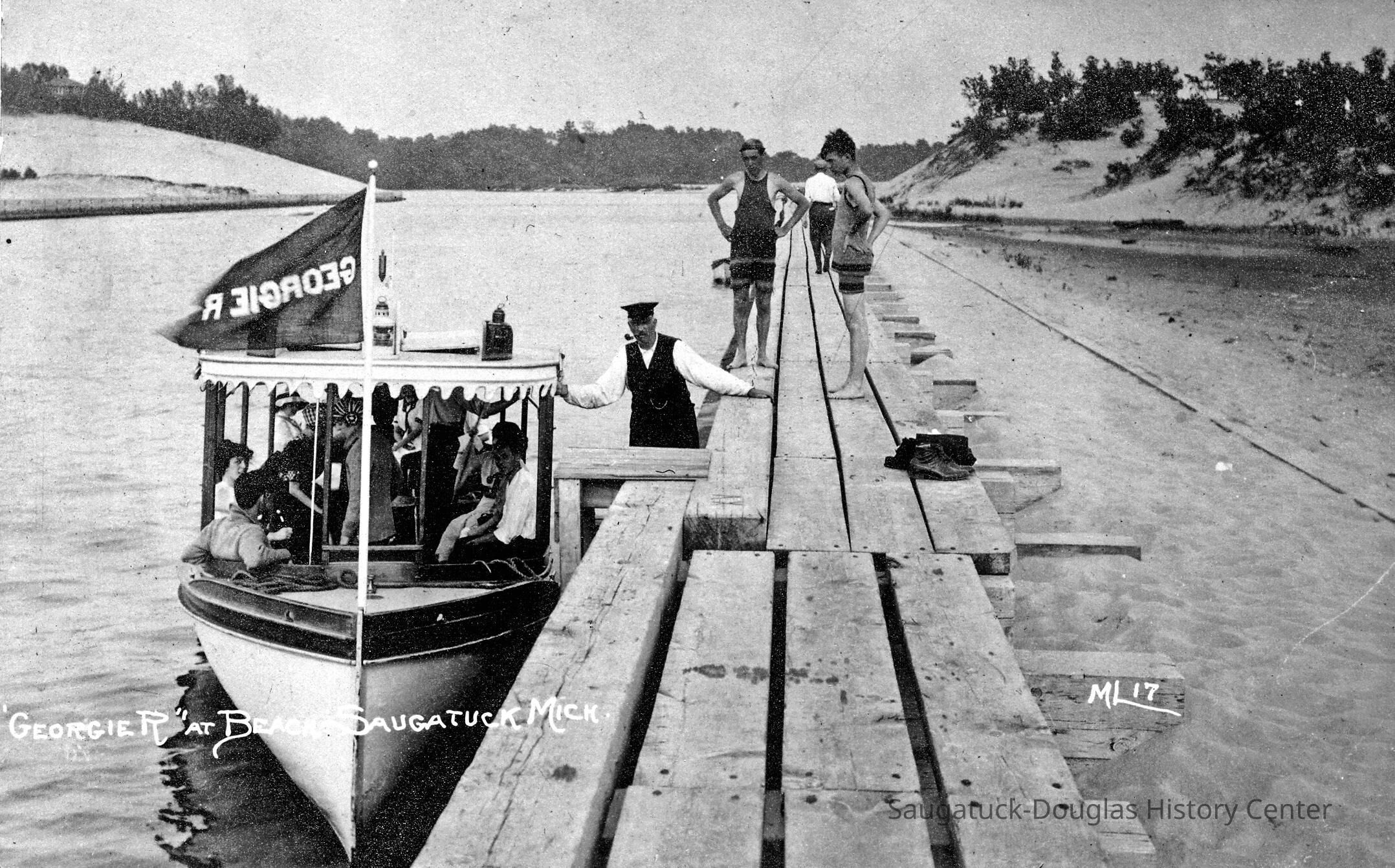 The beach boats were practical and simple craft 35 to 50 feet in length carrying up to 50 passengers. Basically they were water-borne busses, crafted by Saugatuck boat builders and owned by local businessmen. In those days there were few governmental regulations – so an entrepreneur could get into the business with a boat, a place to dock and a sign! In addition to the beach ferry trade, the boats were rented for private parties, and made occasional trips to New Richmond and Holland. The photos here recall the mood and the vessels of the era that lasted until 1936 when the road to the Oval was built and the family roadster became the way to head to the beach.