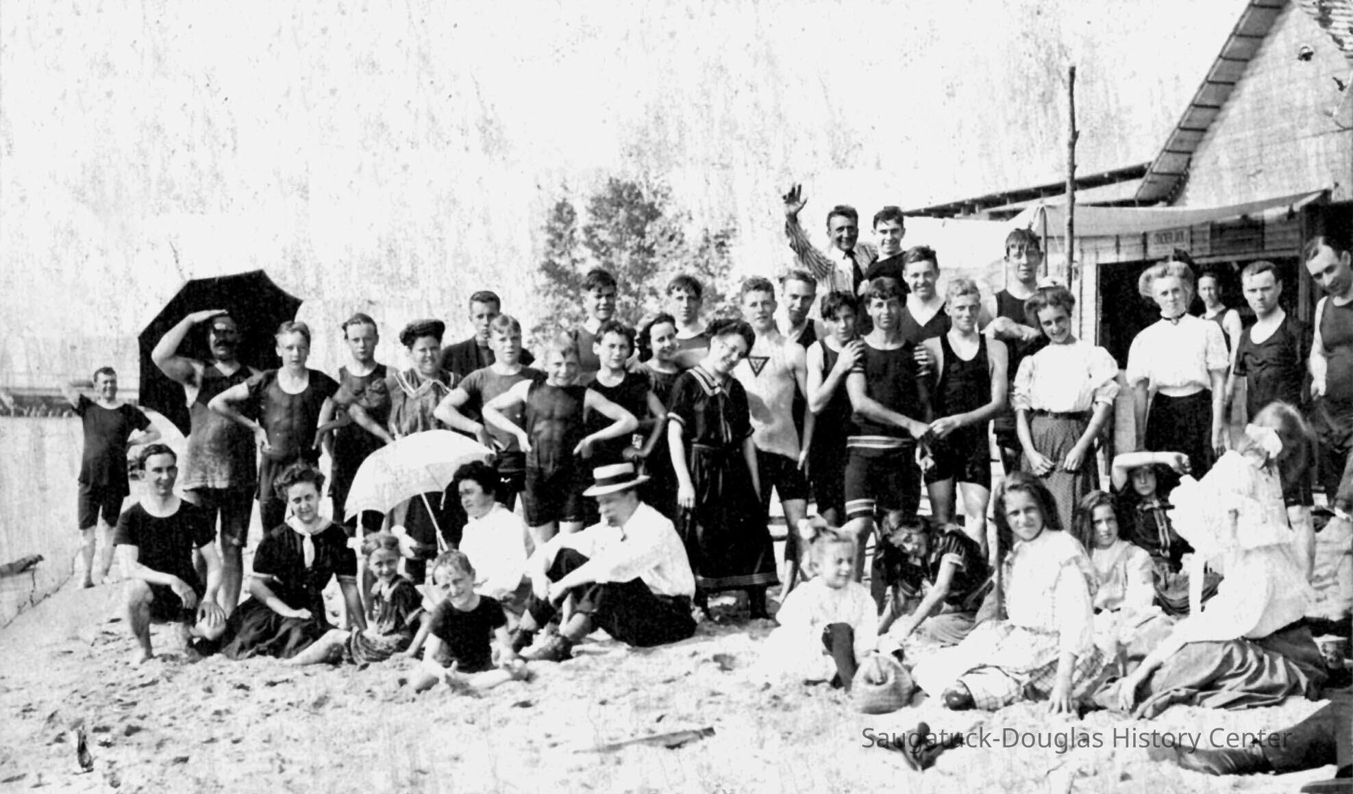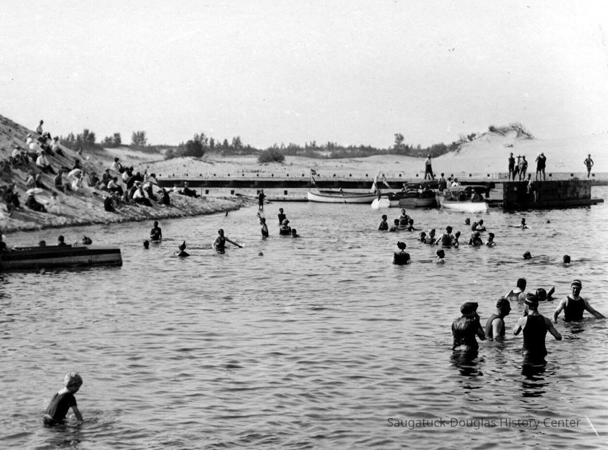 But by the early 1900s local opportunists were offering a better way. Making this possible was the development of the marine gasoline engine.. These little engines – the first were four horsepower - made practical the beach boats and created a new way to go swimming. The beach launches followed a regular schedule, usually four trips a day, operating from the Saugatuck and Douglas waterfront docks to the piers. The fare was two-bits round trip. Before the new cut was complete the beach was in the same location as today. Starting in 1906 the popular beach became the “basin” – a duned wide spot in the river just inside the new piers.