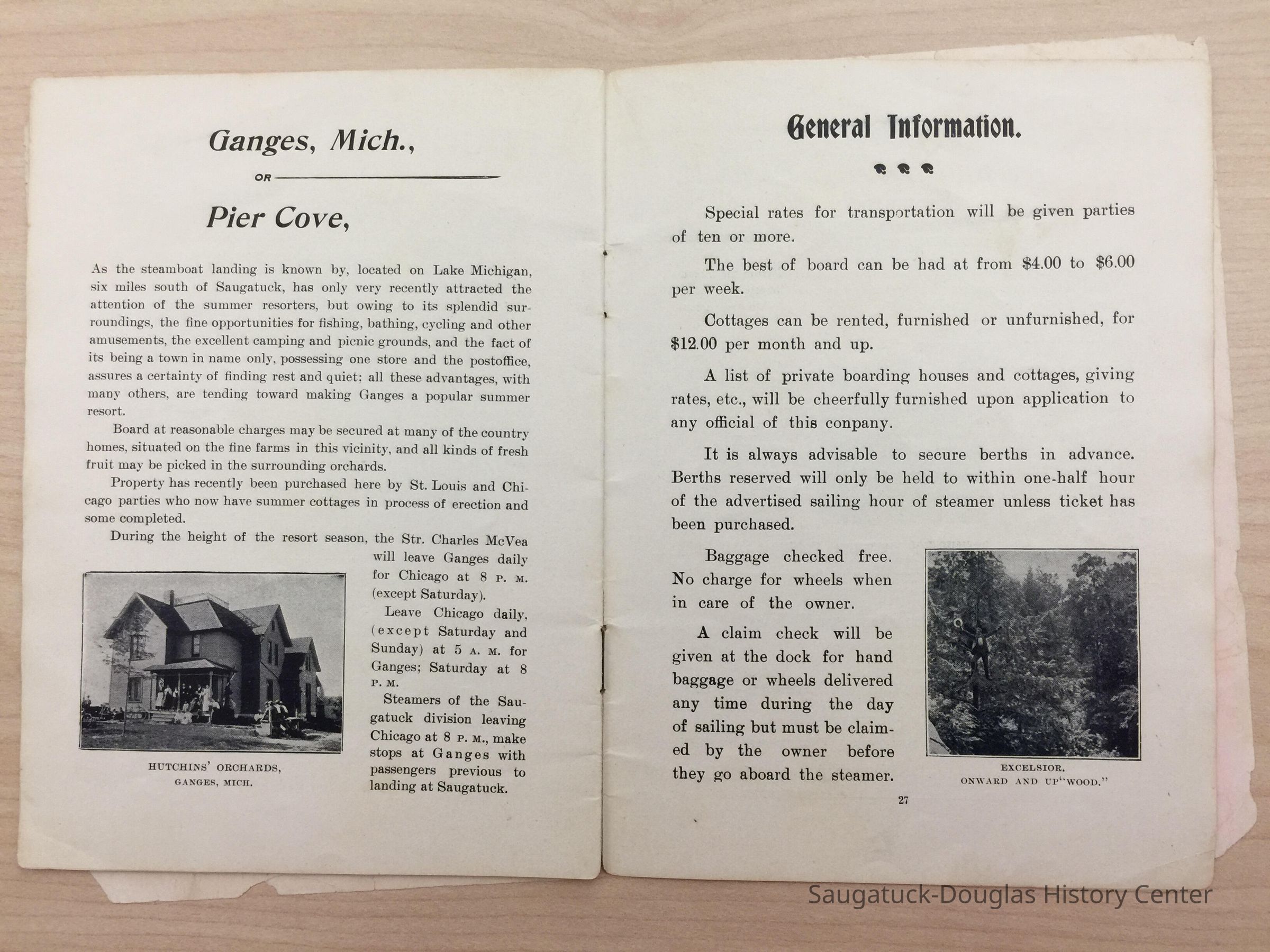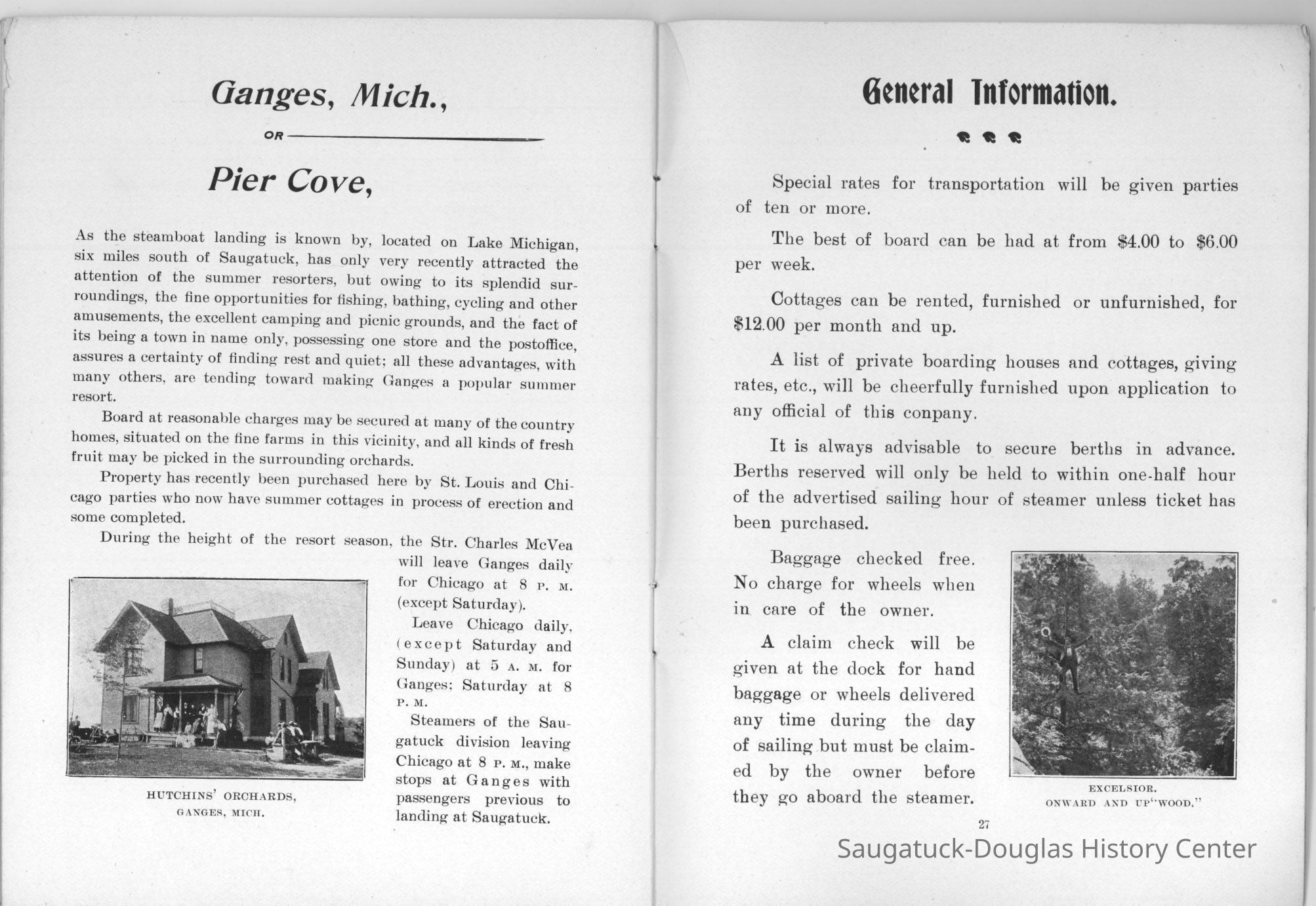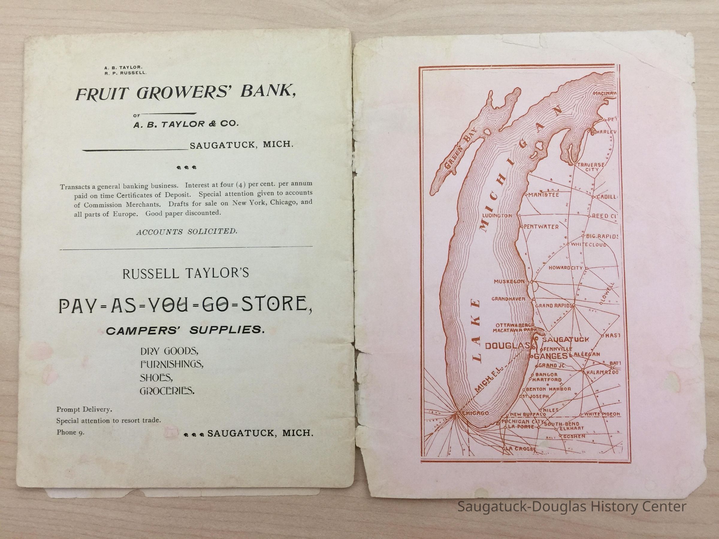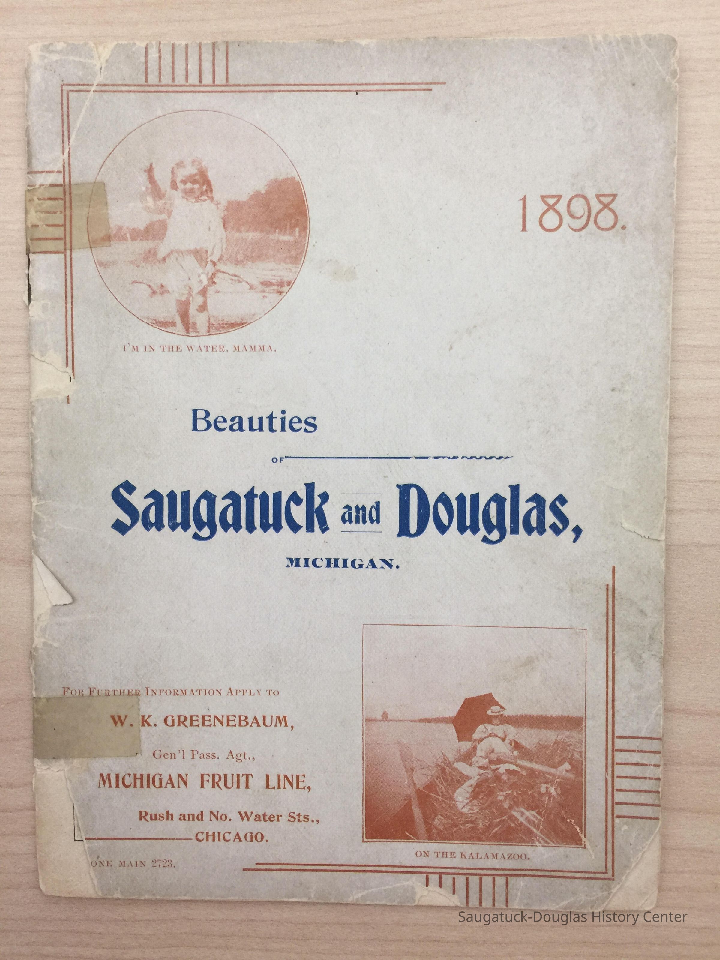 An advertising booklet promoting the Saugatuck-Douglas-Pier Cove area in 1898 for the Michigan Fruit Line Shipping Company. Includes descriptions of natural areas and how this can be an ideal vacation destination. The local time table for steamers appears on page 25. Includes advertisements from various Saugatuck area businesses. b&w photos.