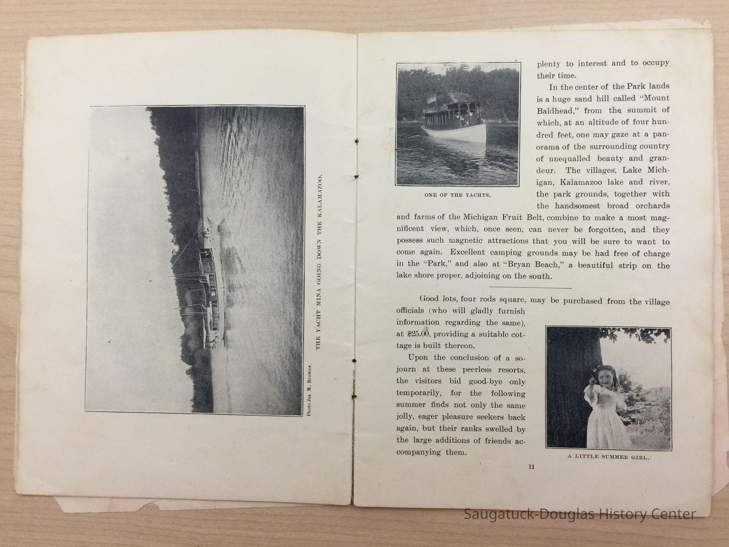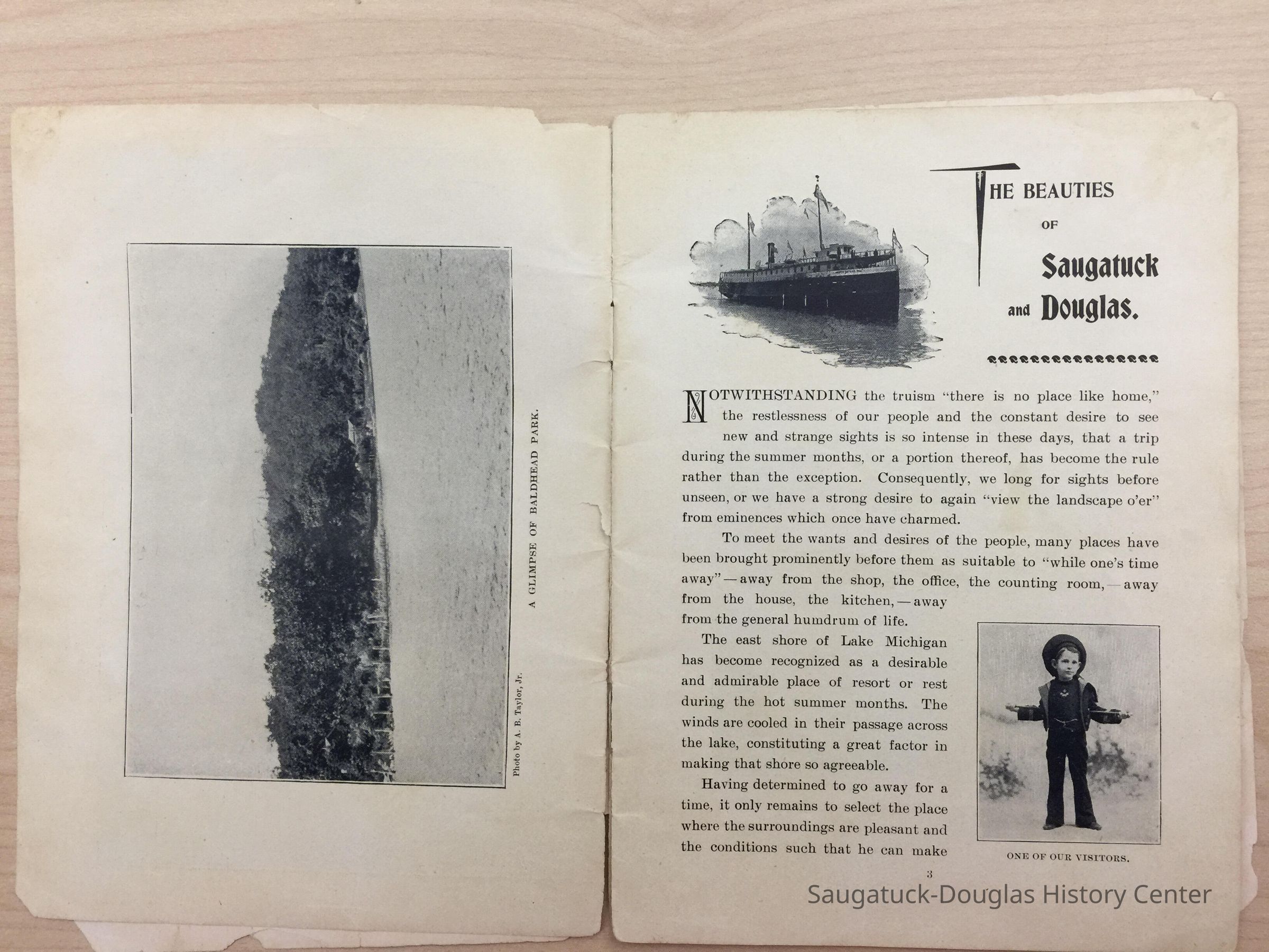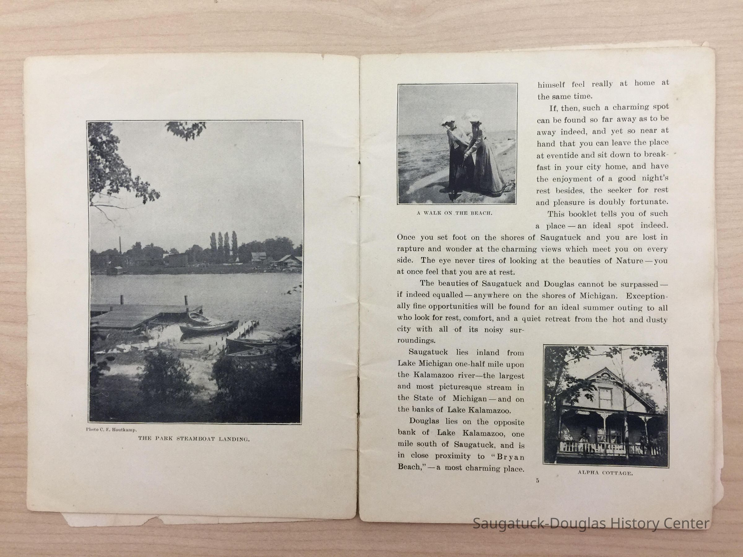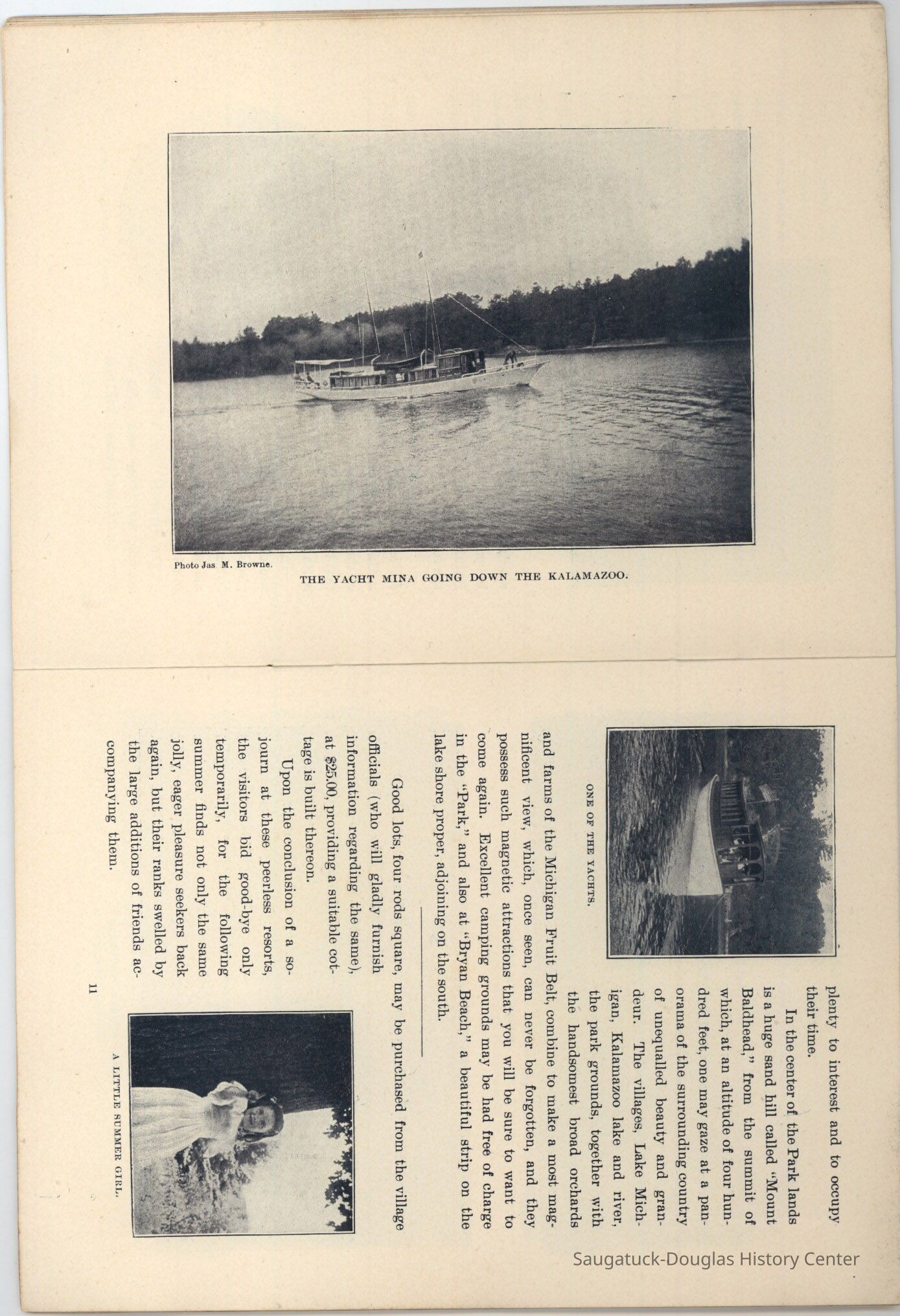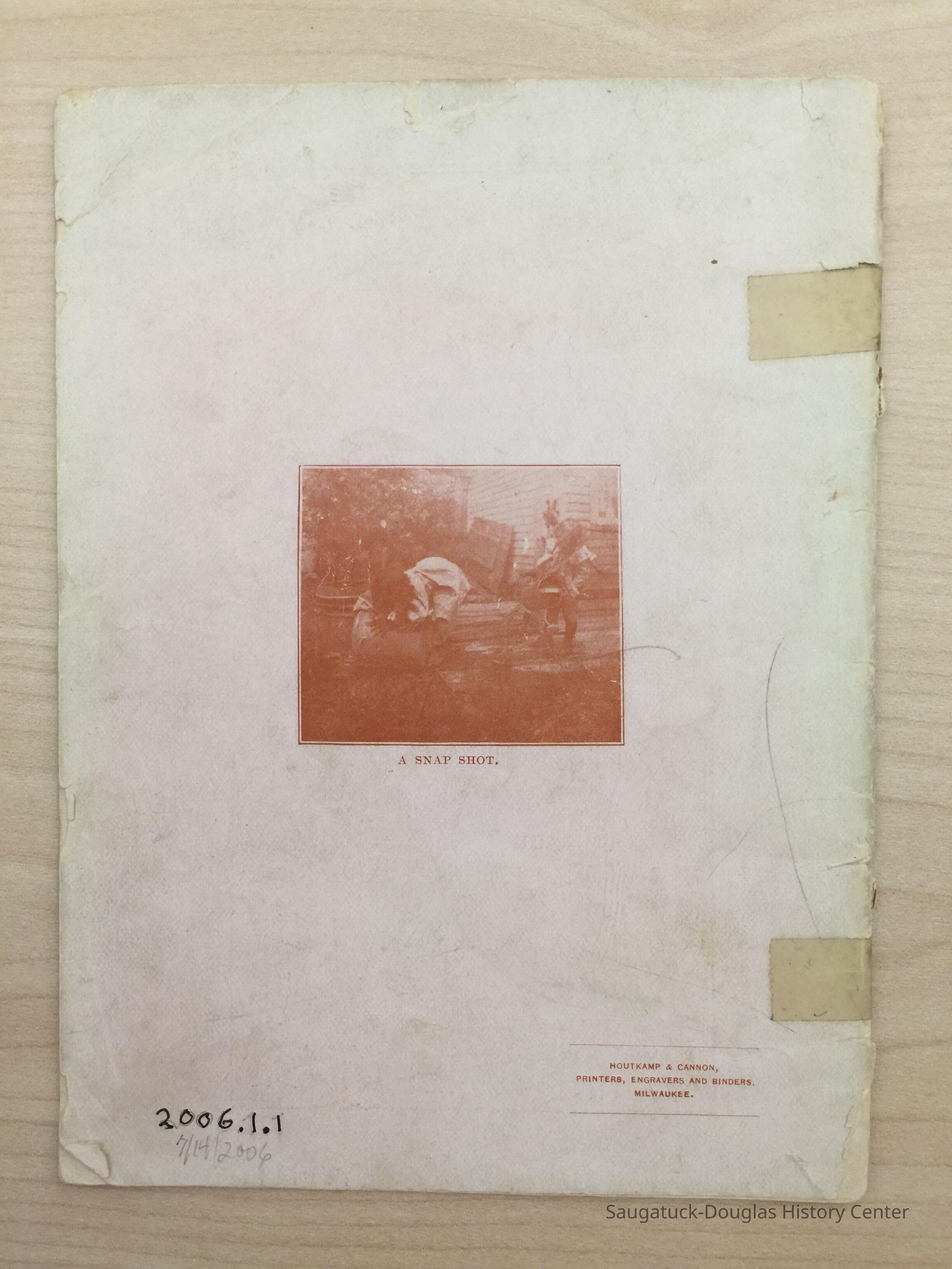 An advertising booklet promoting the Saugatuck-Douglas-Pier Cove area in 1898 for the Michigan Fruit Line Shipping Company. Includes descriptions of natural areas and how this can be an ideal vacation destination. The local time table for steamers appears on page 25. Includes advertisements from various Saugatuck area businesses. b&w photos.