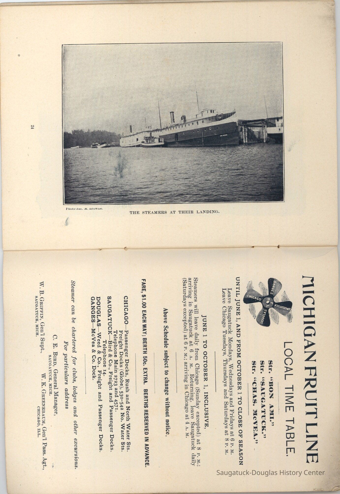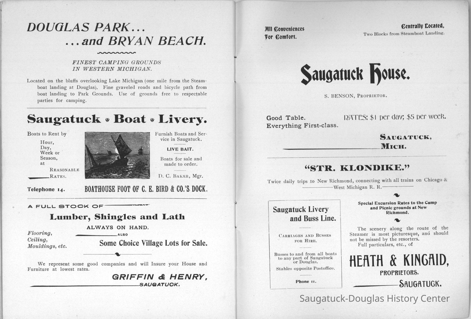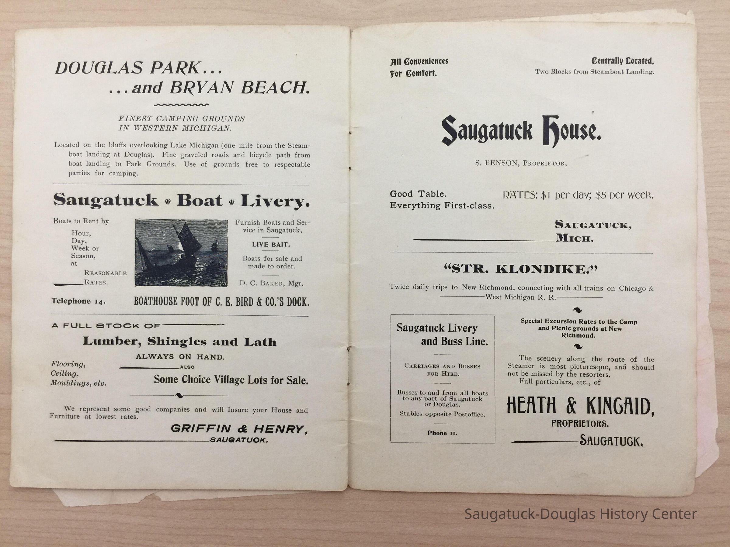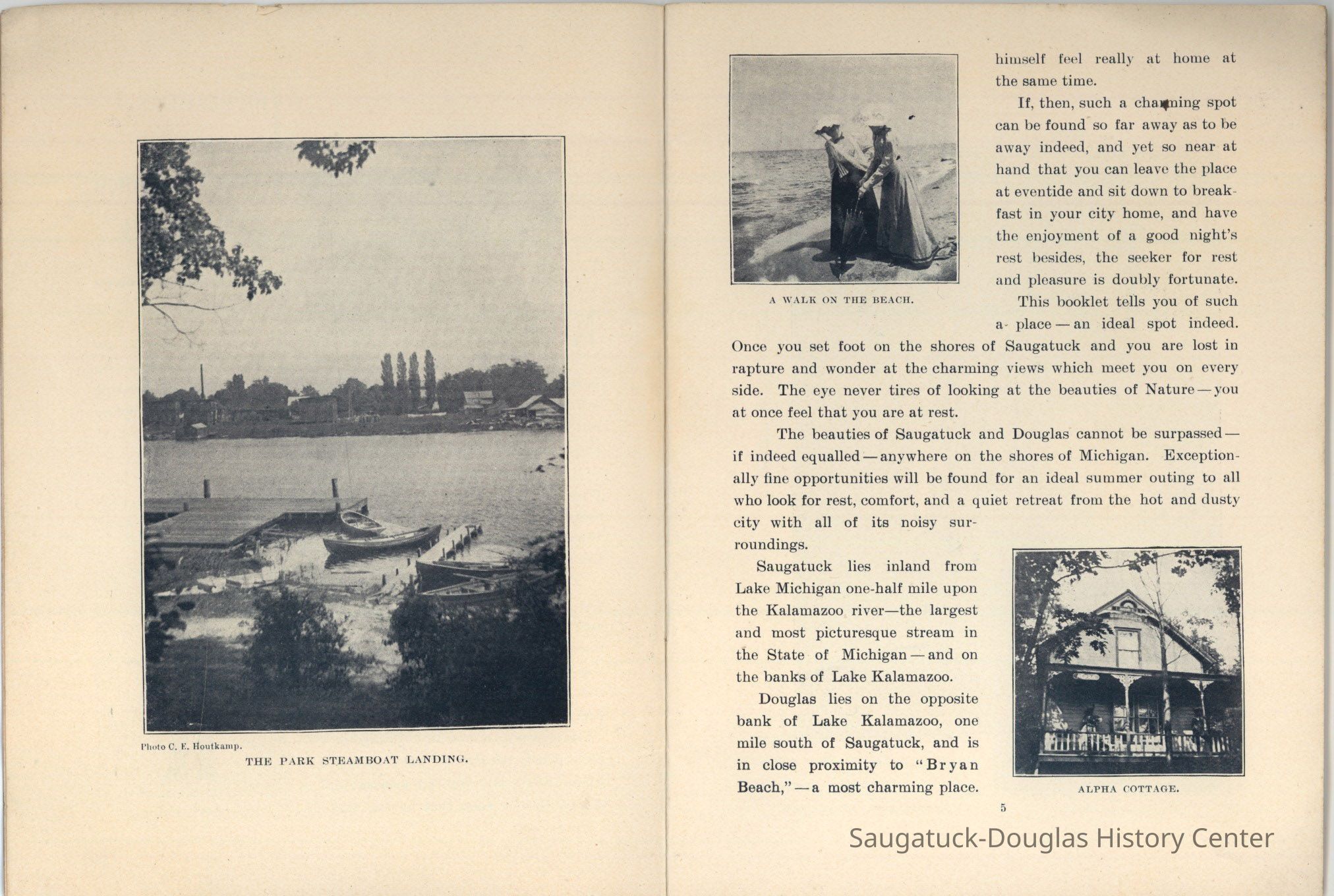 An advertising booklet promoting the Saugatuck-Douglas-Pier Cove area in 1898 for the Michigan Fruit Line Shipping Company. Includes descriptions of natural areas and how this can be an ideal vacation destination. The local time table for steamers appears on page 25. Includes advertisements from various Saugatuck area businesses. b&w photos.