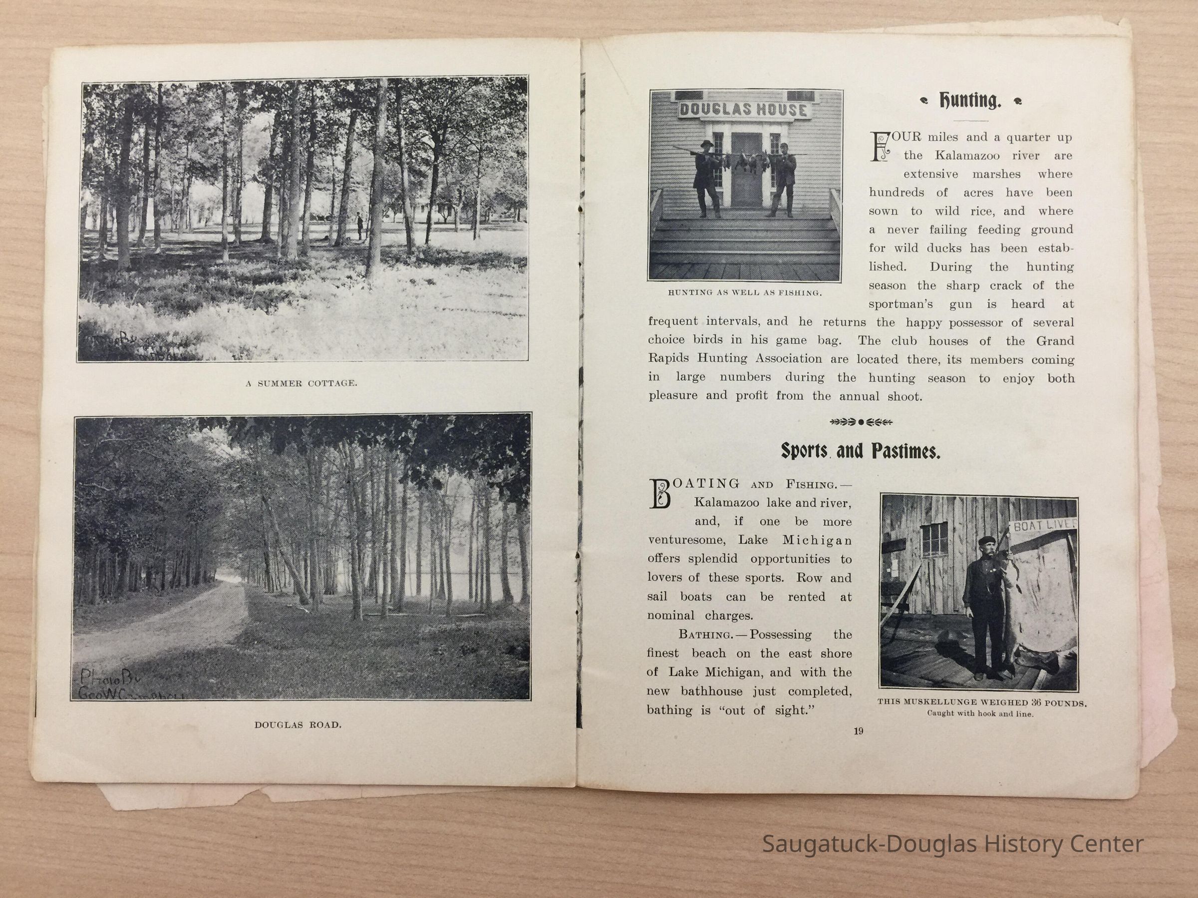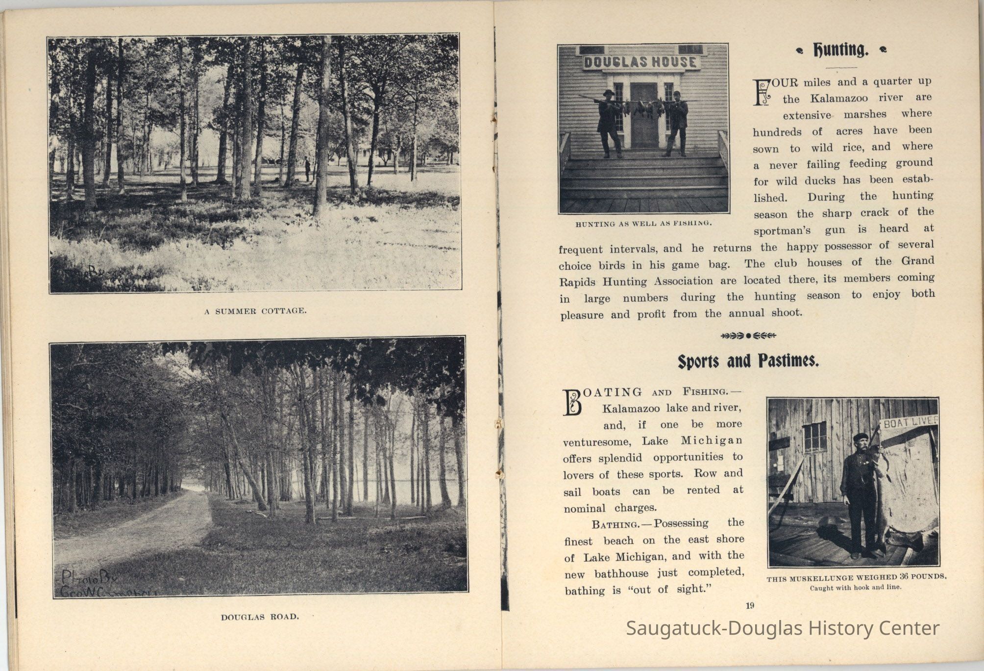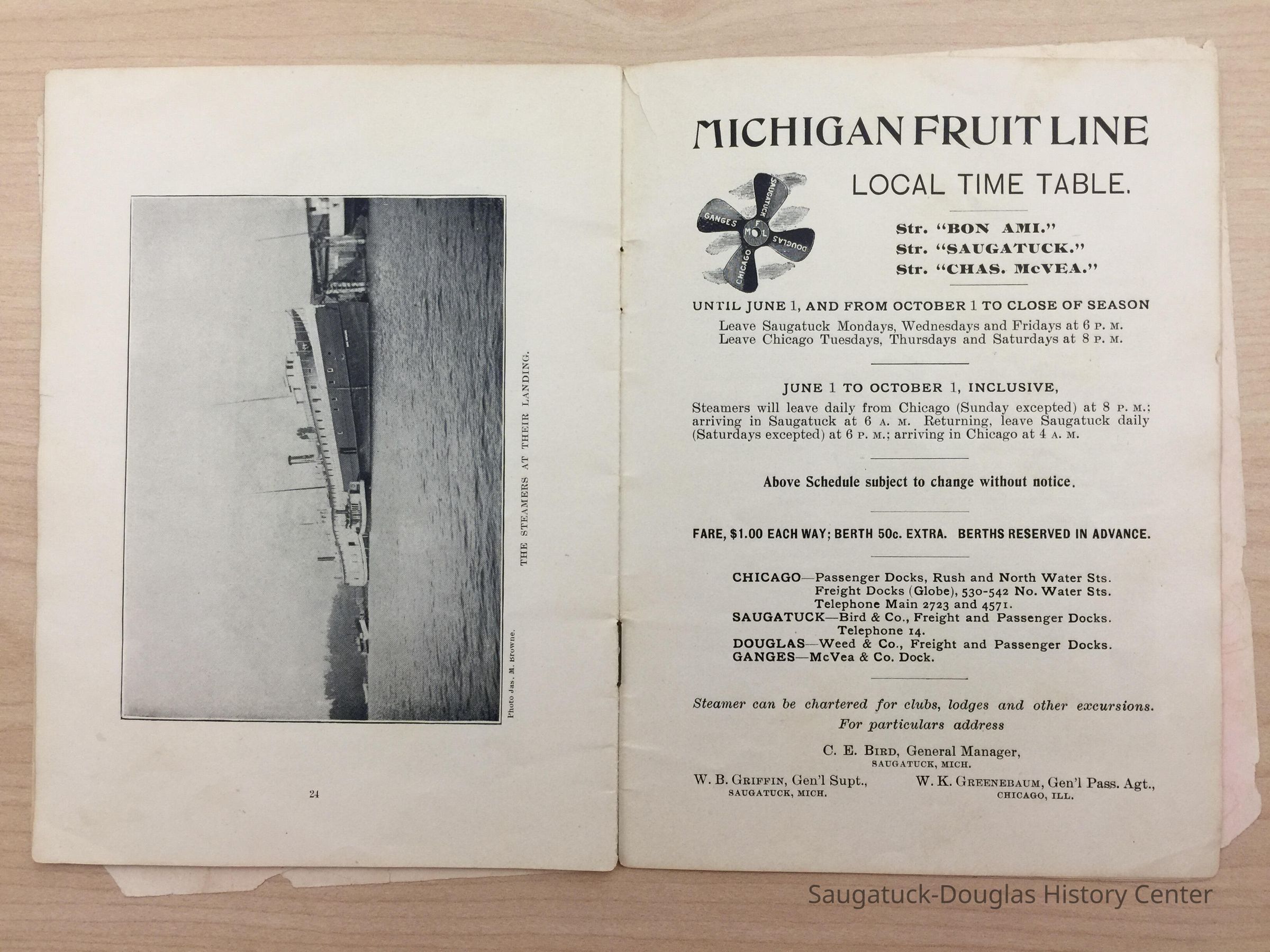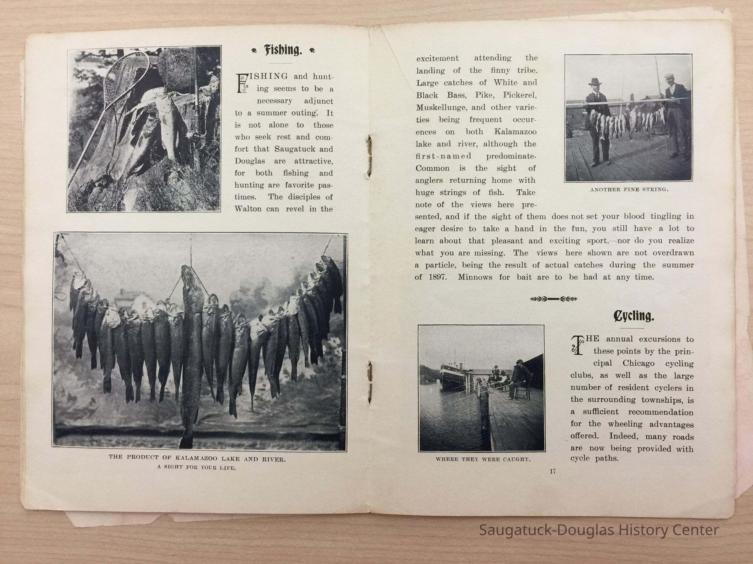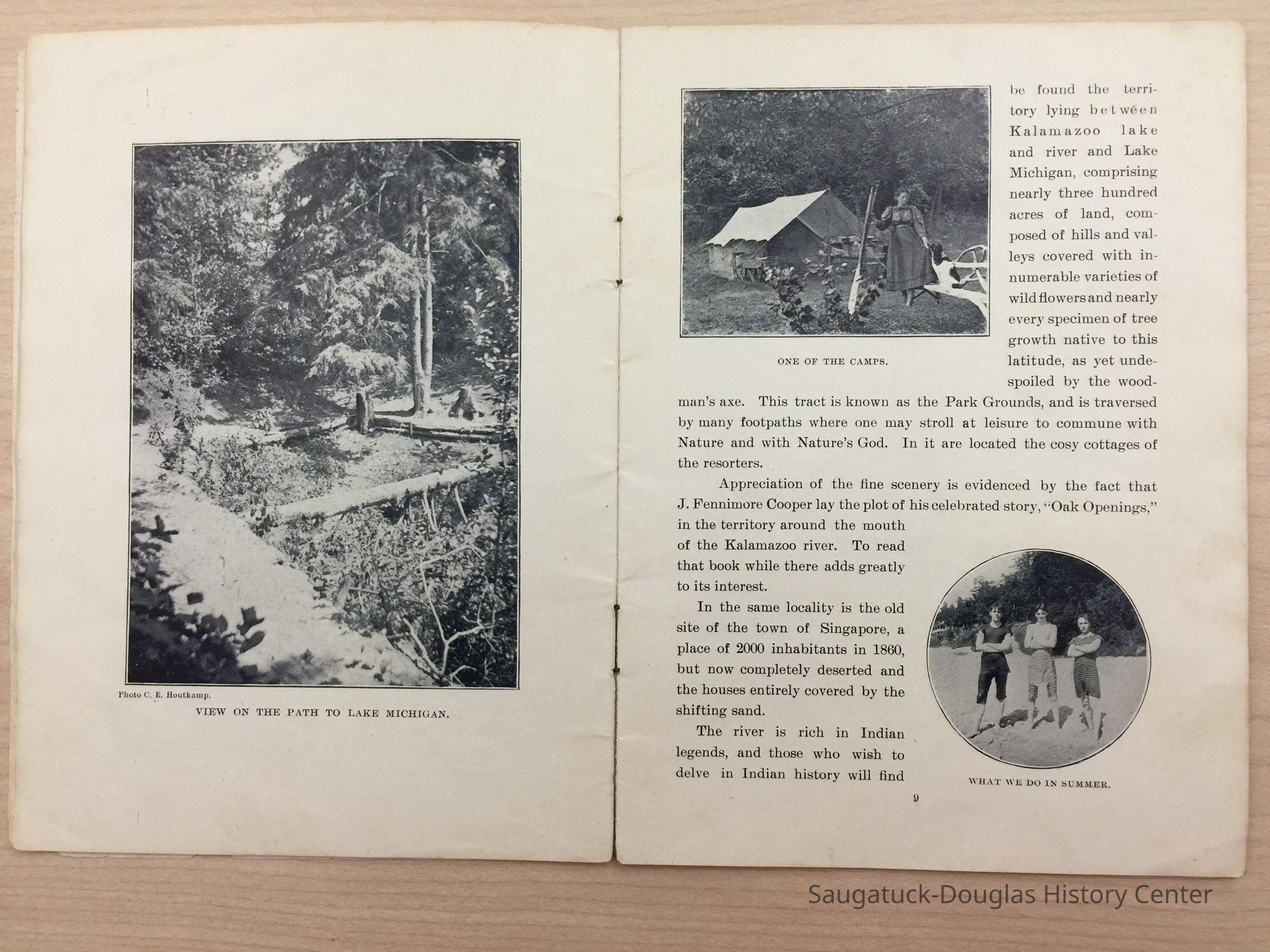 An advertising booklet promoting the Saugatuck-Douglas-Pier Cove area in 1898 for the Michigan Fruit Line Shipping Company. Includes descriptions of natural areas and how this can be an ideal vacation destination. The local time table for steamers appears on page 25. Includes advertisements from various Saugatuck area businesses. b&w photos.