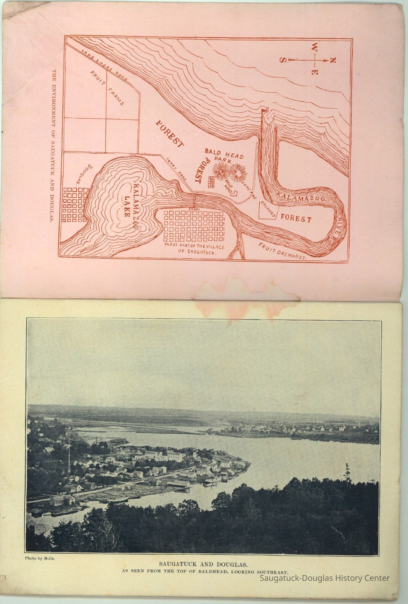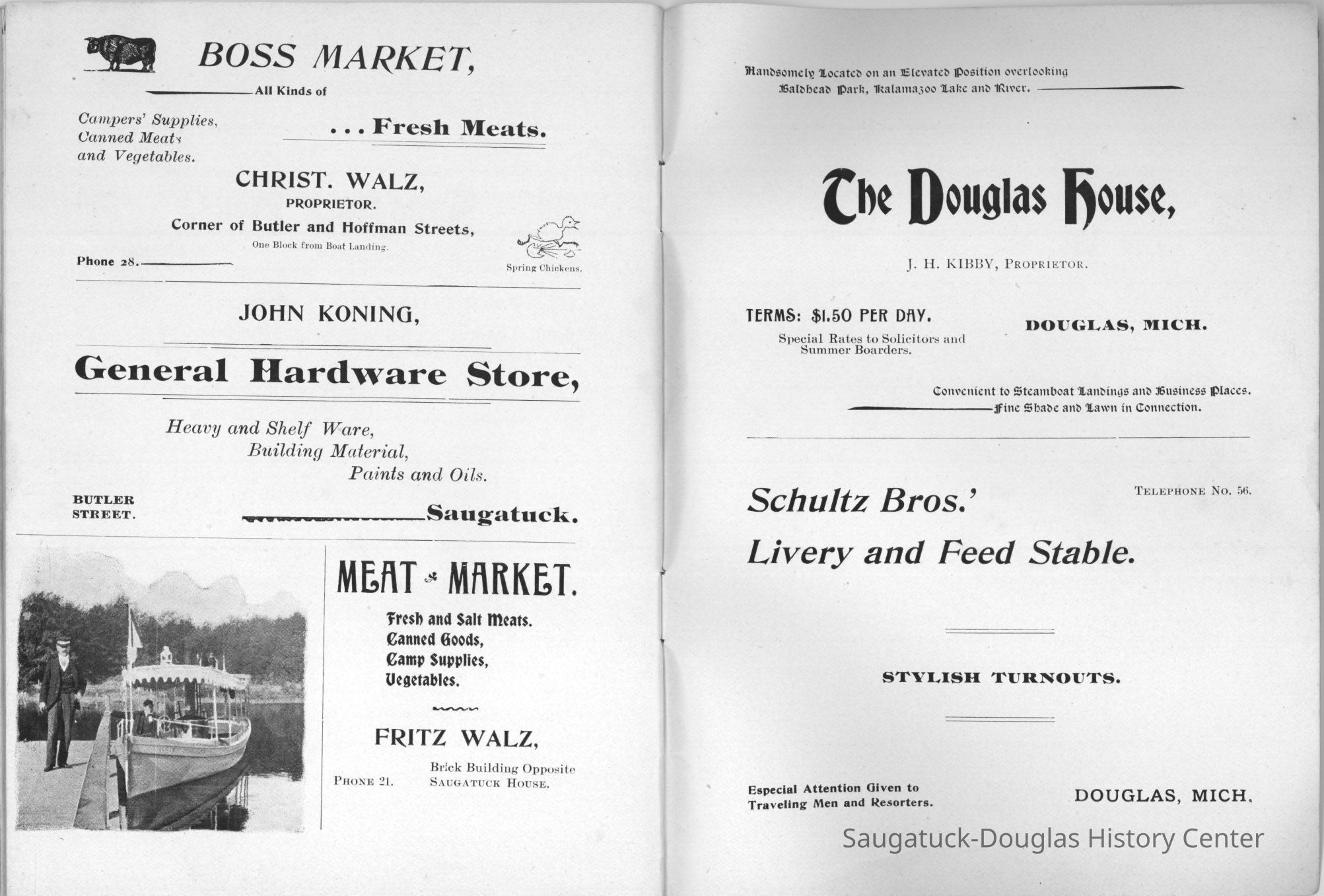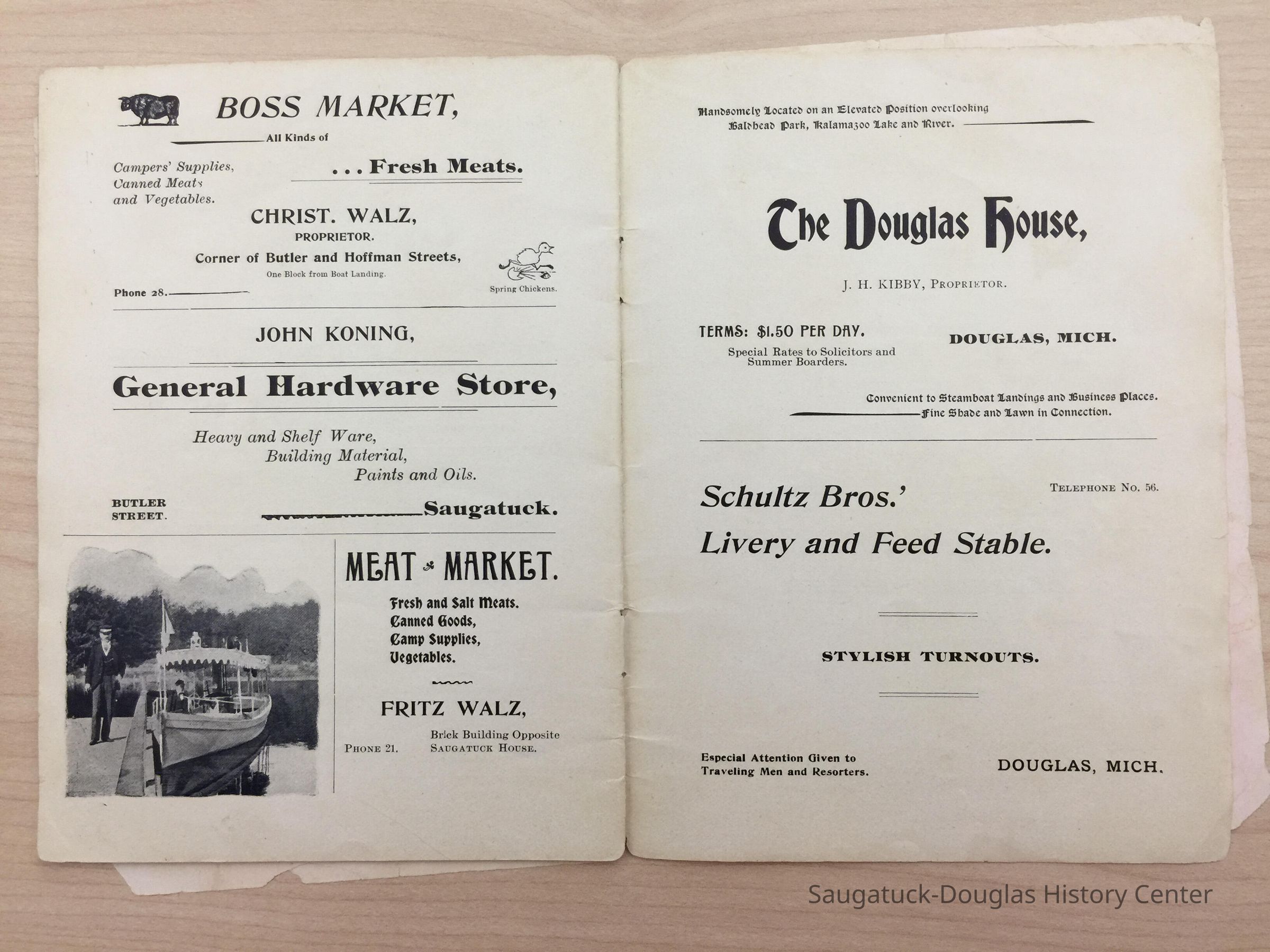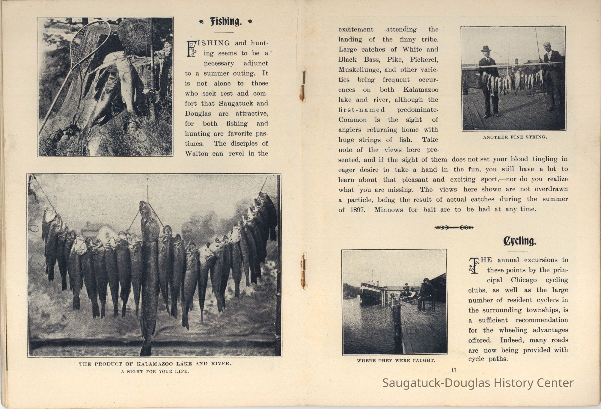 An advertising booklet promoting the Saugatuck-Douglas-Pier Cove area in 1898 for the Michigan Fruit Line Shipping Company. Includes descriptions of natural areas and how this can be an ideal vacation destination. The local time table for steamers appears on page 25. Includes advertisements from various Saugatuck area businesses. b&w photos.