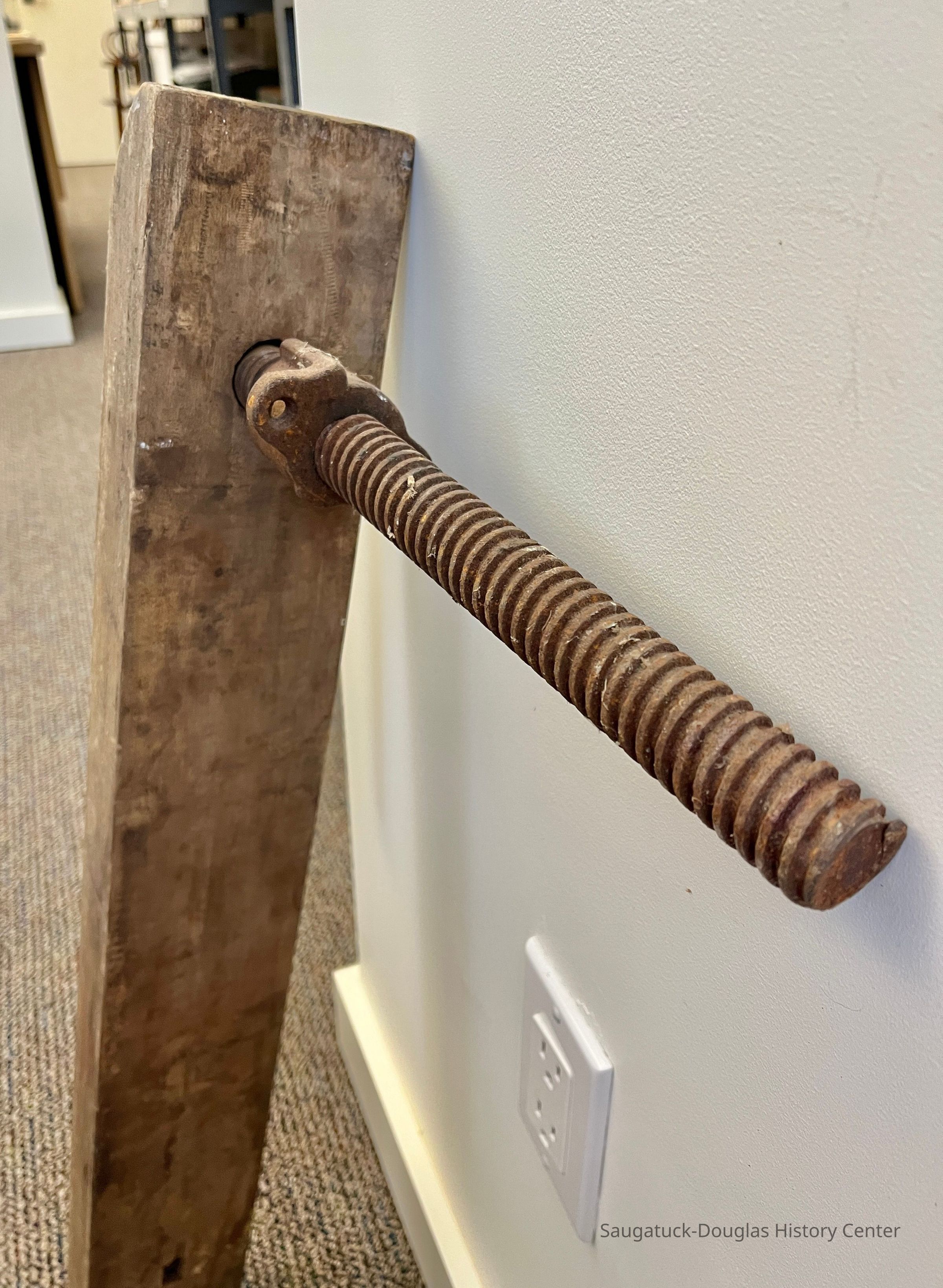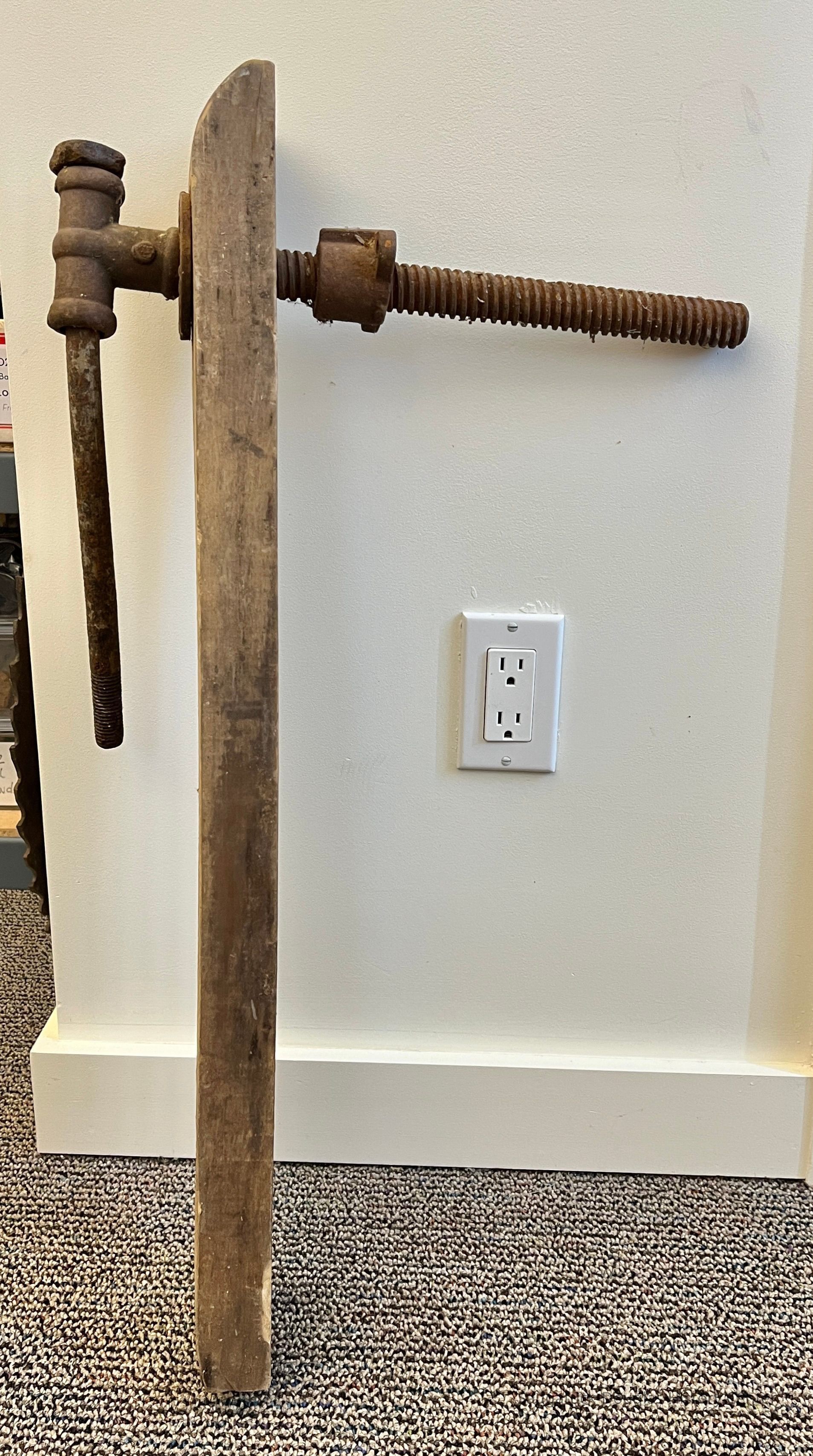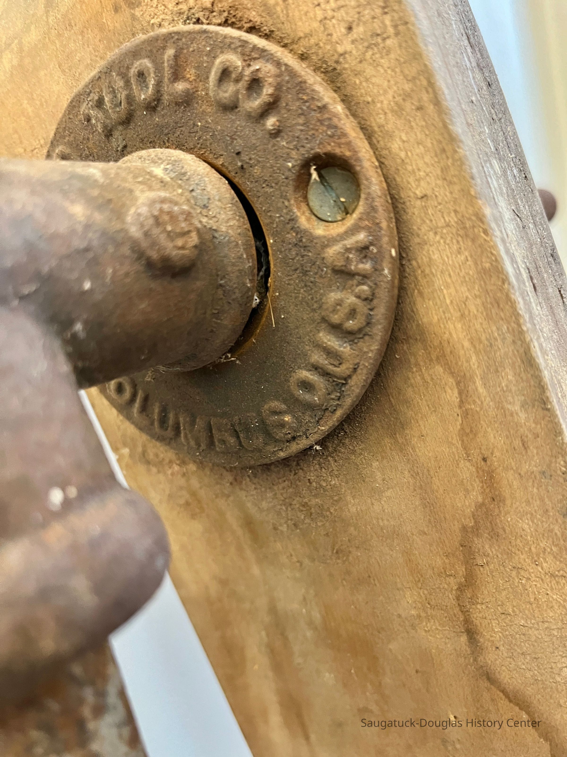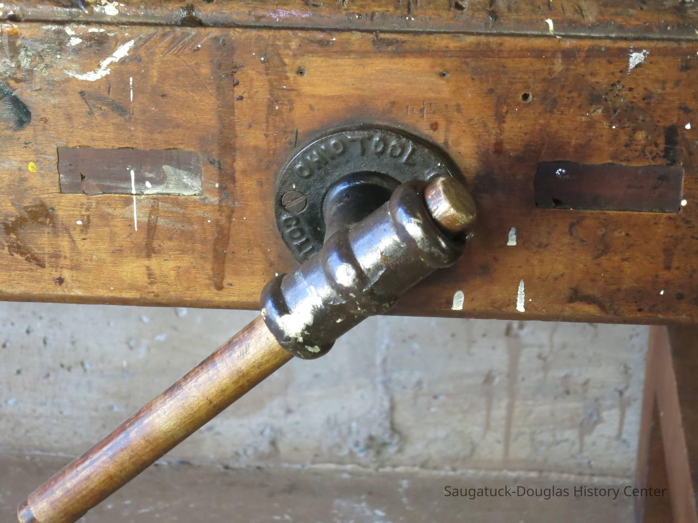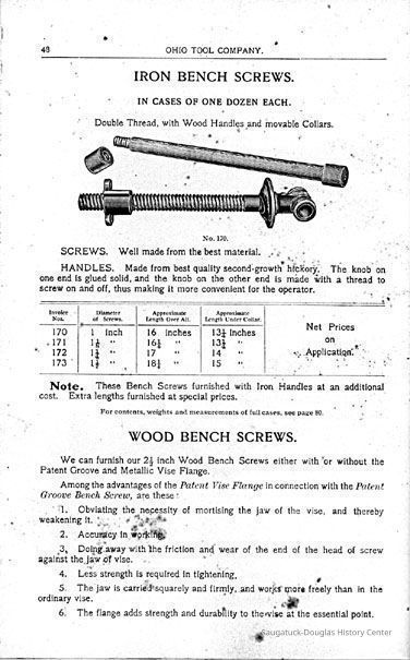 Metal bench screw from a vice, clamp or workbench manufactured by the Ohio Tool Company of Columbus, Ohio, U.S.A. The metal handle is bent. The name of the manufacturer is raised on the tool's flange.Context