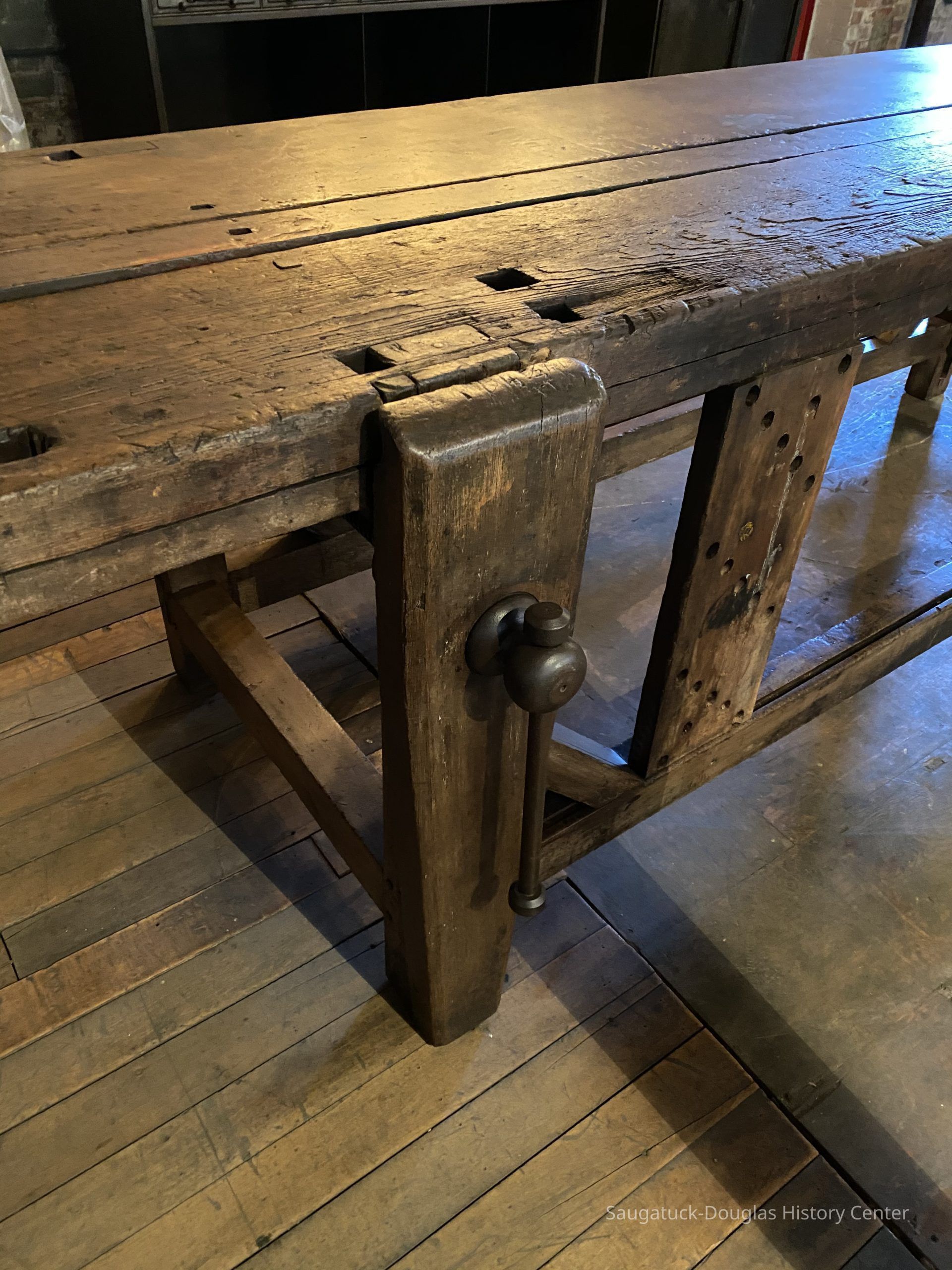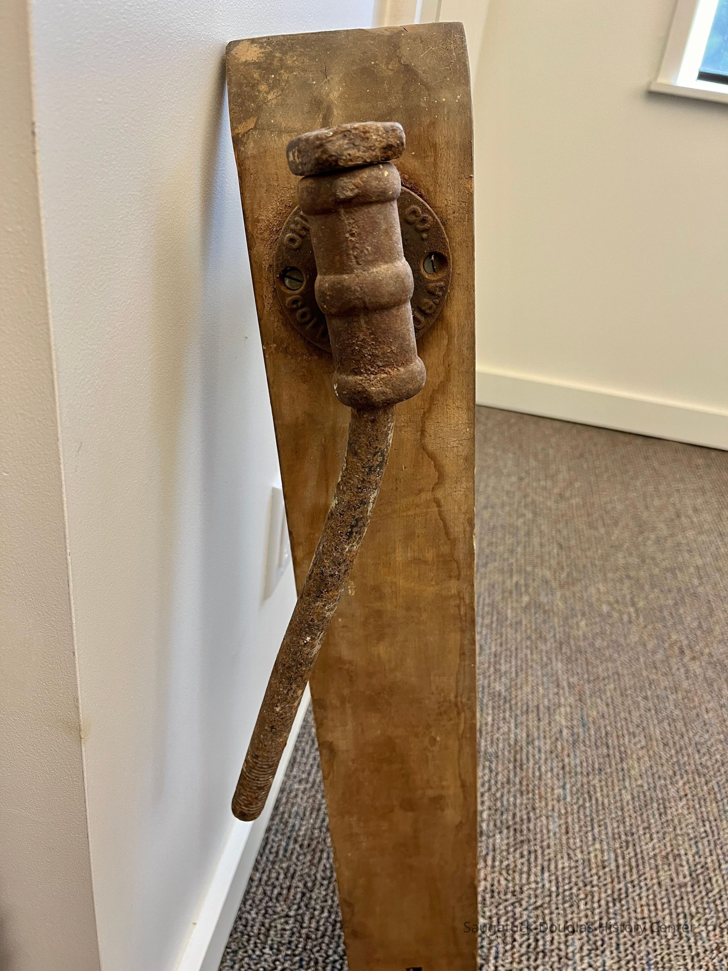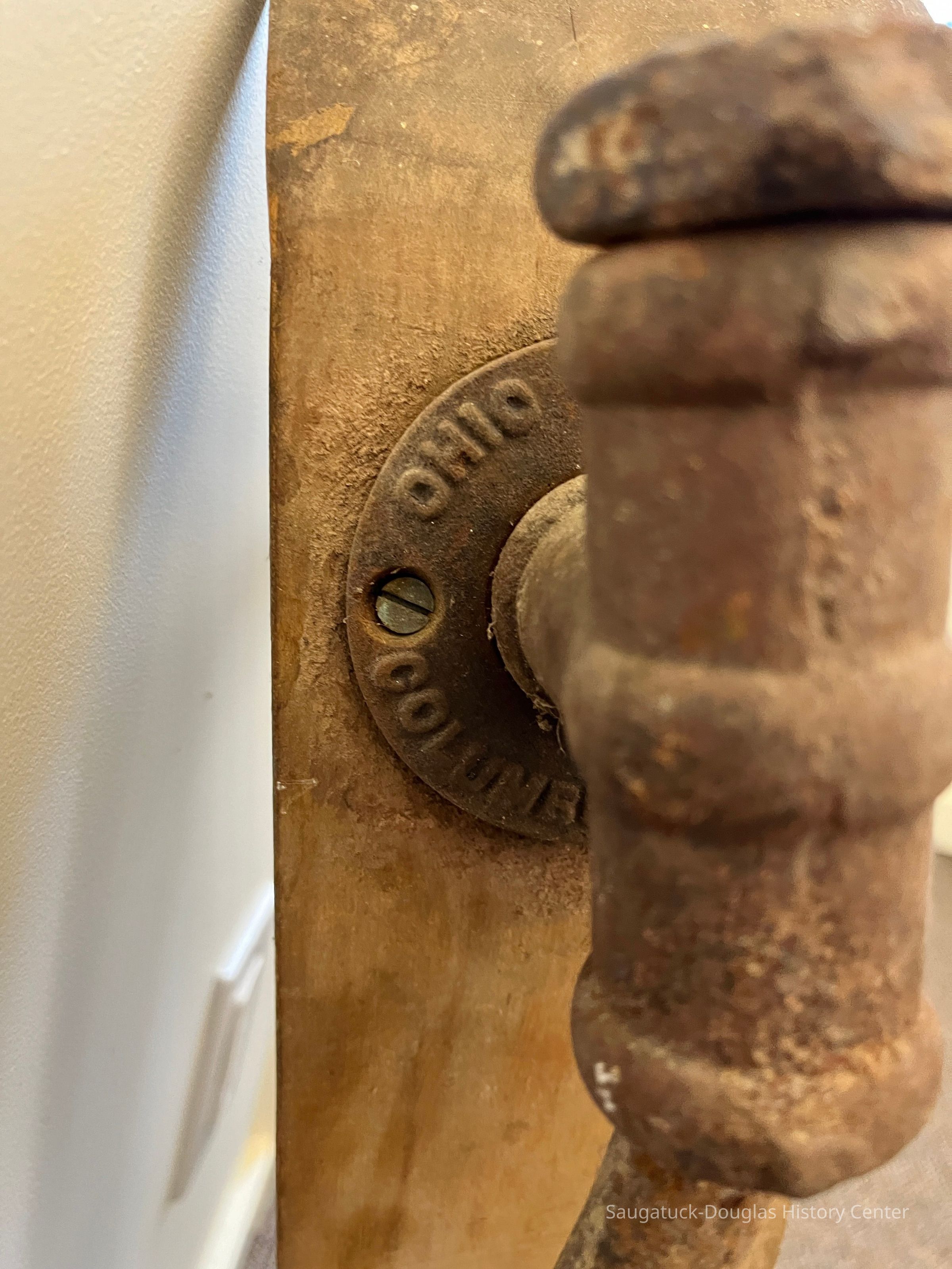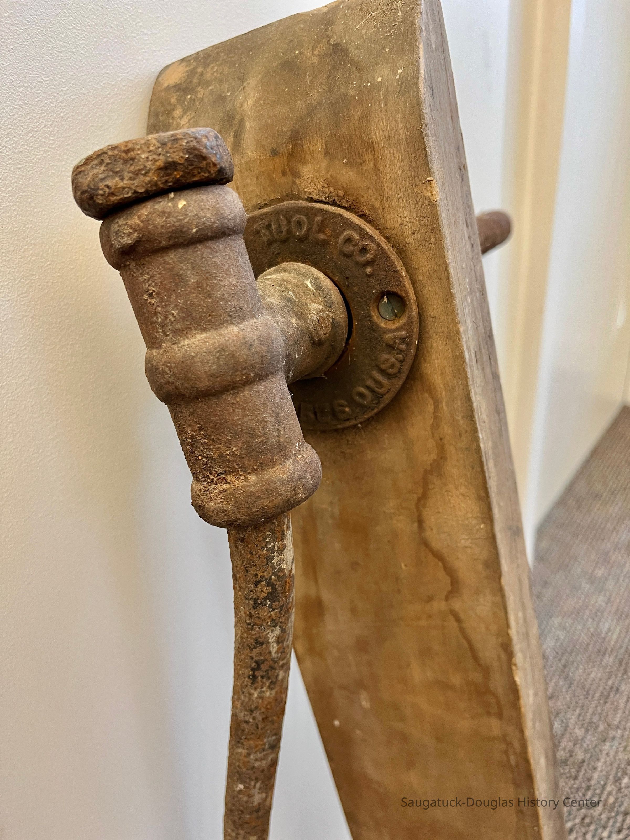 Metal bench screw from a vice, clamp or workbench manufactured by the Ohio Tool Company of Columbus, Ohio, U.S.A. The metal handle is bent. The name of the manufacturer is raised on the tool's flange.Context