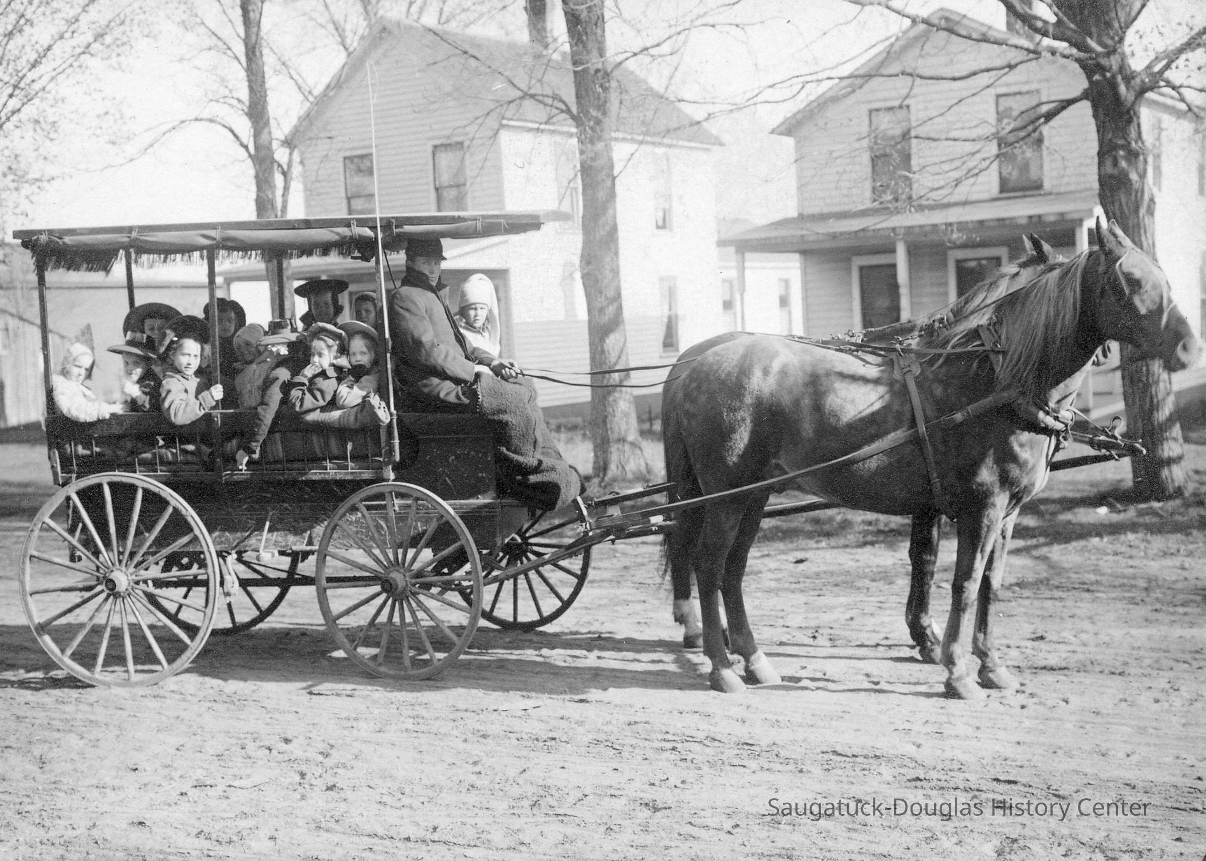An canopied carriage, hitched to two horses, is loaded with at least 11 children and a man, the driver, who has a blanket over his legs.
