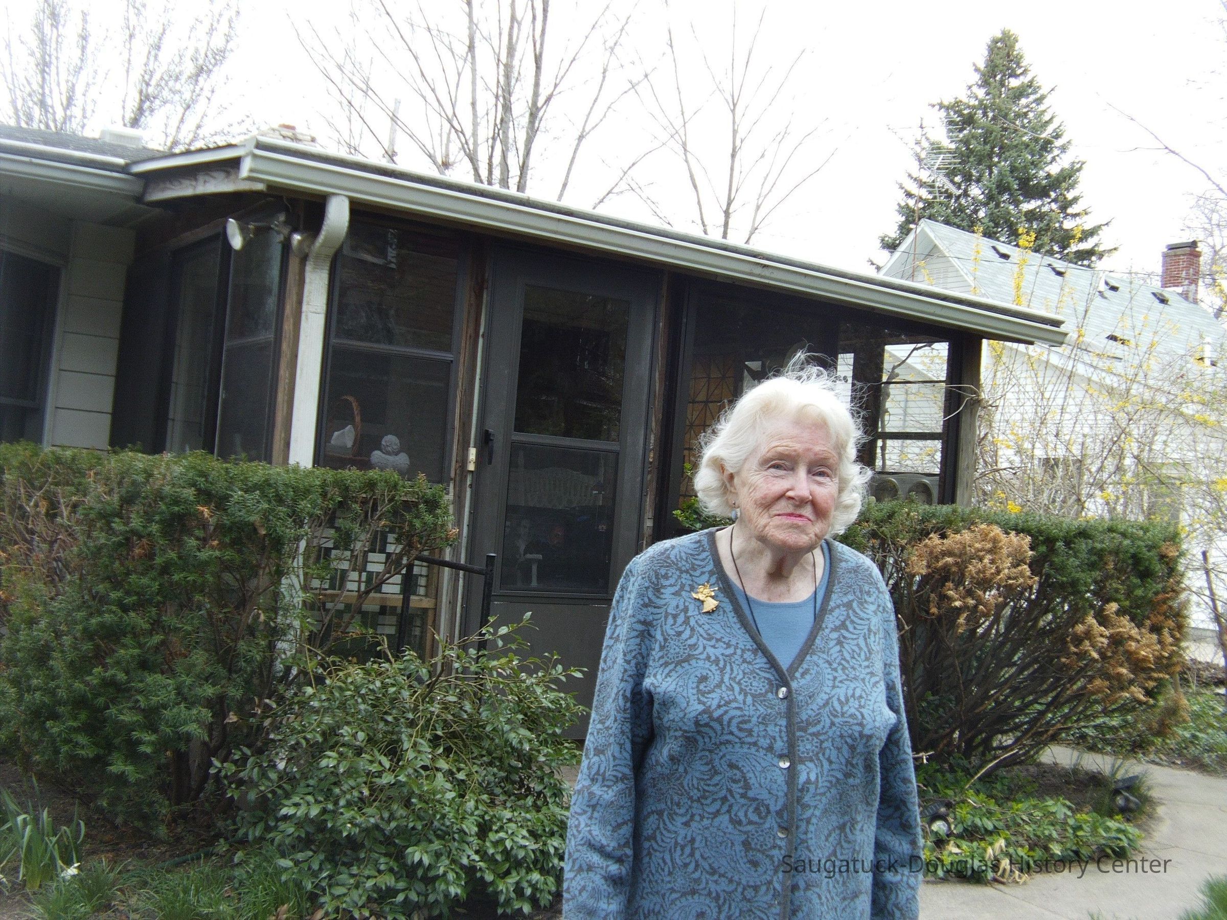 Betty shared stories about her first 12 years in the South Shore area of Chicago and she noted numerous Saugatuck and Douglas residents who originated from that area. As a child she spent summers with her grandparents on a large tract of land on the South side of Lucy Street between Butler and Holland streets. Her home was the oldest, having been brought from Singapore ahead of the encroaching dunes. The earliest memories of summers in Saugatuck that Betty recalled were of hikes over Mt. Baldhead to Oval Beach with friends, working at the soda lounge, and nightly movies at the Pavilion.