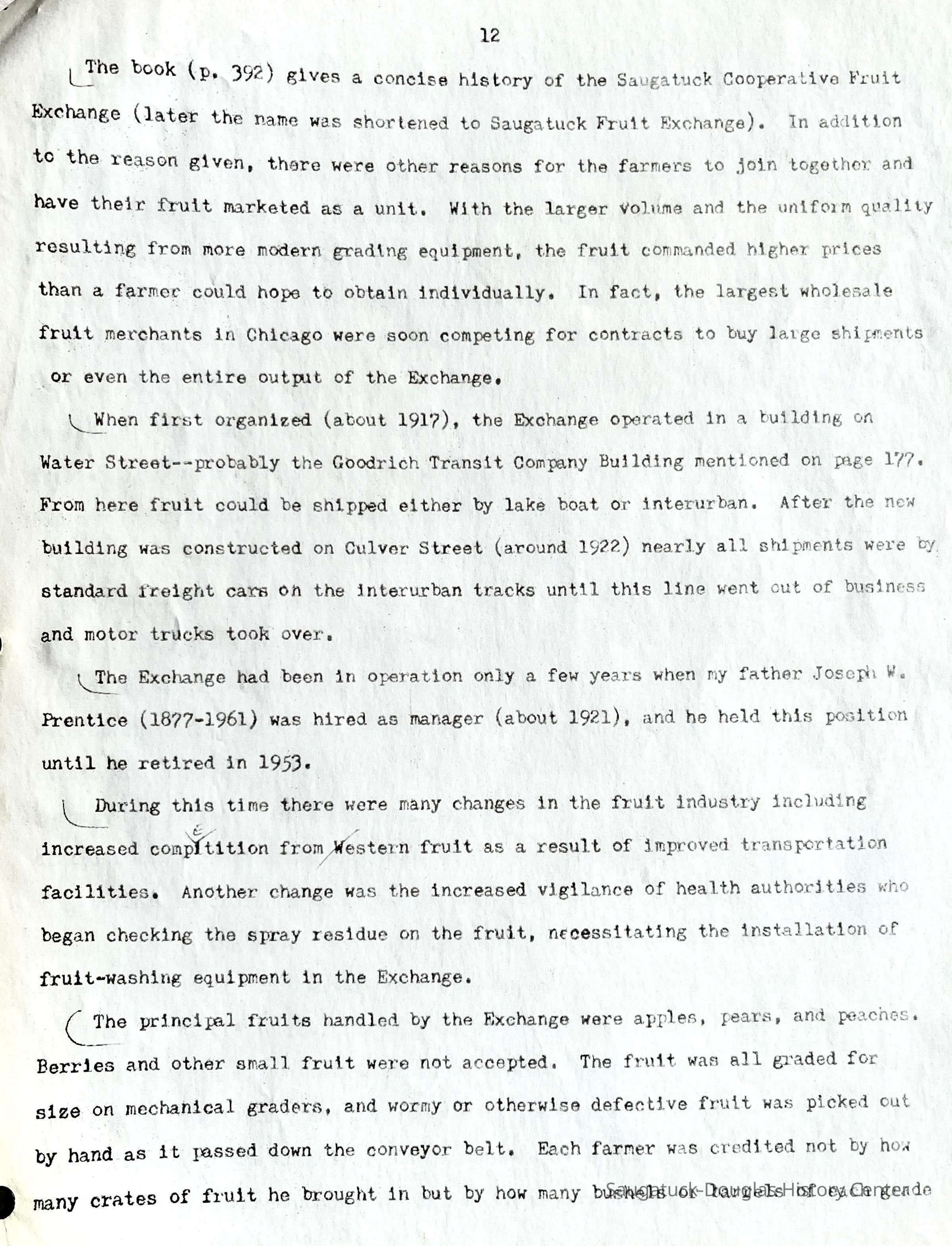The book (p. 392) gives a concise history of the Saugatuck Cooperative Fruit Exchange (later the name was shortened to Saugatuck Fruit Exchange). In addition to the reason given, there were other reasons for the farmers to join together and have their fruit marketed as a unit. With the larger volume and the uniform quality resulting from more modern grading equipment, the fruit commanded higher prices than a farmer could hope to obtain individually. In fact, the largest wholesale fruit merchants in Chicago were soon competing for contracts to buy large shipments or even the entire output of the Exchange.