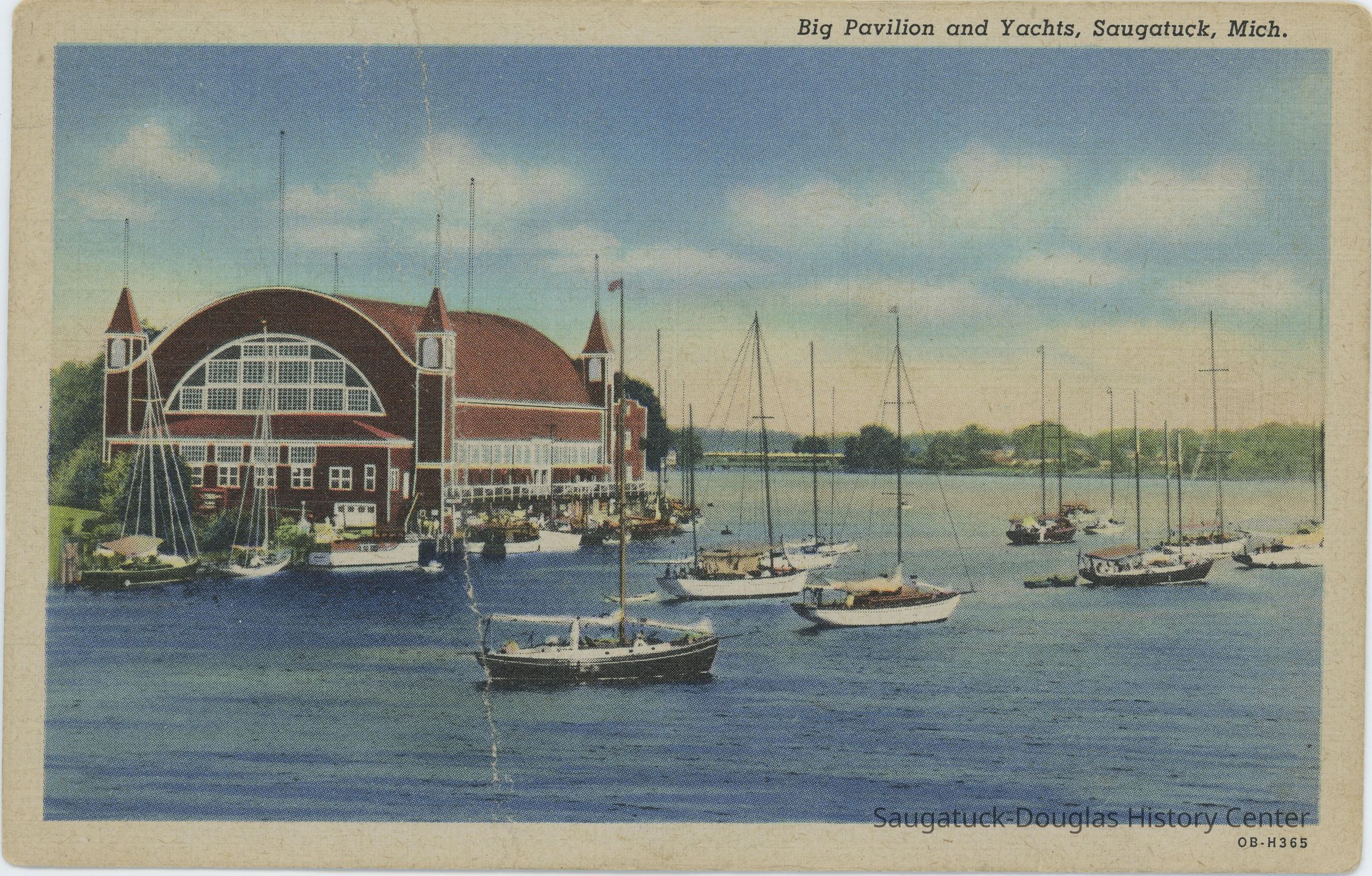 A color postcard showing the Big Pavilion from across the Kalamazoo River. Several yachts float out front with an equal number docked by the building.Subject