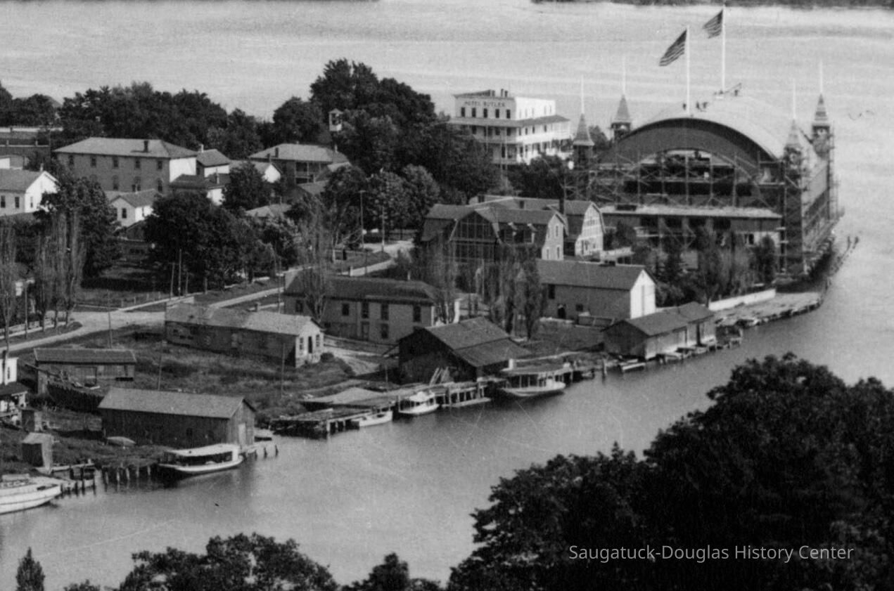 The historical tale of the Pavilion is best understood by recounting changes that occurred in the area. By 1905, lumbering, tanning, ship building and fruit growing had peaked and were going-going-almost gone. But the beautiful and glorious Saugatuck location on river and lake -—a quick boat ride from burgeoning Chicago—were newly discovered and appreciated. Saugatuck sported a new municipal water system and electricity was just around the corner. The interurban brought visitors from the north and east. The new Leiendecker Inn and the Butler Hotel graced the waterfront. Opportunity was a knocking.