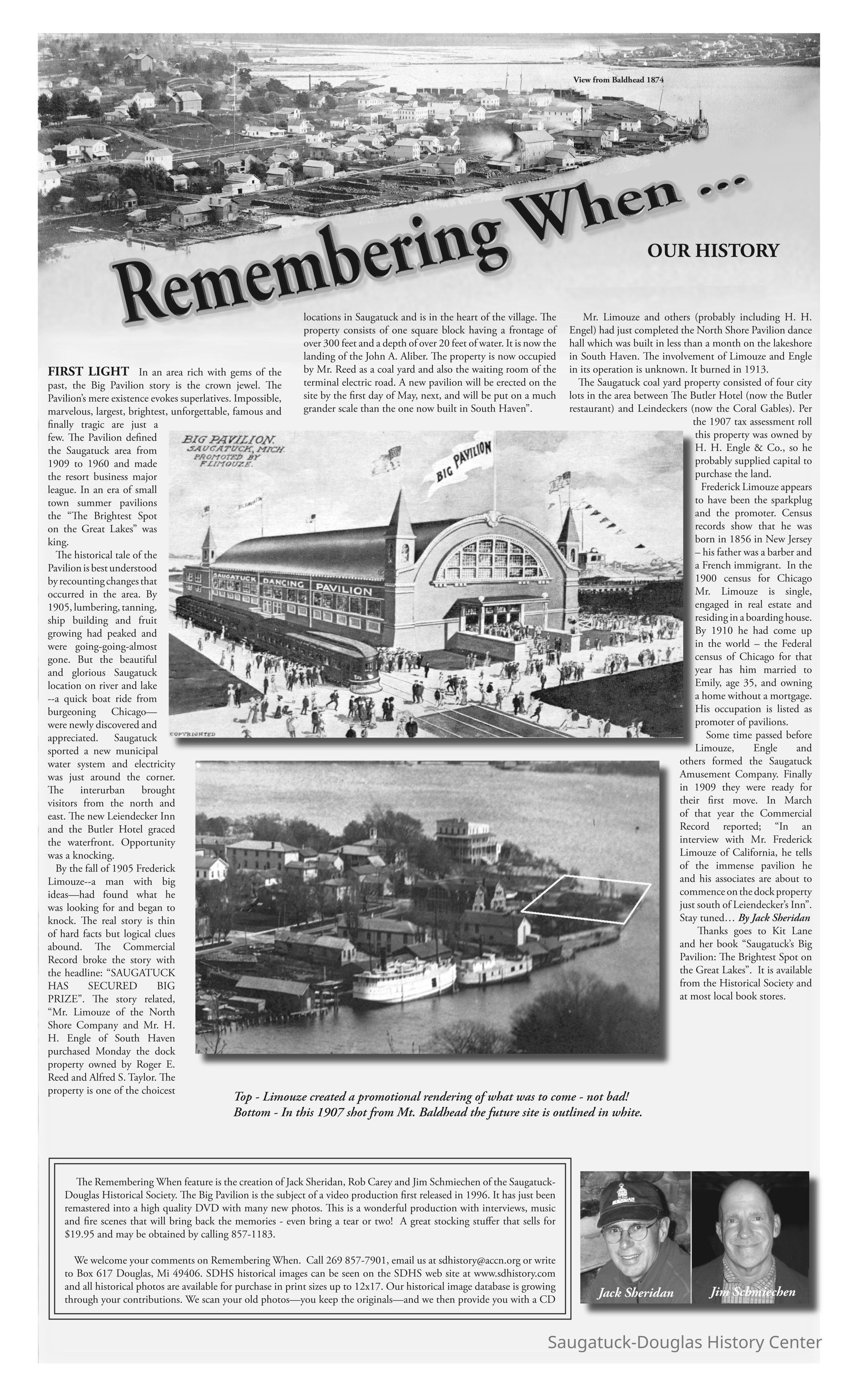 John A. Aliber (boat) 1897-c1927, Engle, H.H., Sheridan, John "Jack" O. 1938-, Taylor, Alfred S., Reed, Roger E. 1868-1946, Limouze, Frederick 1856-, Interurban Railroad 1899-1927, Schmiechen, James A., Saugatuck Amusement Company [operated the Big Pavilion], 220 Water/Coral Gables/Hotel Saugatuck/Columbia Hotel/Leiendecker's Inn/Ebmeyer Shingle Mill, Big Pavilion 1909-1960, 40 Butler/Hotel Butler/Grist Mill/Haymarket/Dutch windmillRelated Publications