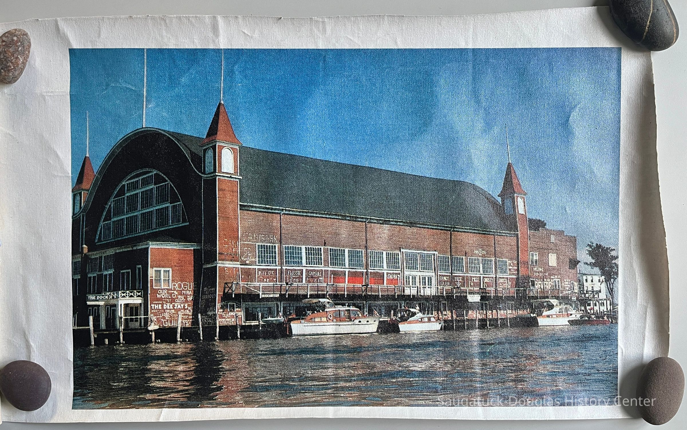 Color photo of the Big Pavilion as seen from the river side with three cruiser boats and boater's graffiti on the building's red siding. The image is printed on canvas but there is not enough of a margin to stretch on a canvas.Collection