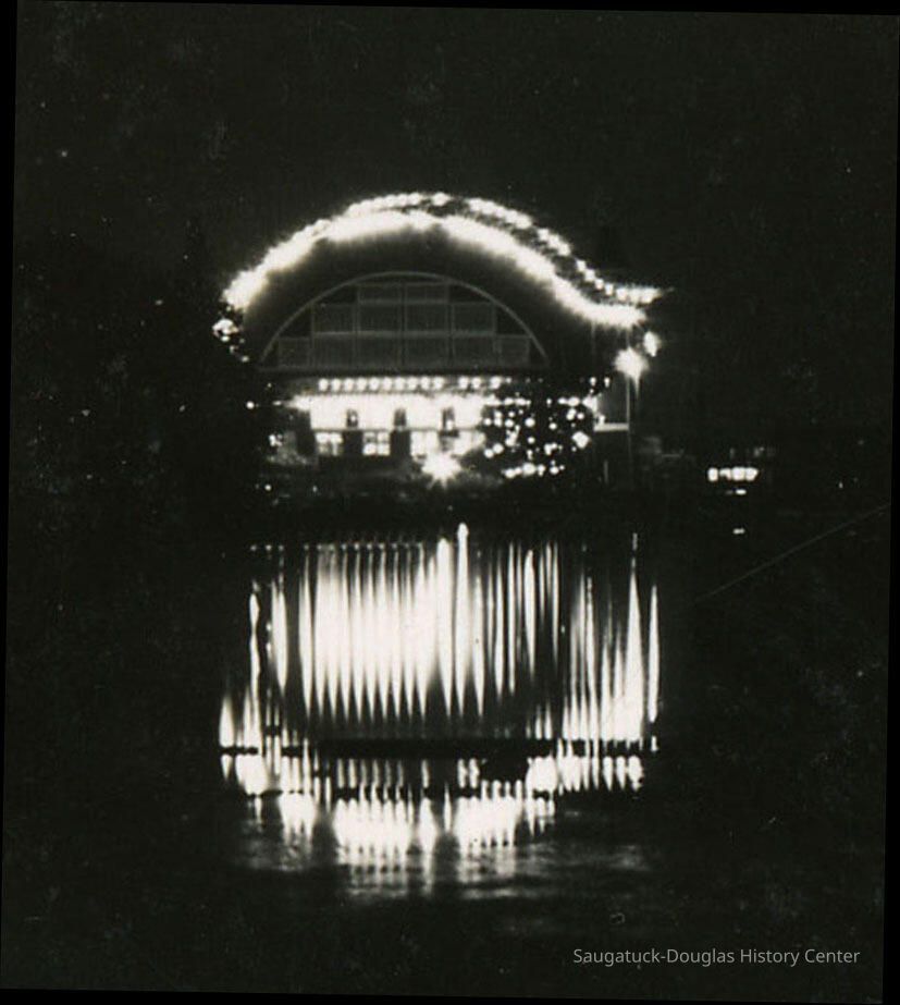 Imagine the shock - standing on the corner of Mason and Water ( try it today--standing in front of Marros)—the view of the country, Douglas and tranquil Kalamazoo Lake had been replaced by a giant red, barrel roofed, dance hall palace, half a block long and with four steeples towering above the tallest trees! Picture 5000 colored lights suddenly lighting up a dark village street in a town that did not yet have electricity! A feast of a scene to say the least.