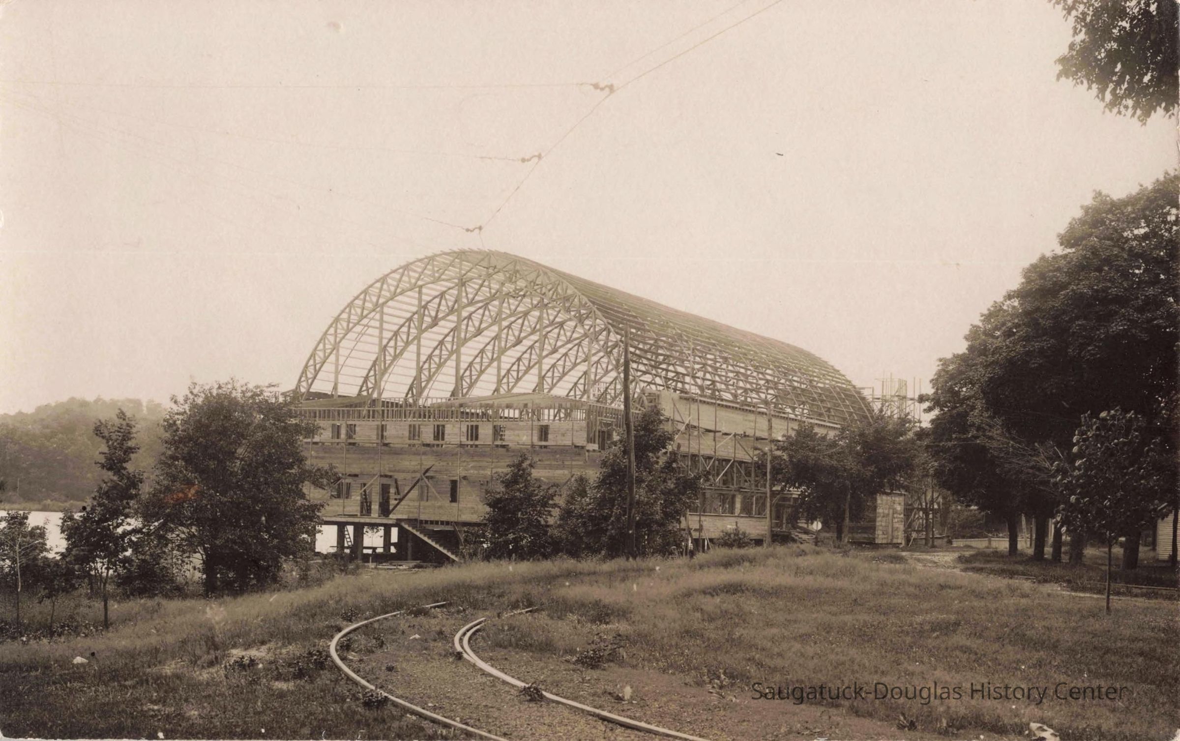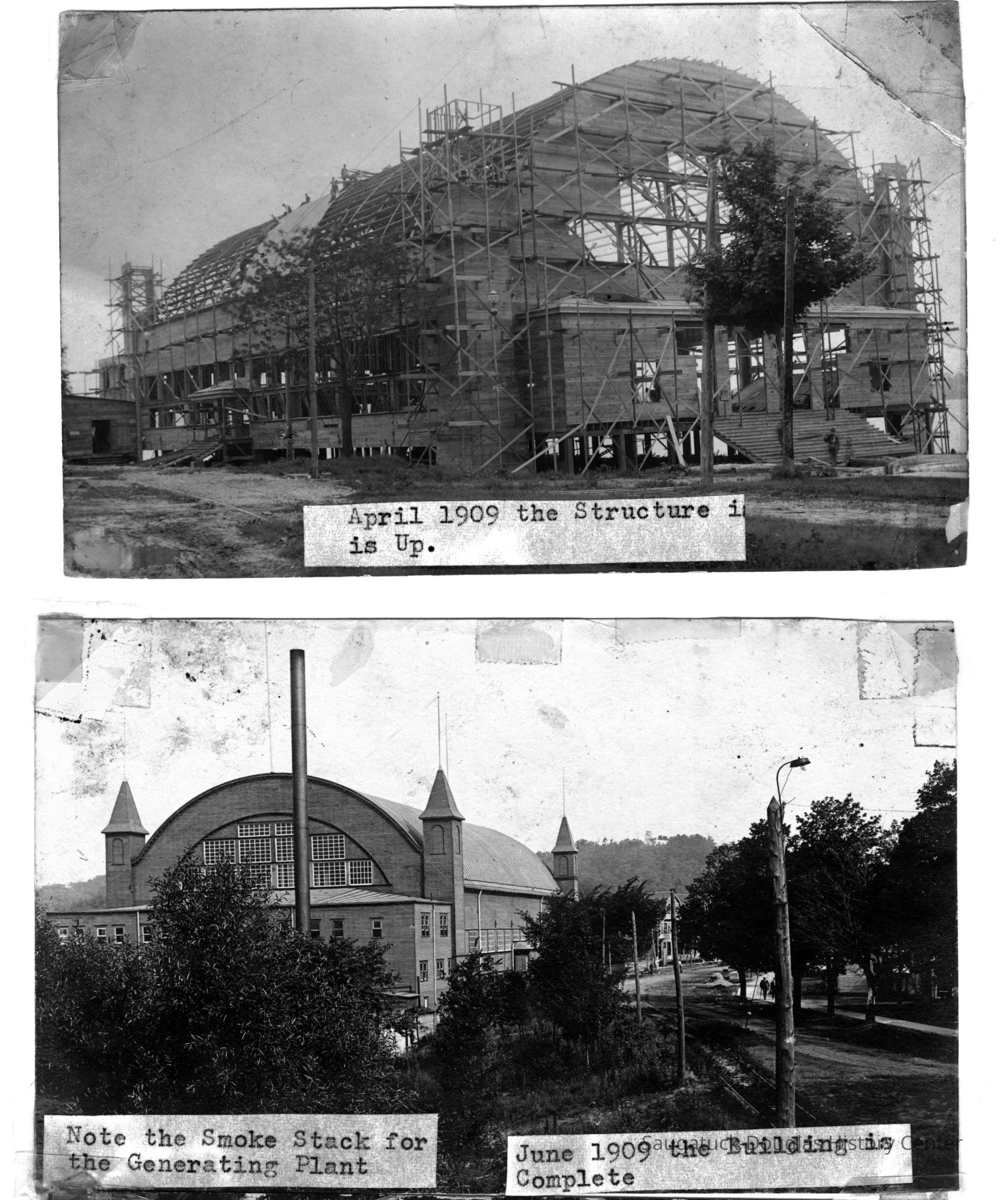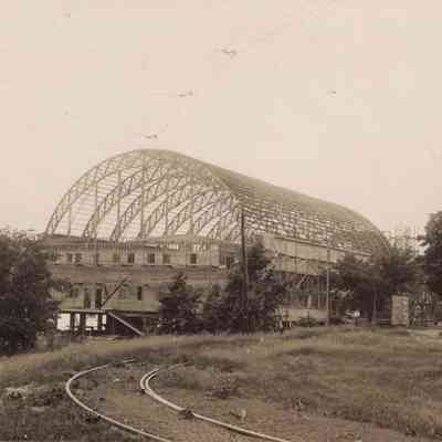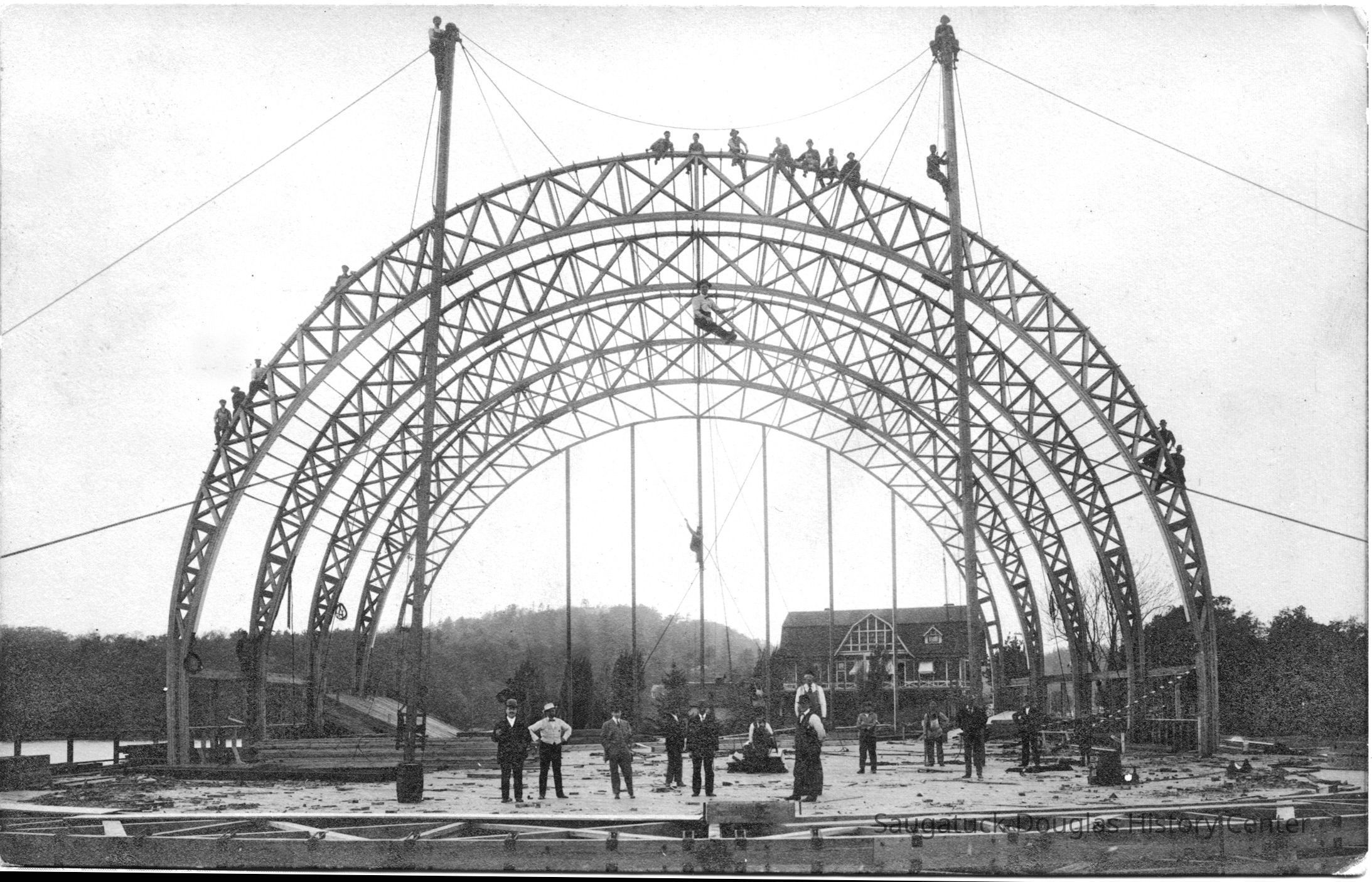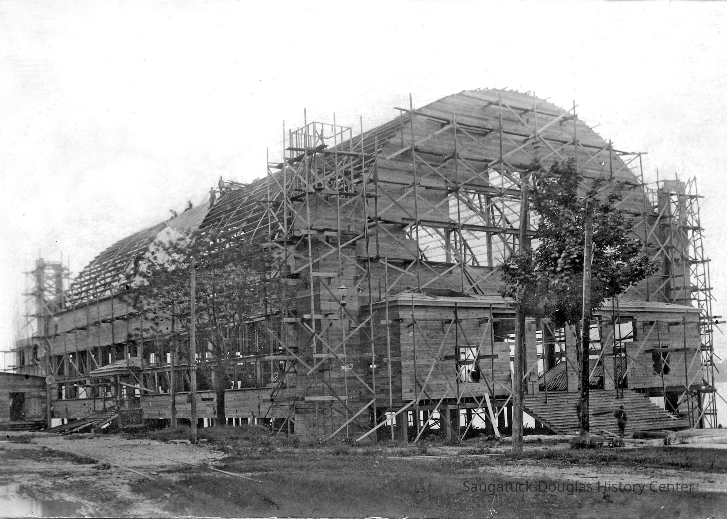 Photos of the construction of the Big Pavilion from the raising of the curved trusses, crisscrossed with X-shaped struts, to the raising of the flags in 1909.Photograph Details