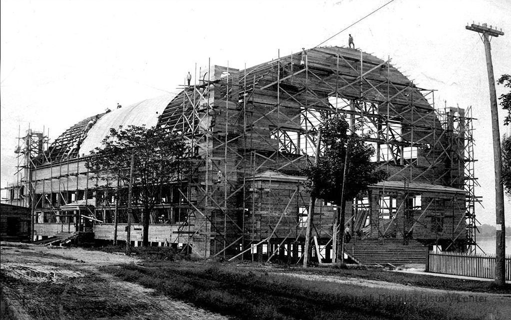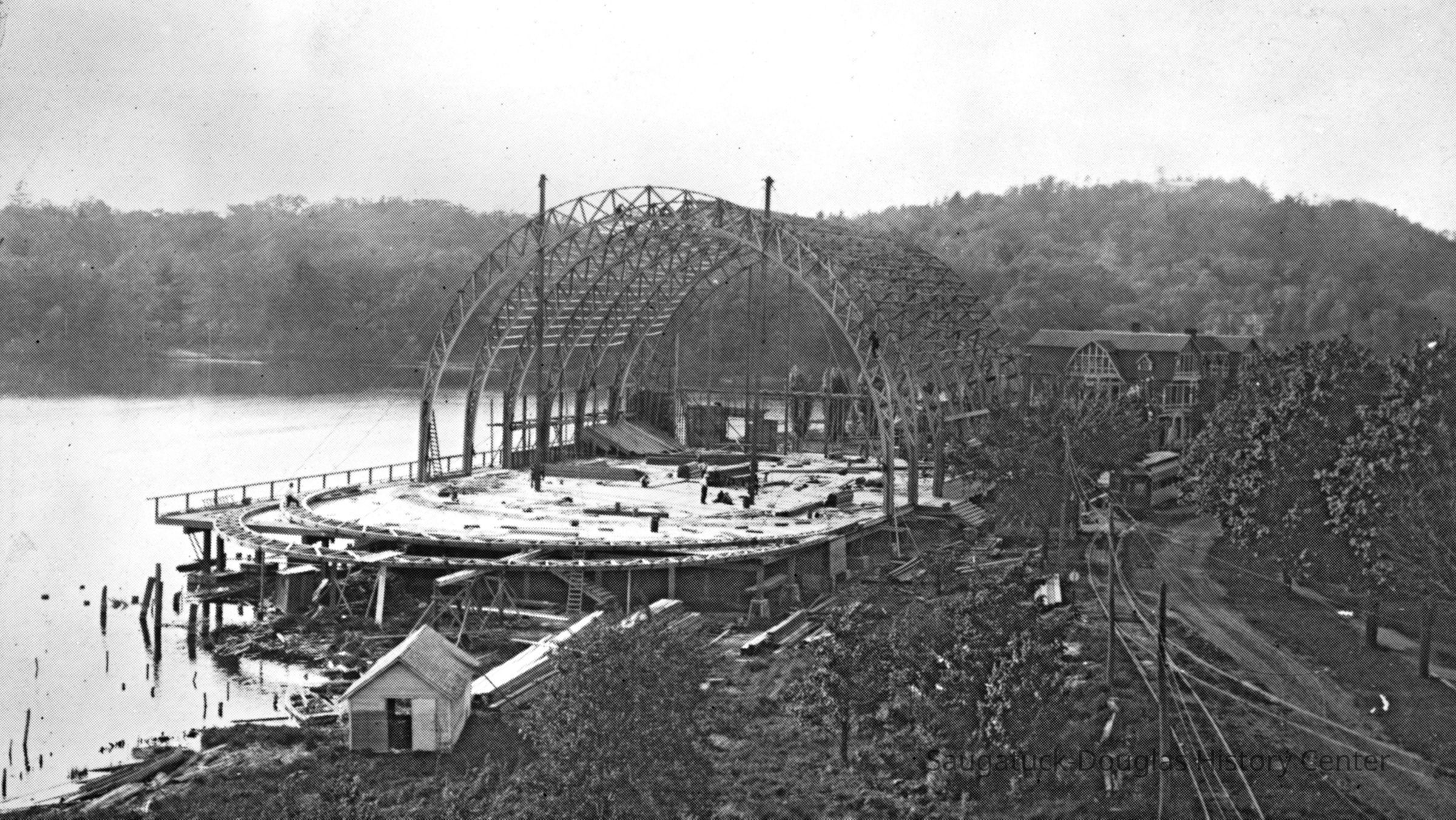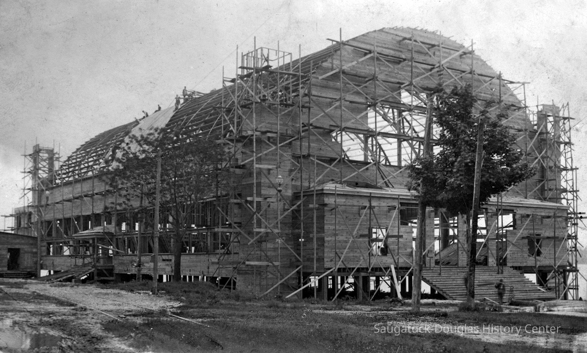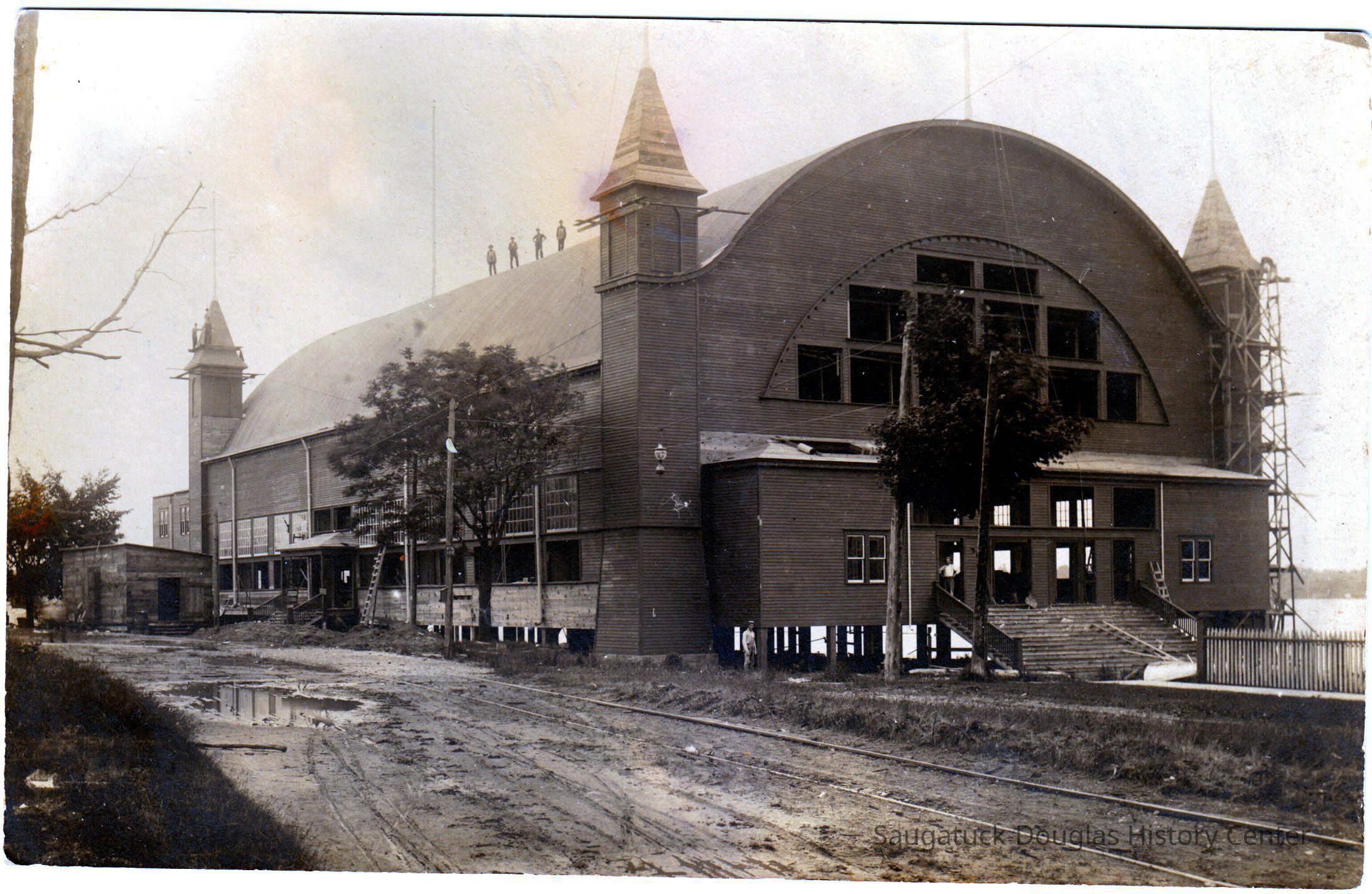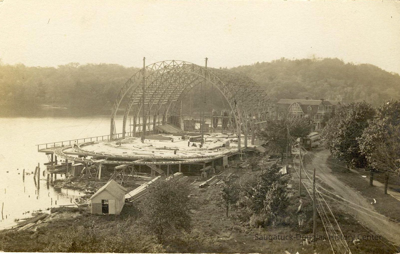 Photos of the construction of the Big Pavilion from the raising of the curved trusses, crisscrossed with X-shaped struts, to the raising of the flags in 1909.Photograph Details
