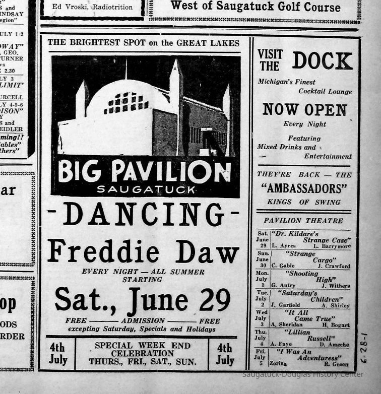 18" w. x 27"h framed Big Pavilion Poster. "Featuring Freddie Daw and his band Big Pavilion Saugatuck, The brightest spot on the Great Lakes Dancing every night all summer beginning Fri. July 3. Free admittance (Except Sat. and Specials.)