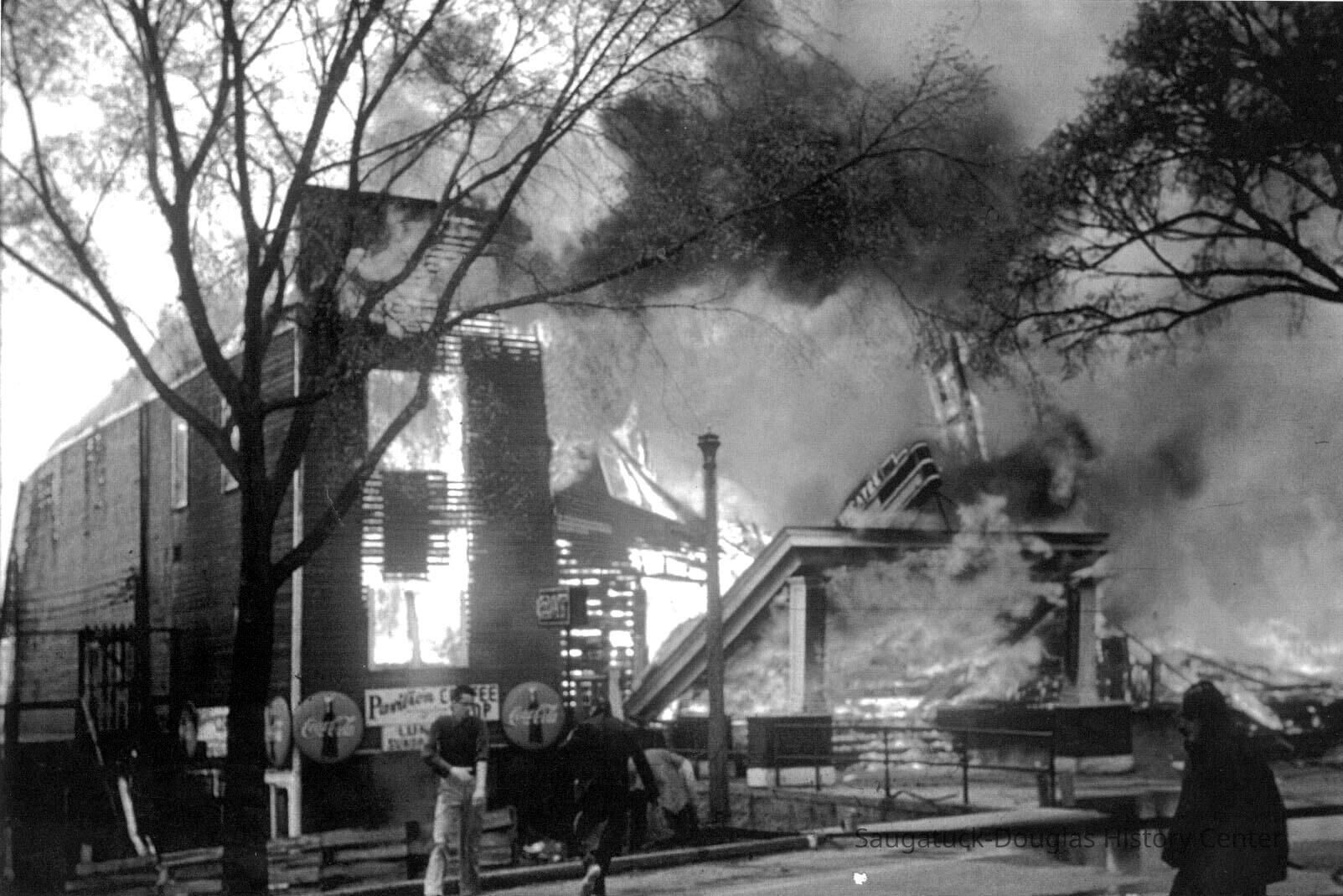 The Big Pavilion had minutes to live. In the Hotel Saugatuck next door, Viola Fox tallying last nights receipts answered the phone. From across the river, the caller could see smoke coming from the building. Vi punched the in-house direct-line alarm button to the Village fire hall. But it was already too late, as fire chief Bill Wilson smashed through the Dock Bar door, flames churned skyward and inky smoke boiled over the eaves of the towering dock-side wall.