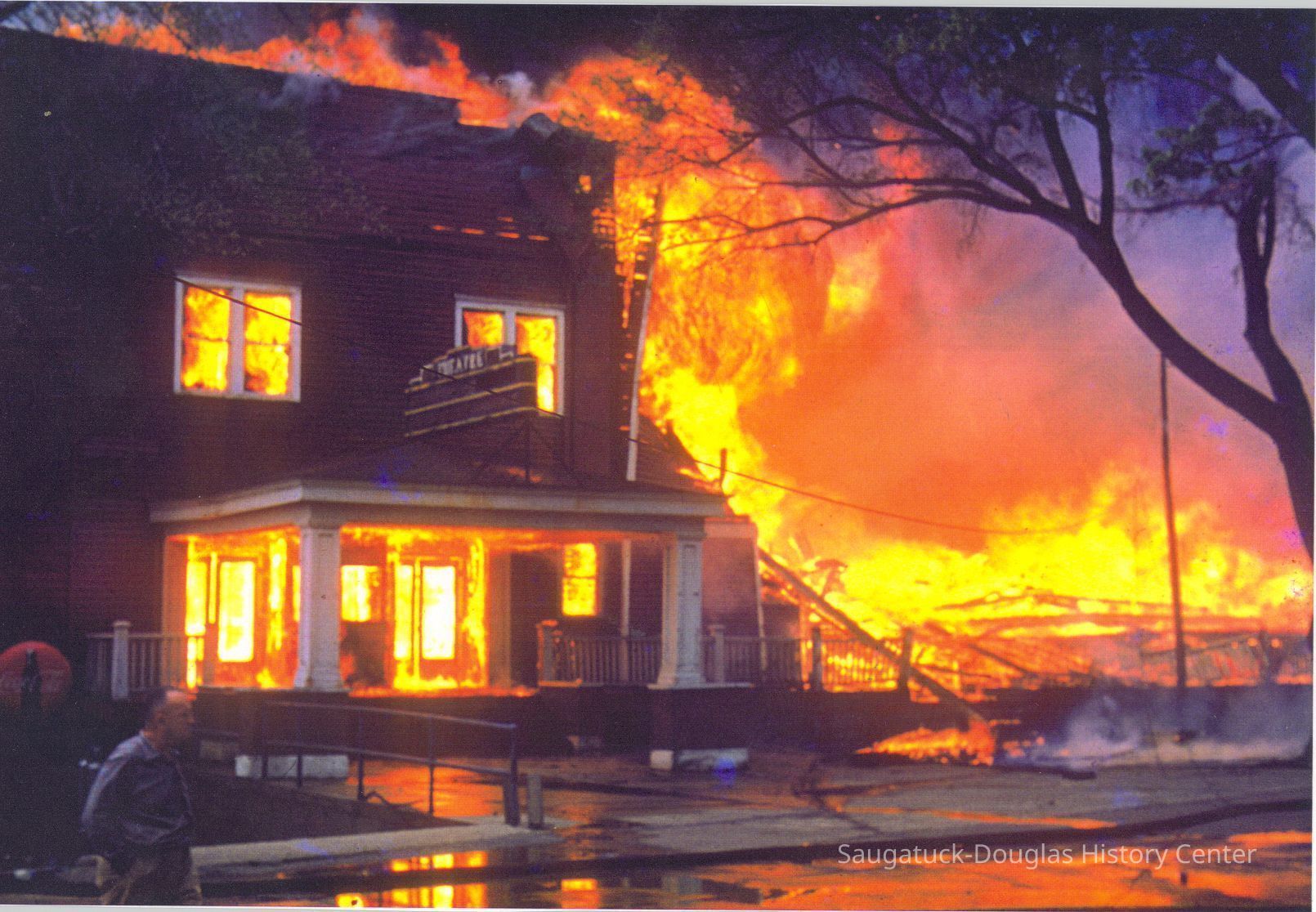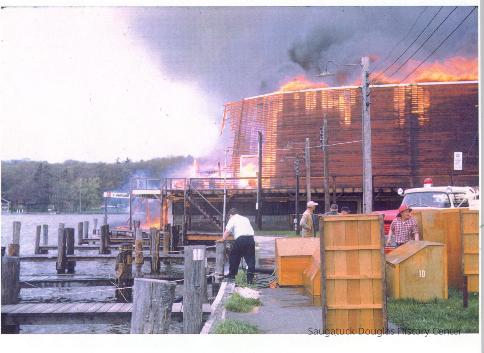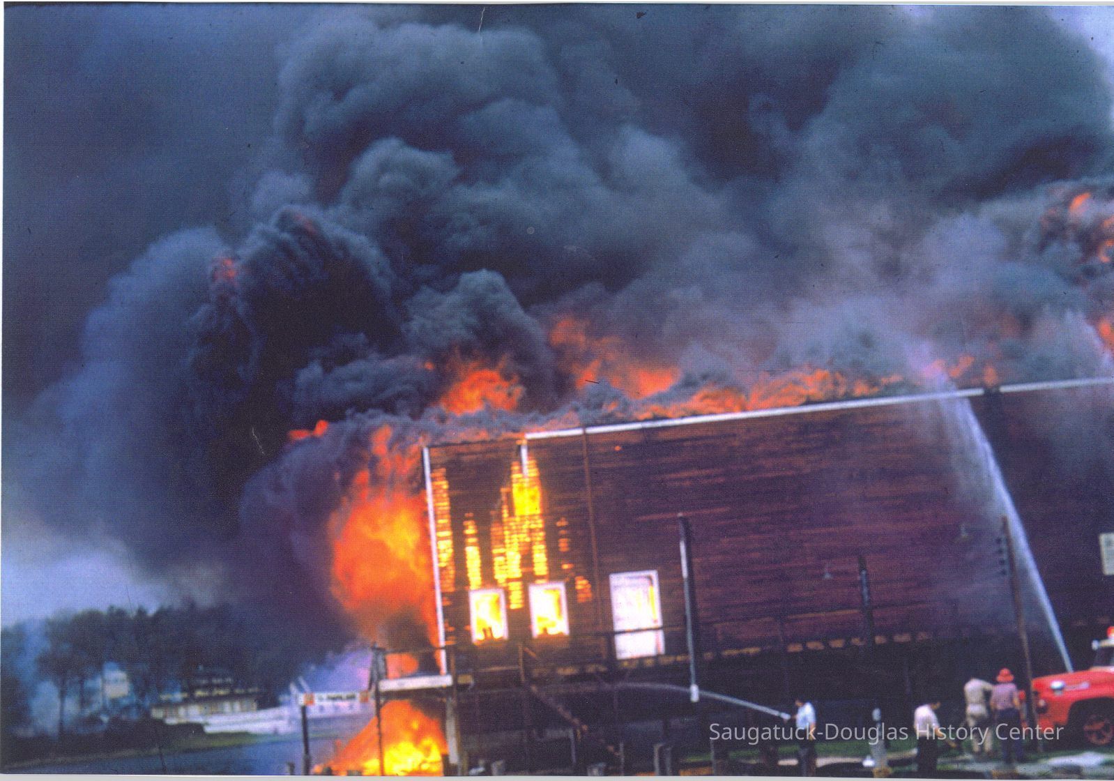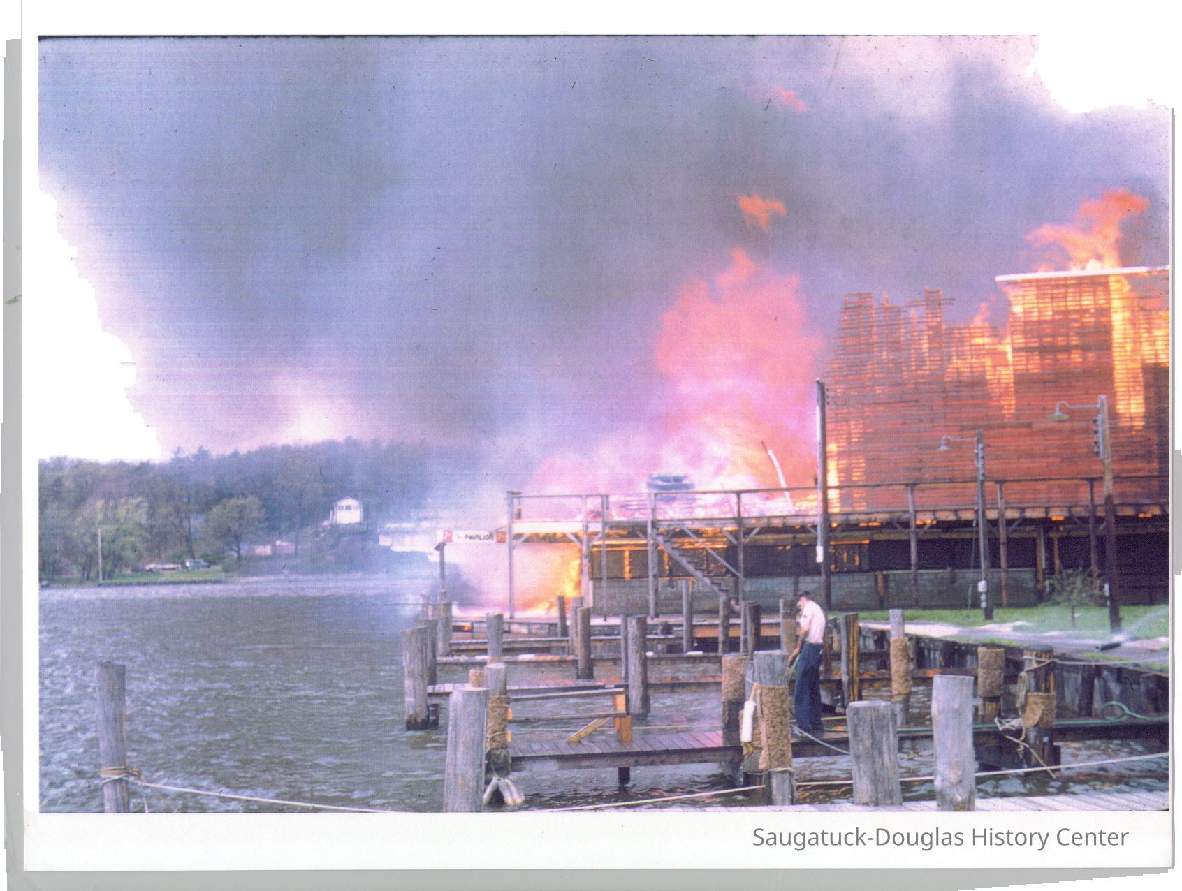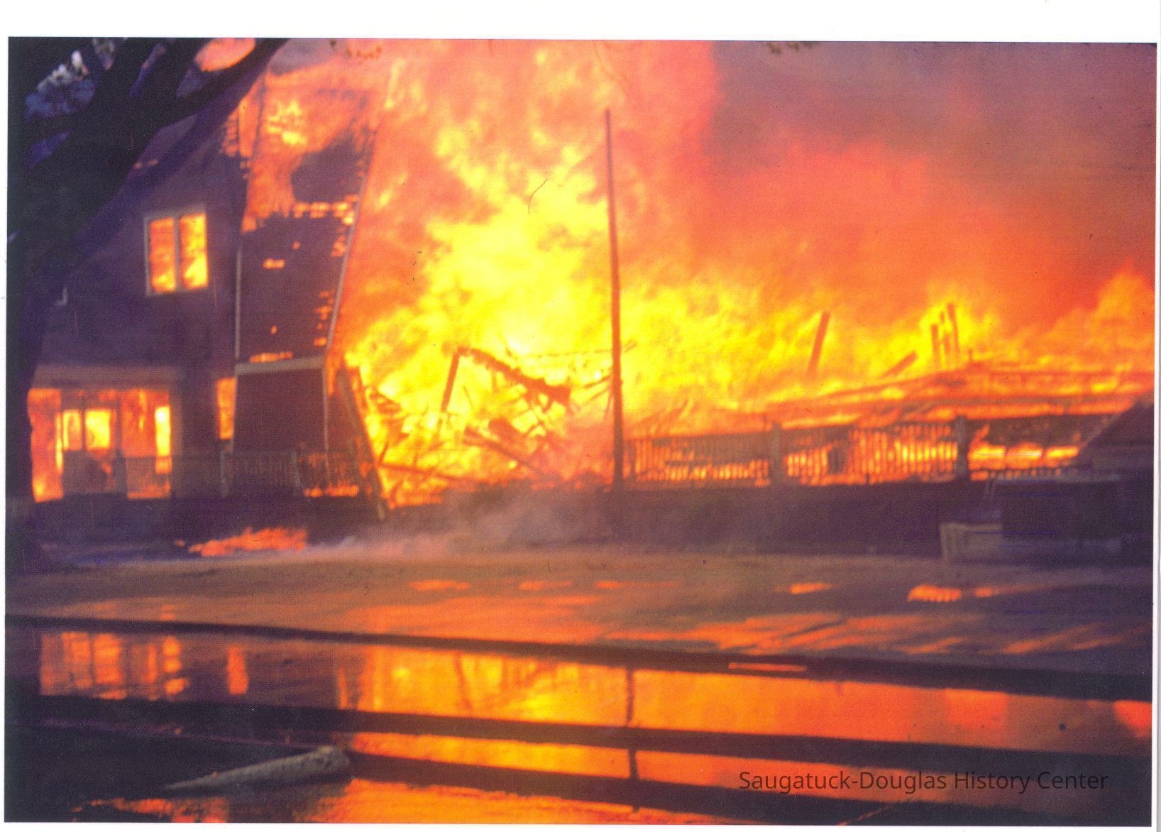The fire marked the end of a Saugatuck landmark. These images were likely gathered for use in the SDHC publication "The Big Pavilion, The Brightest Spot on the Great Lakes" by Kit Lane, 2009. Source unknown.Collection