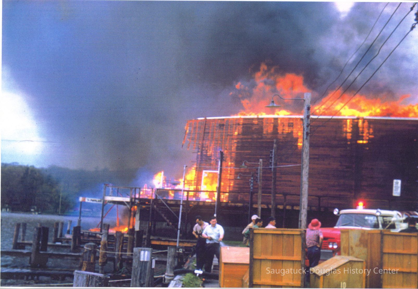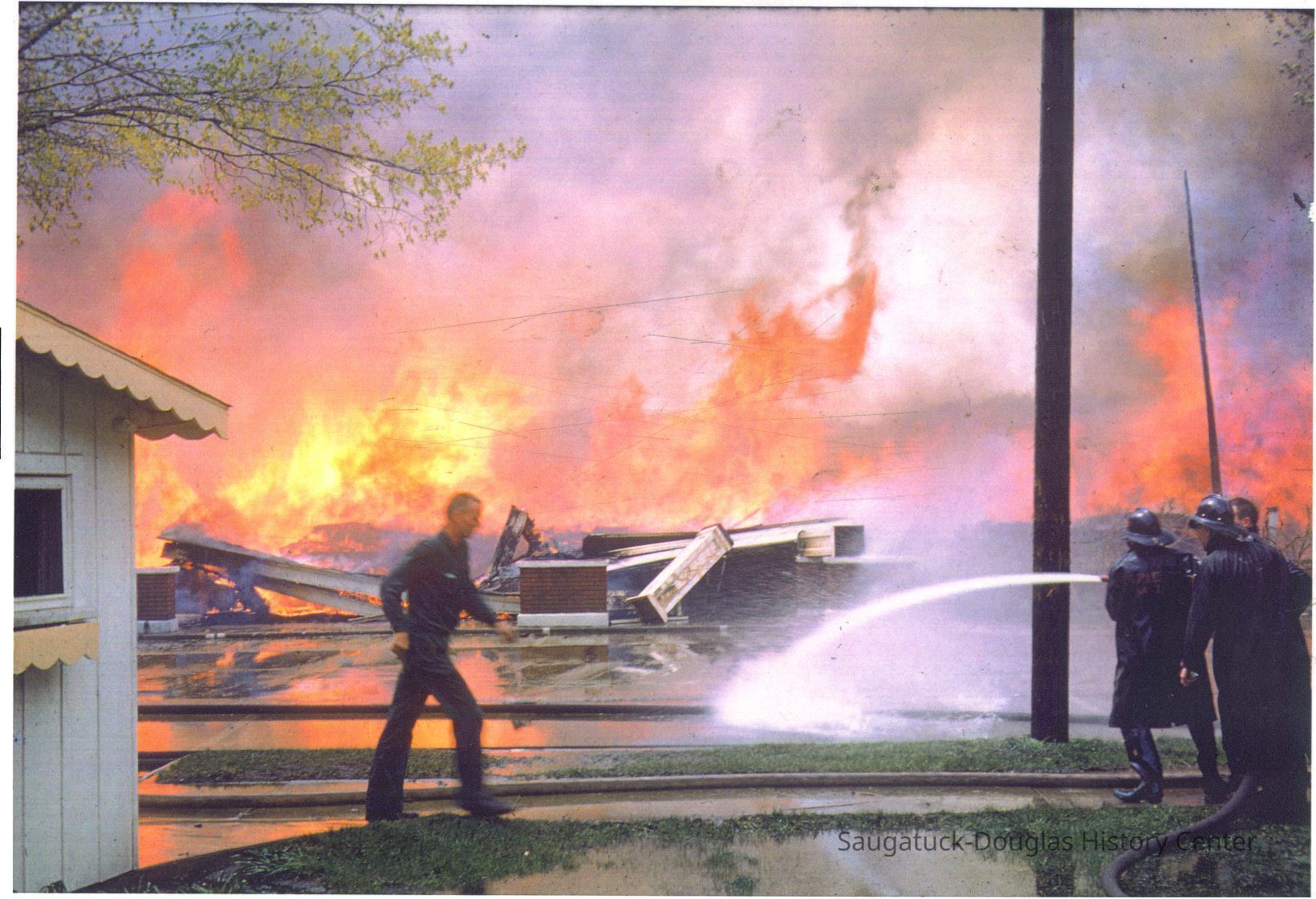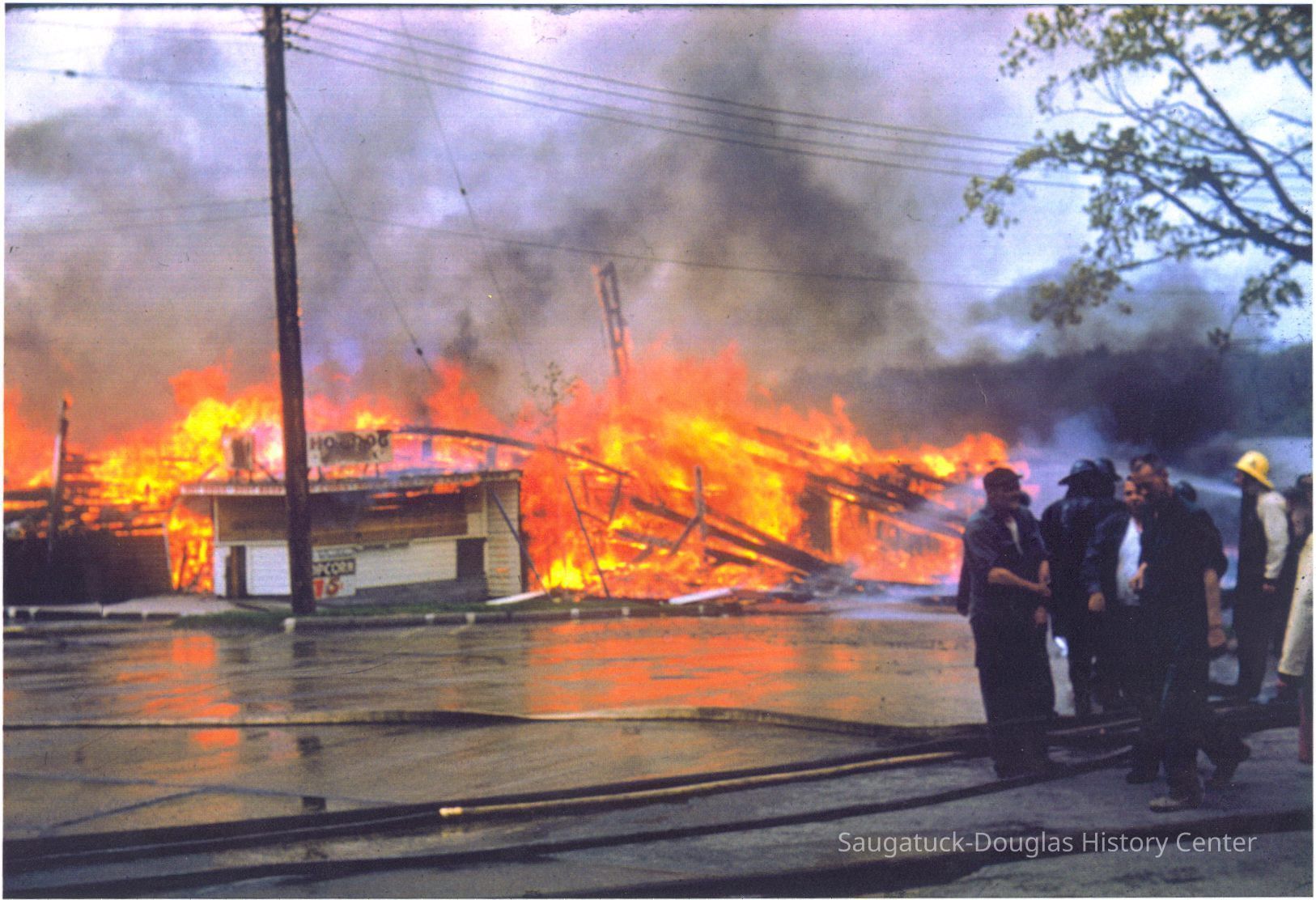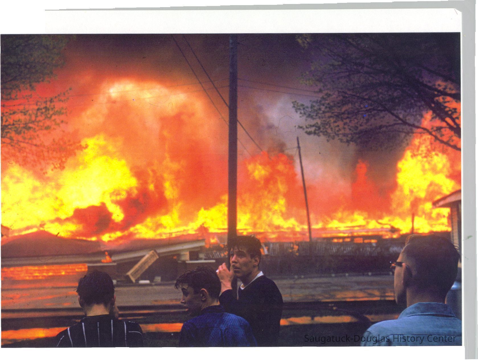 The fire marked the end of a Saugatuck landmark. These images were likely gathered for use in the SDHC publication "The Big Pavilion, The Brightest Spot on the Great Lakes" by Kit Lane, 2009. Source unknown.Collection
