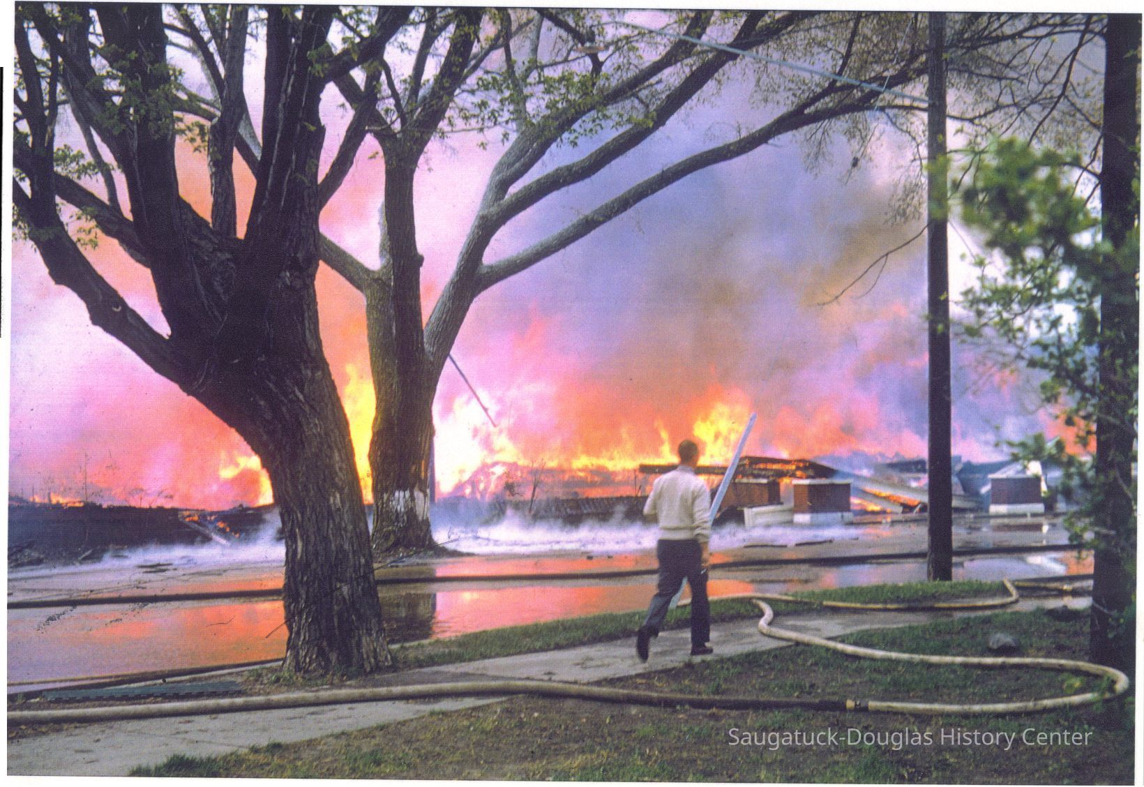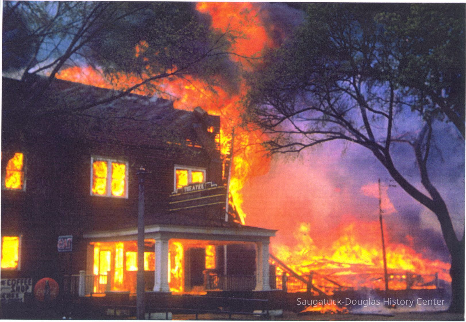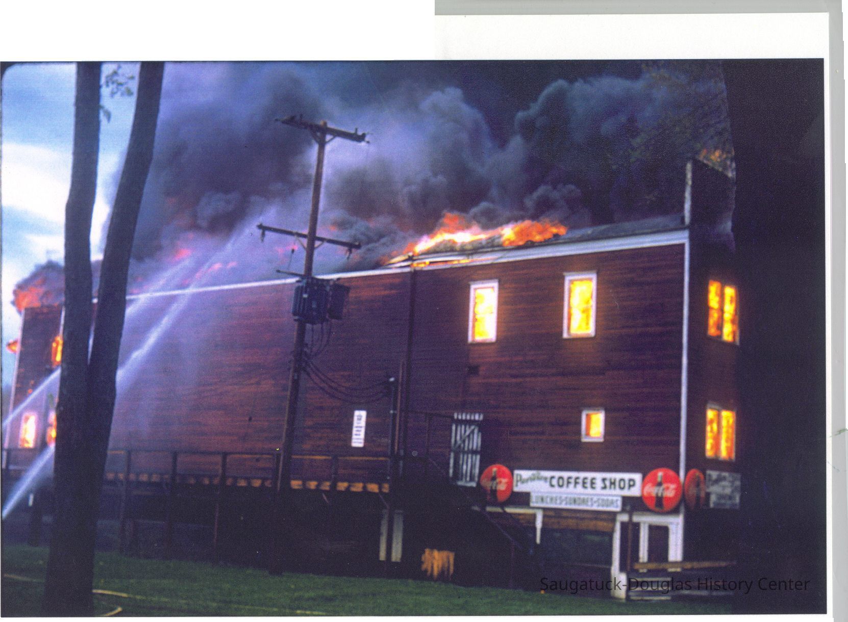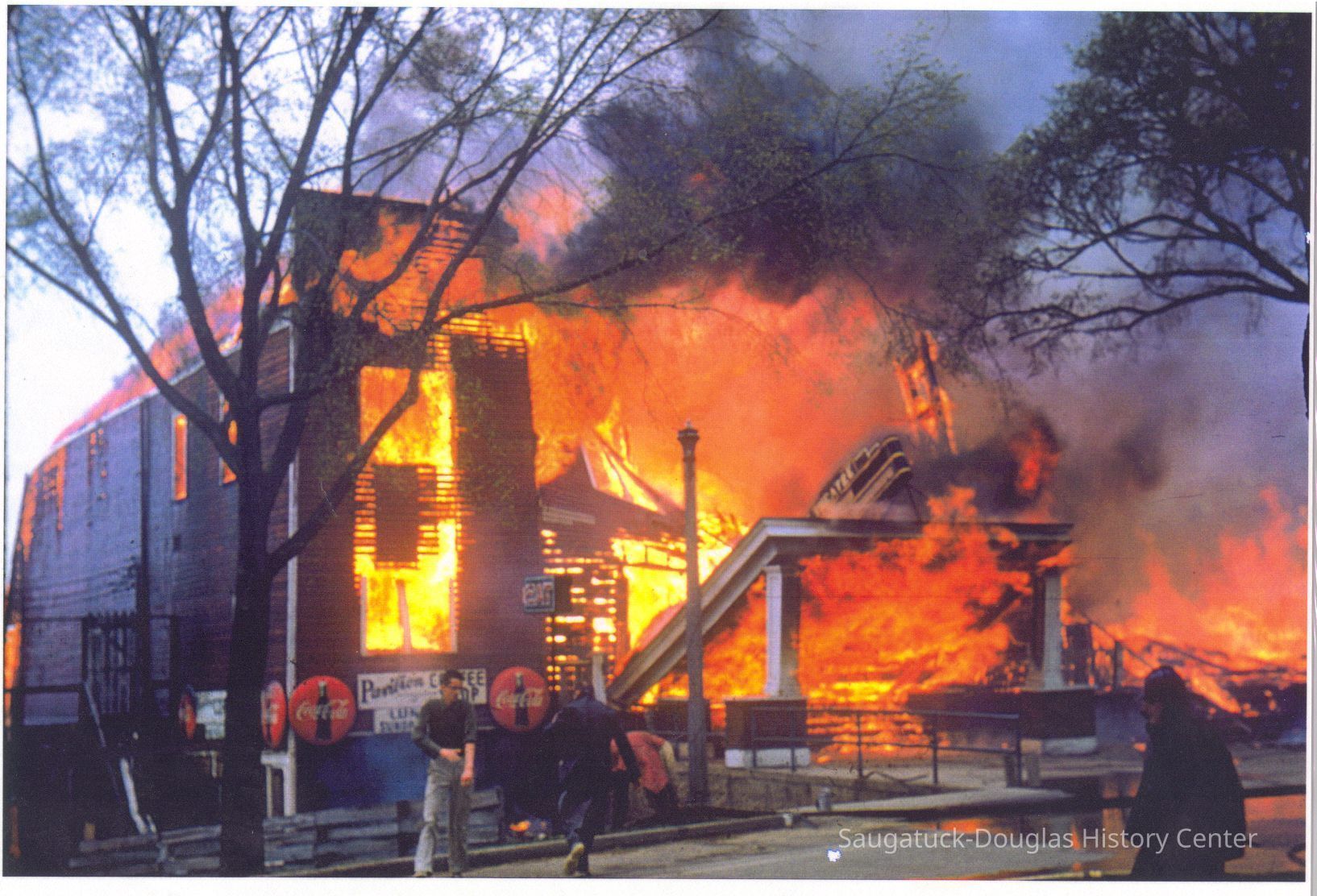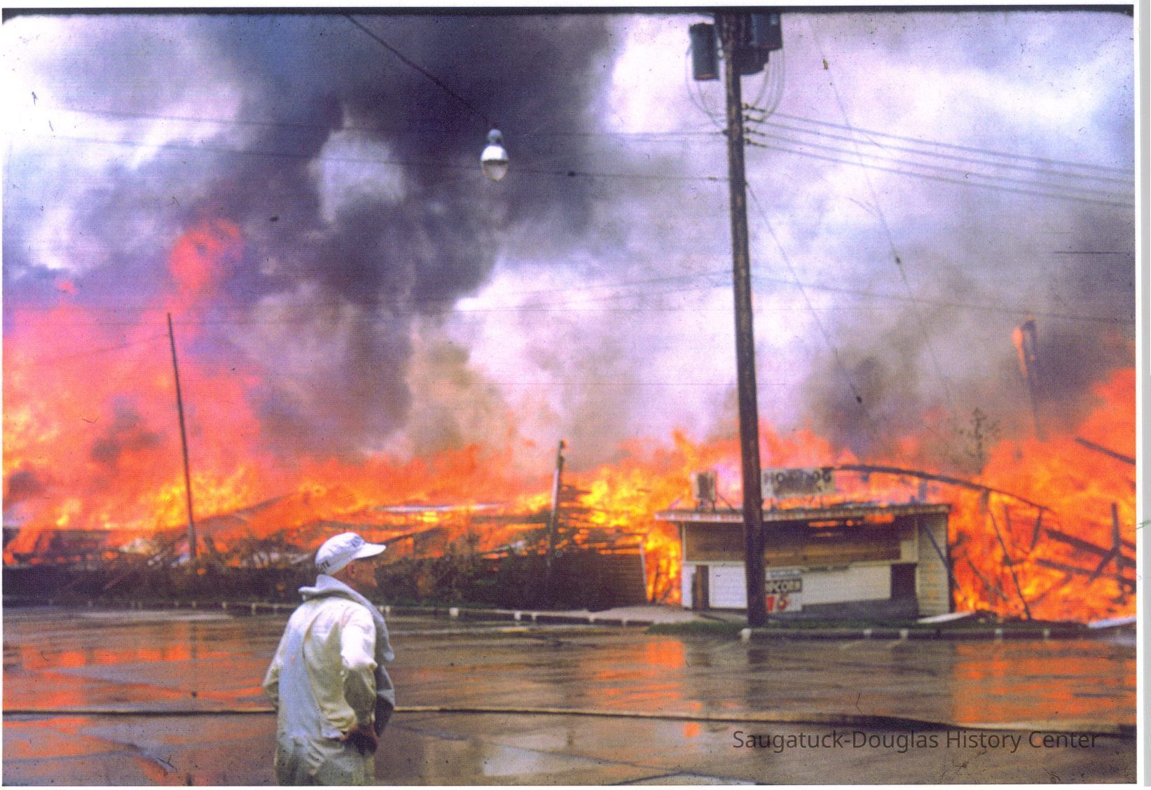 The fire marked the end of a Saugatuck landmark. These images were likely gathered for use in the SDHC publication "The Big Pavilion, The Brightest Spot on the Great Lakes" by Kit Lane, 2009. Source unknown.Collection
