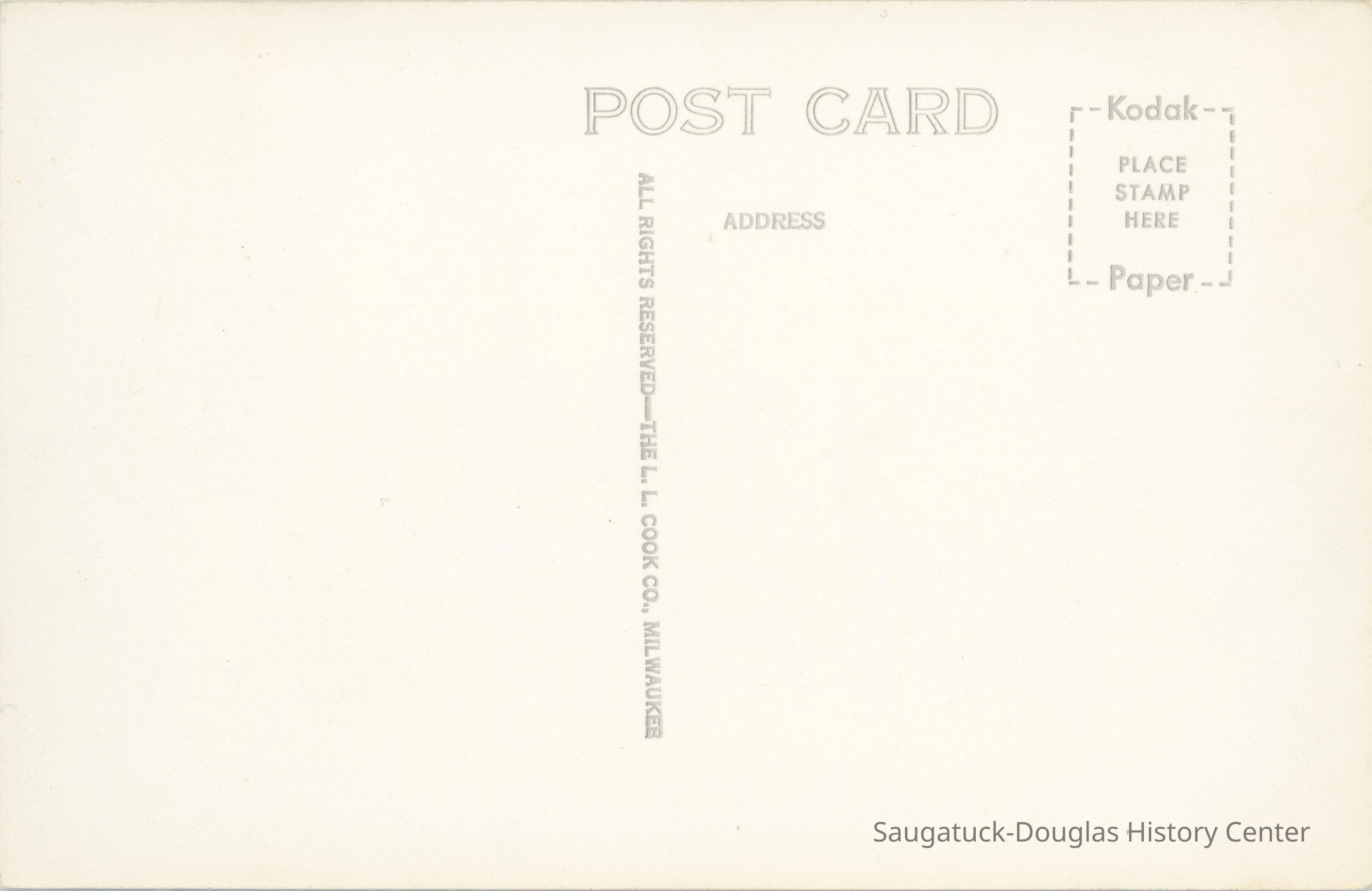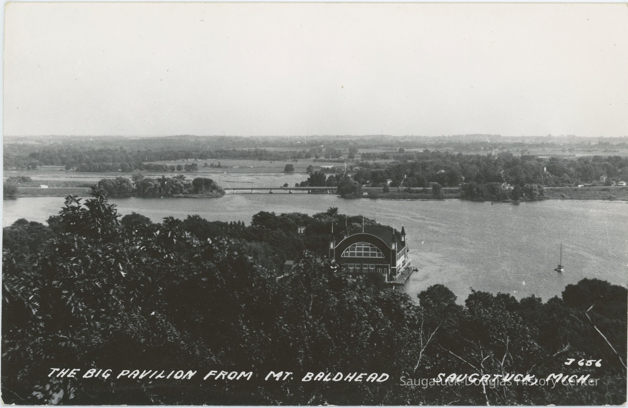 A black and white postcard showing the Big Pavilion from atop Mt. Baldhead. Trees make up the bottom third of the composition, the Kalamazoo River and landscape in the middle third, and the clear sky in the top third.Subject