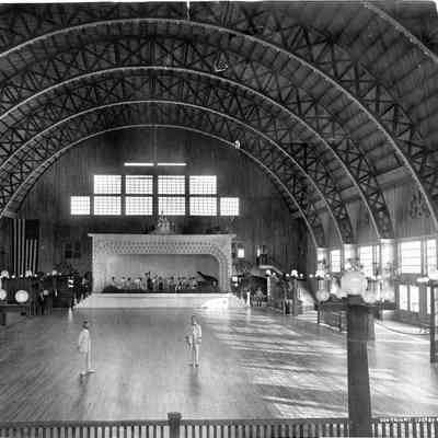B/W photograph of two men standing on the dance floor of the newly constructed Big Pavilion. A handwritten note on the back of the print identifies the men as Big Pavilion investor Fred Limouze on the left and Andy Crawford on the right. An orchestra is in position on the band stand and ushers are standing by along the edges of the polished wood floor. Light is streaming in from the windows on right side of the image.