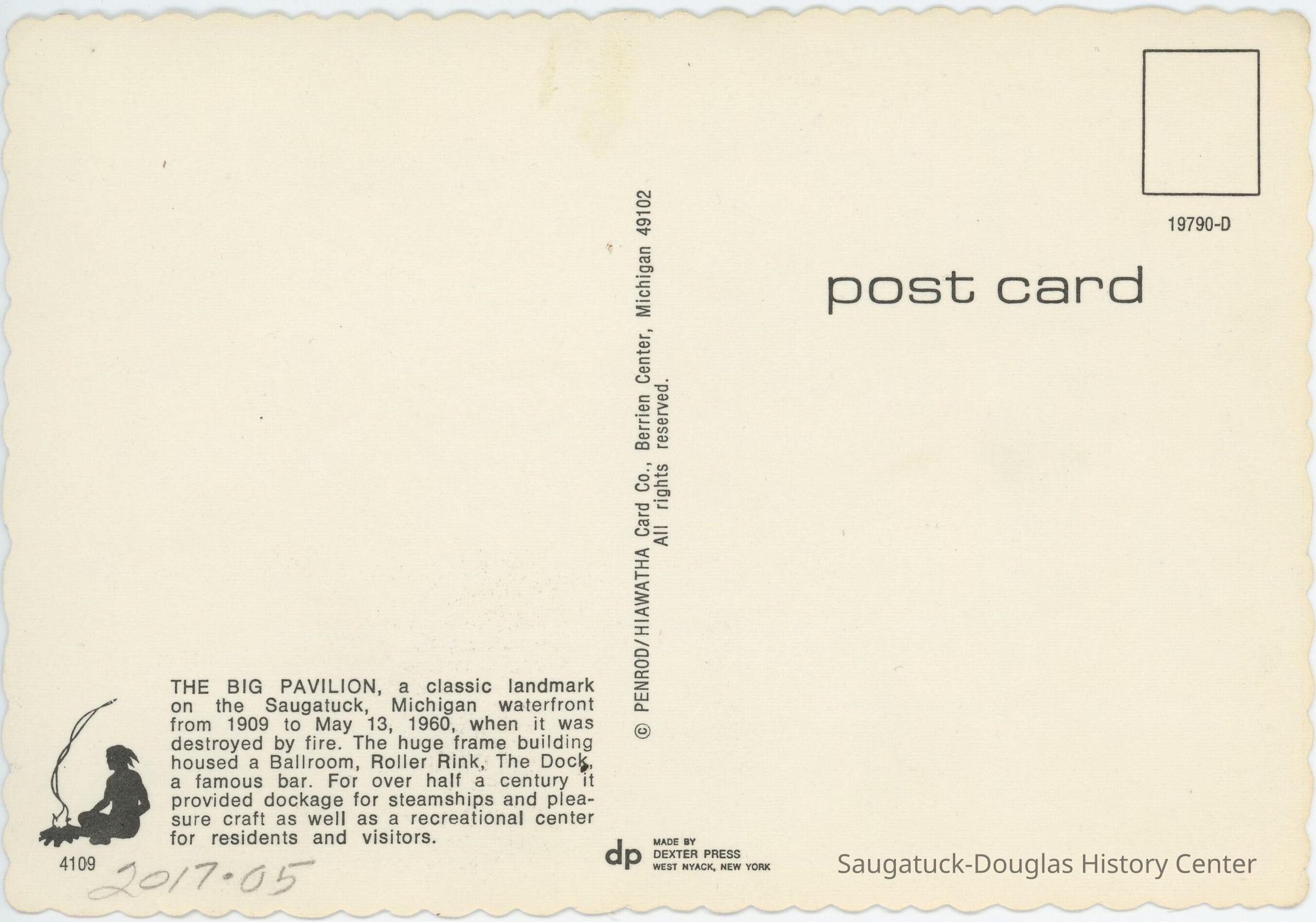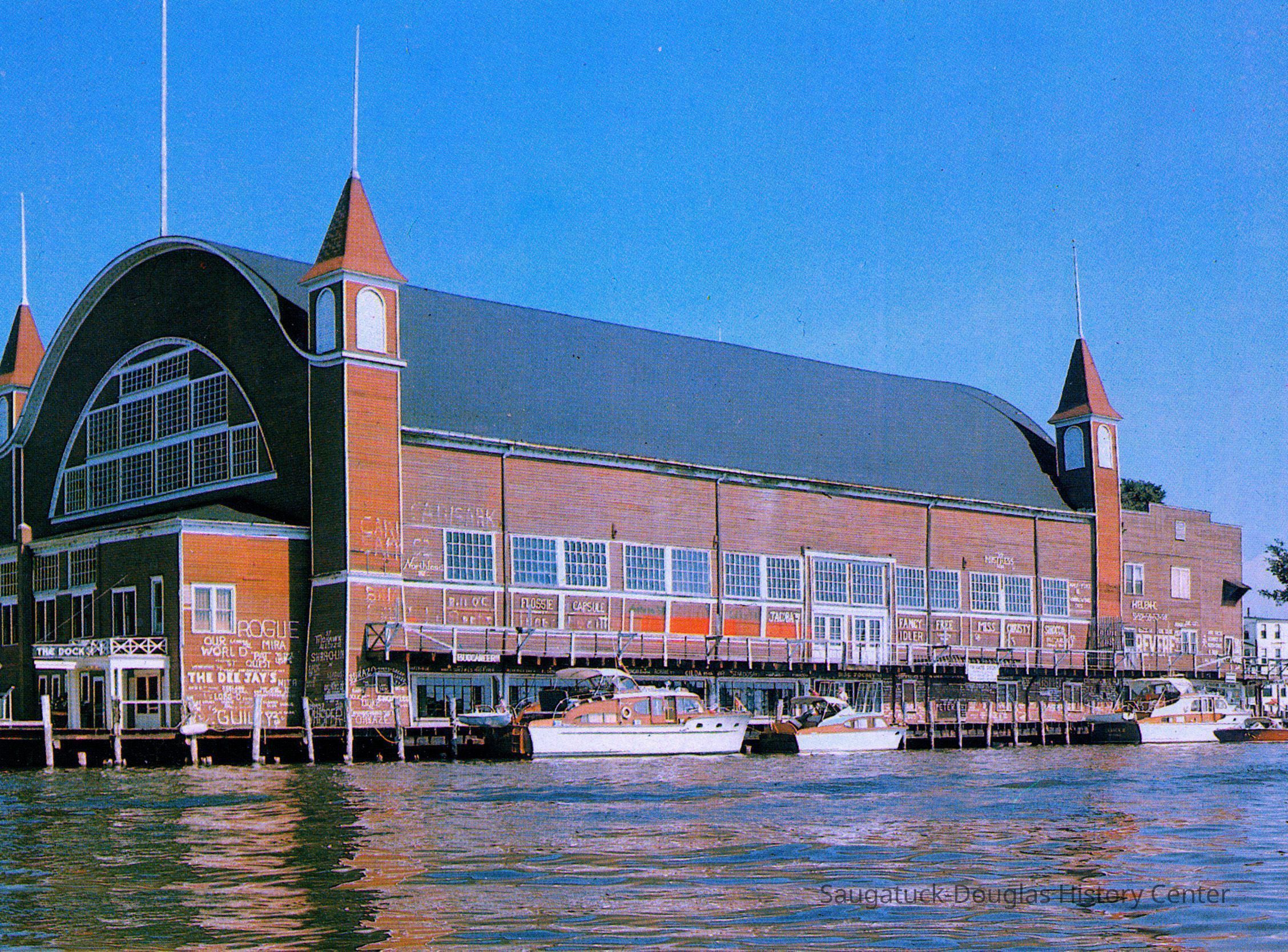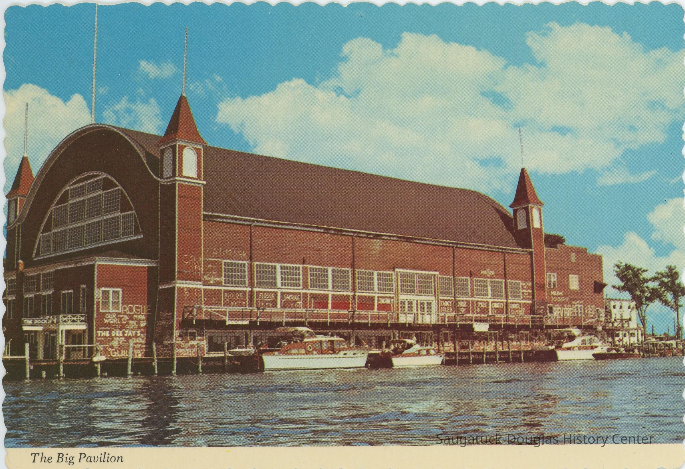 The Big Pavilion, a classic landmark on the Saugatuck, Michigan waterfront from 1909 to May 13, 1960, when it was destroyed by fire. The huge frame building housed a Ballroom, Roller Rink, The Dock, a famous bar. For over half a century it provided dockage for steamships and pleasure craft as well as a recreational center for residents and visitors.Location