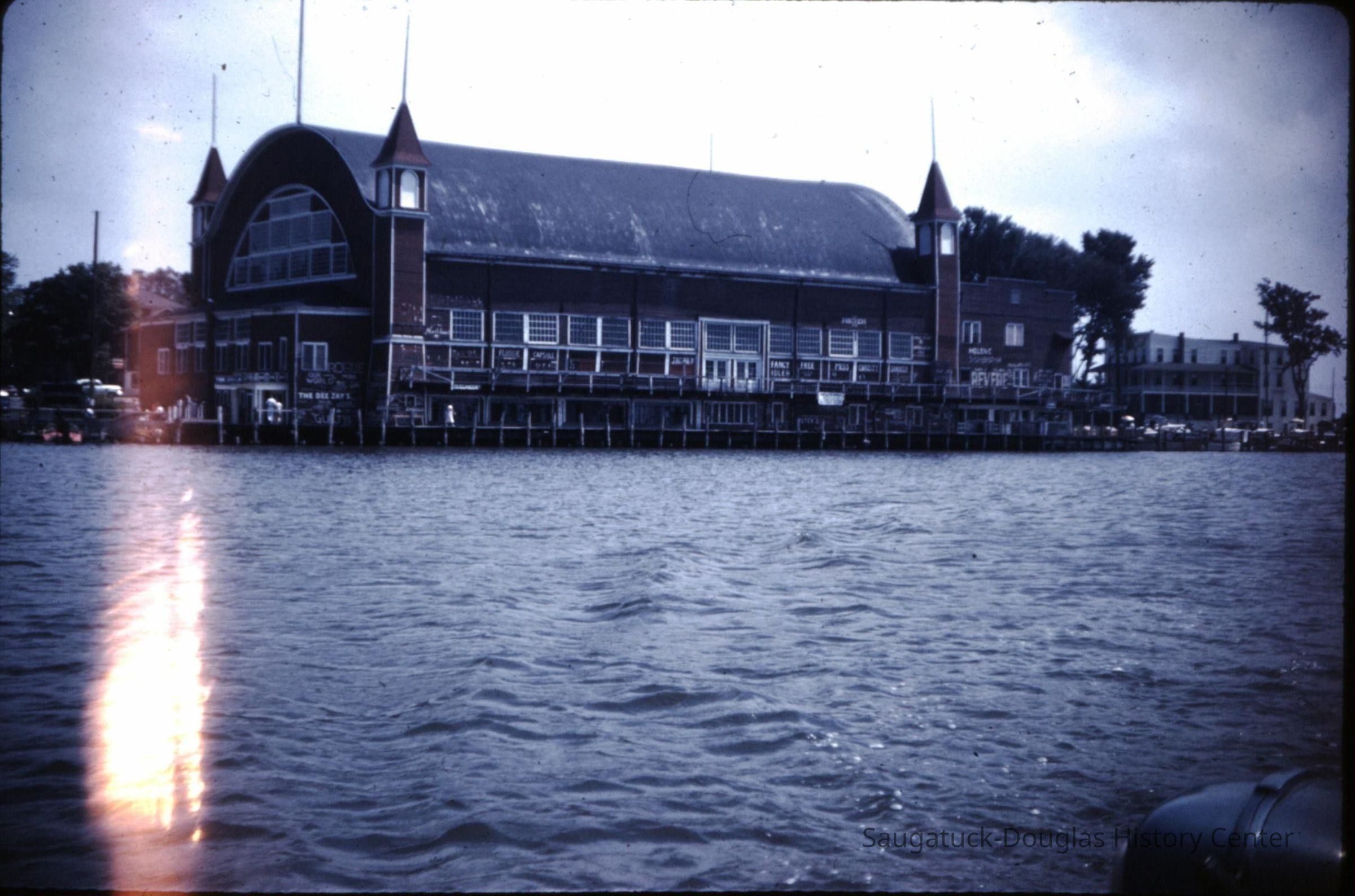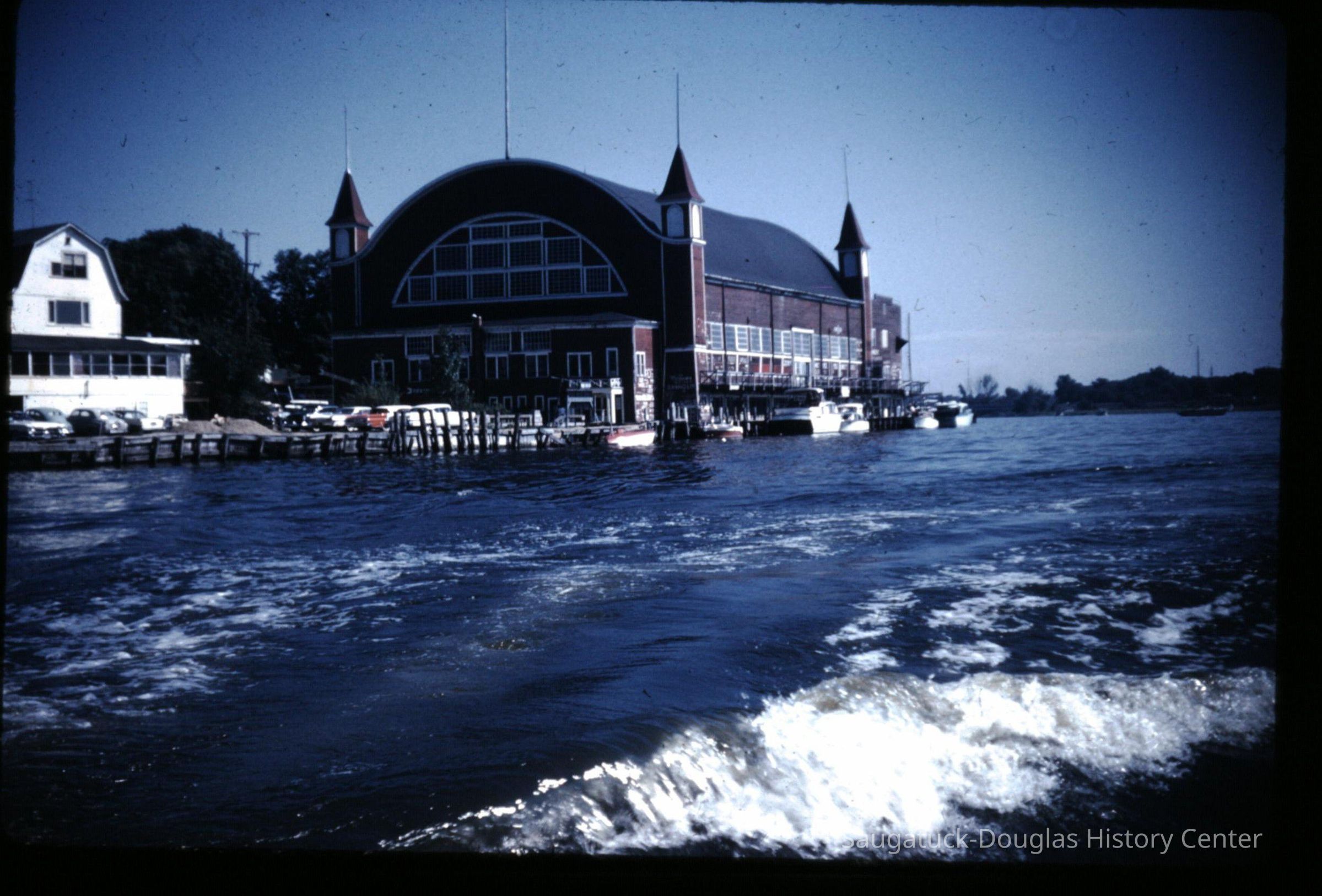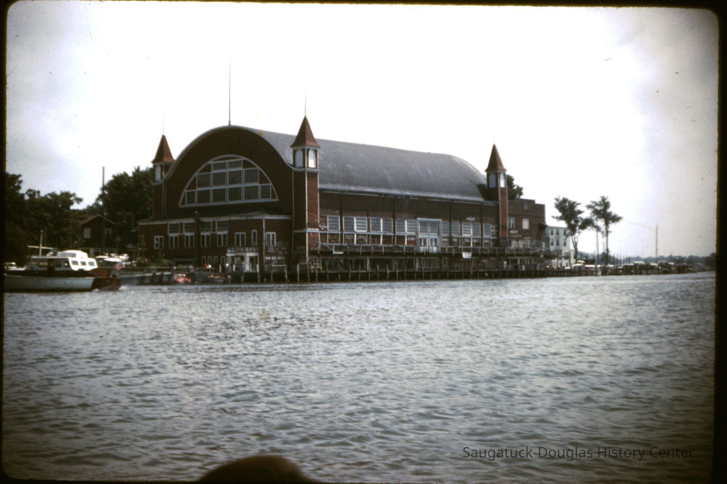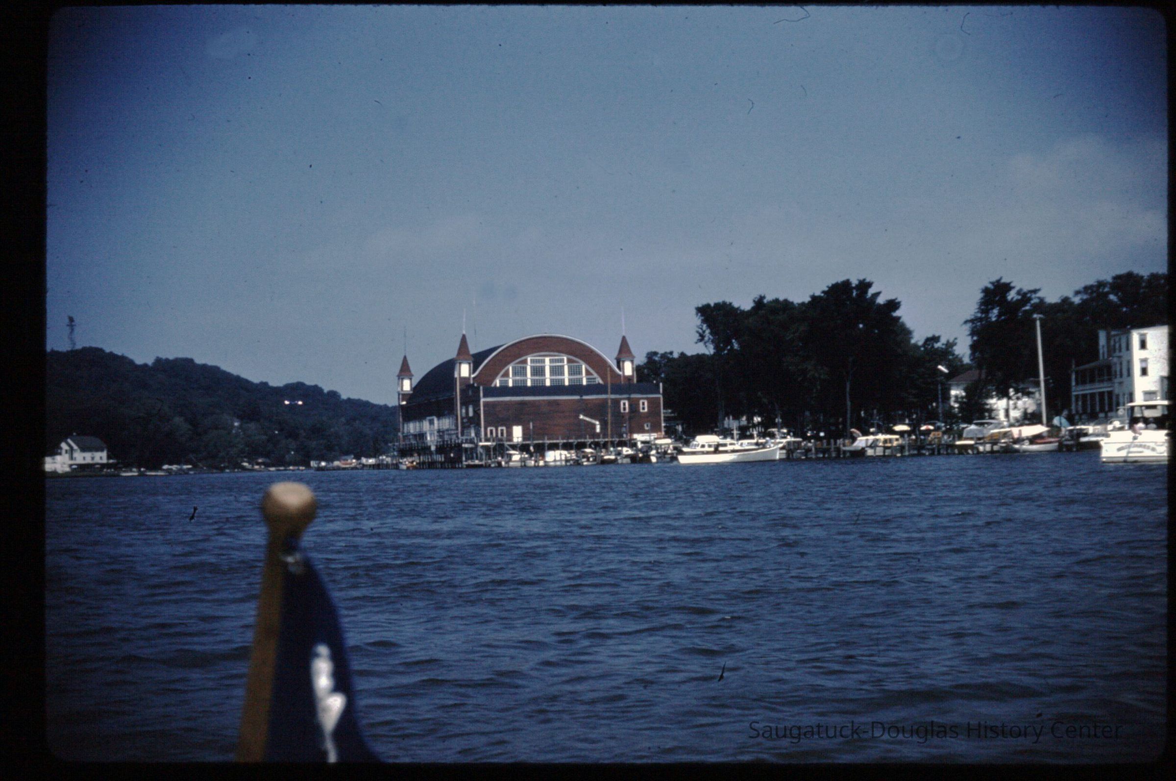 15 color photographic slides of the Big Pavilion as seen from a boat cruising by on Kalamazoo Lake. Views of the north side of the building and docks.Photograph Details