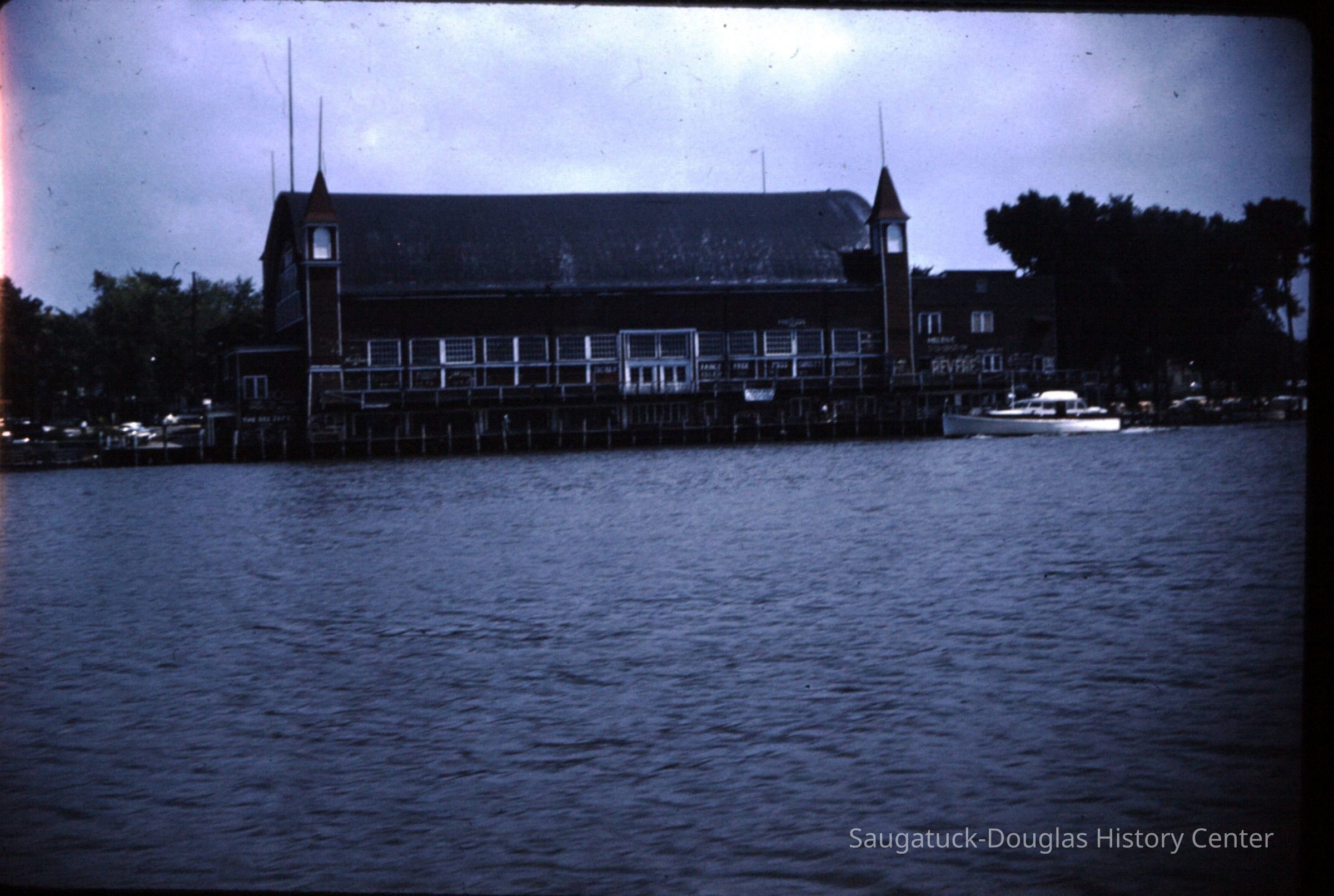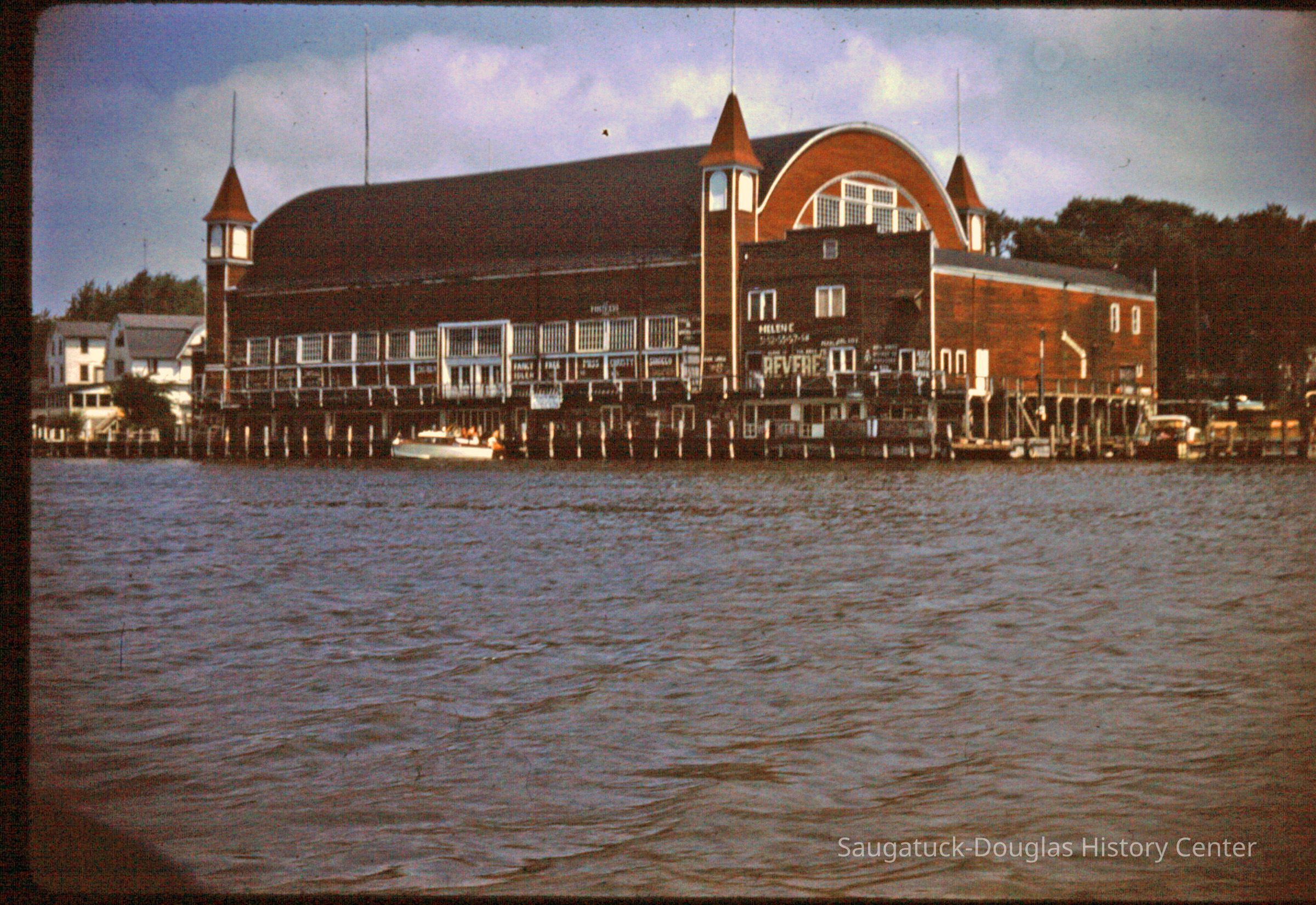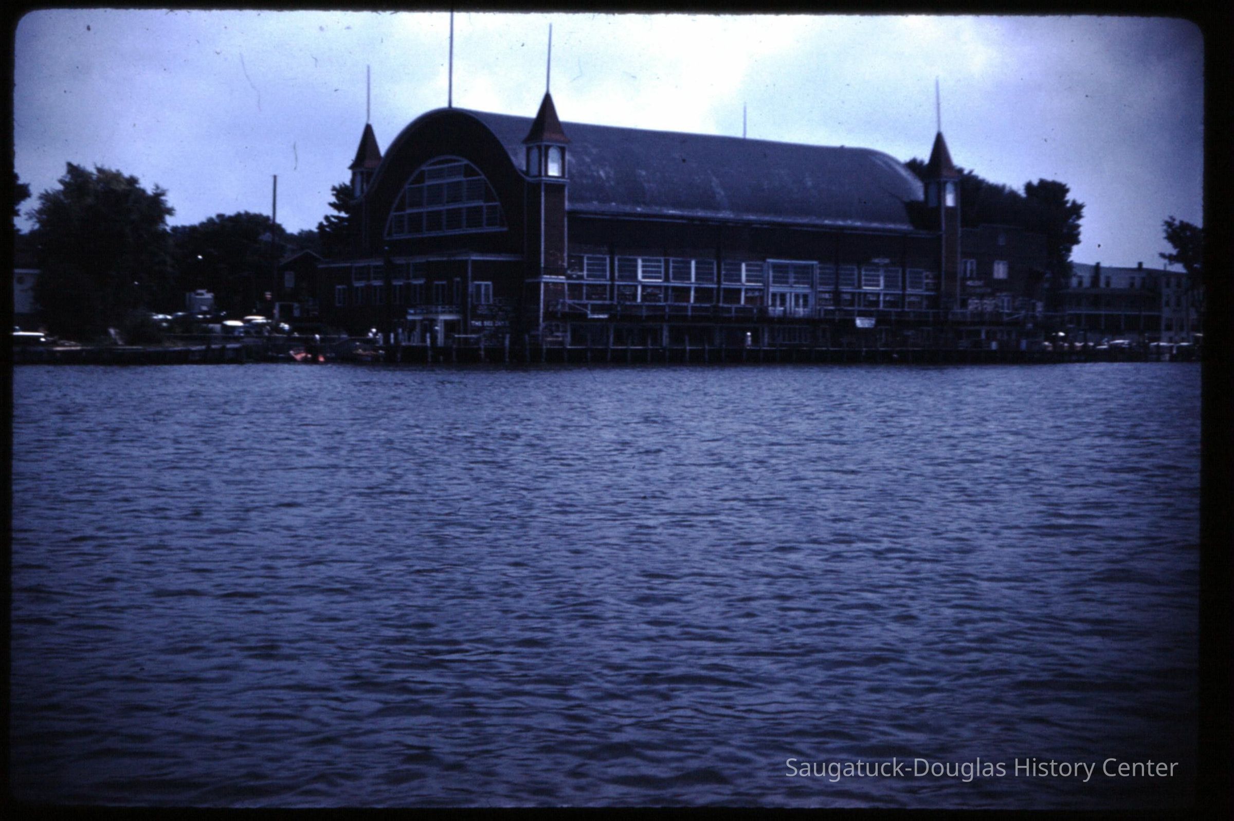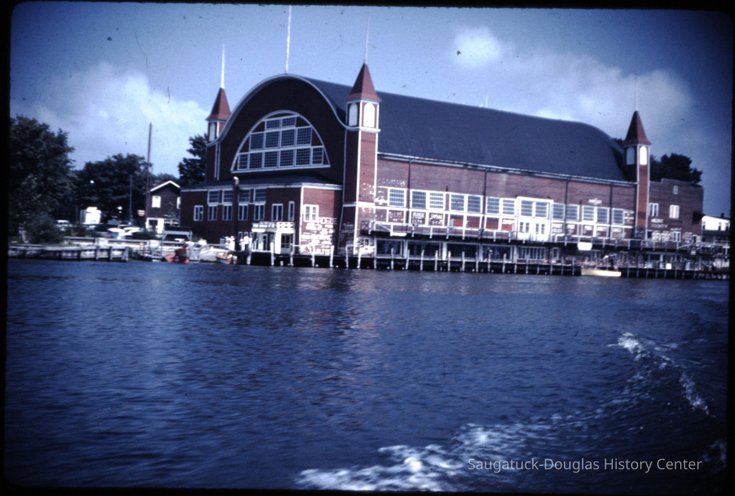 15 color photographic slides of the Big Pavilion as seen from a boat cruising by on Kalamazoo Lake. Views of the north side of the building and docks.Photograph Details