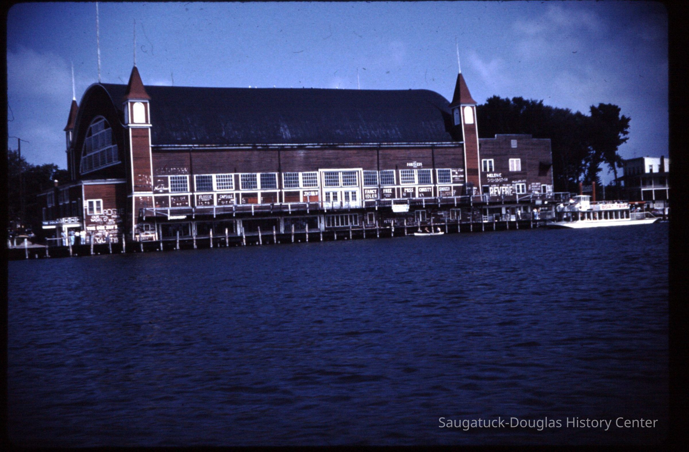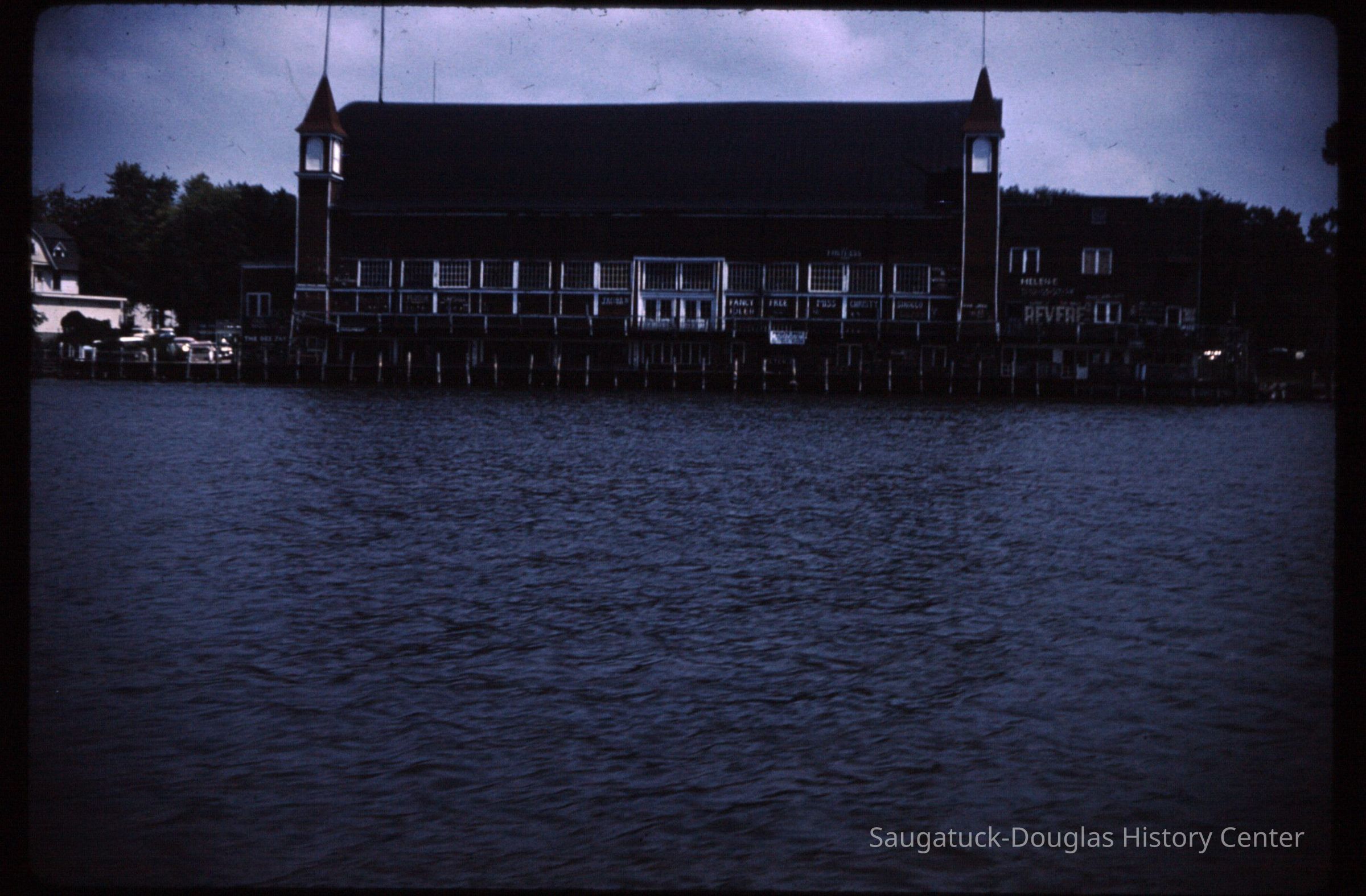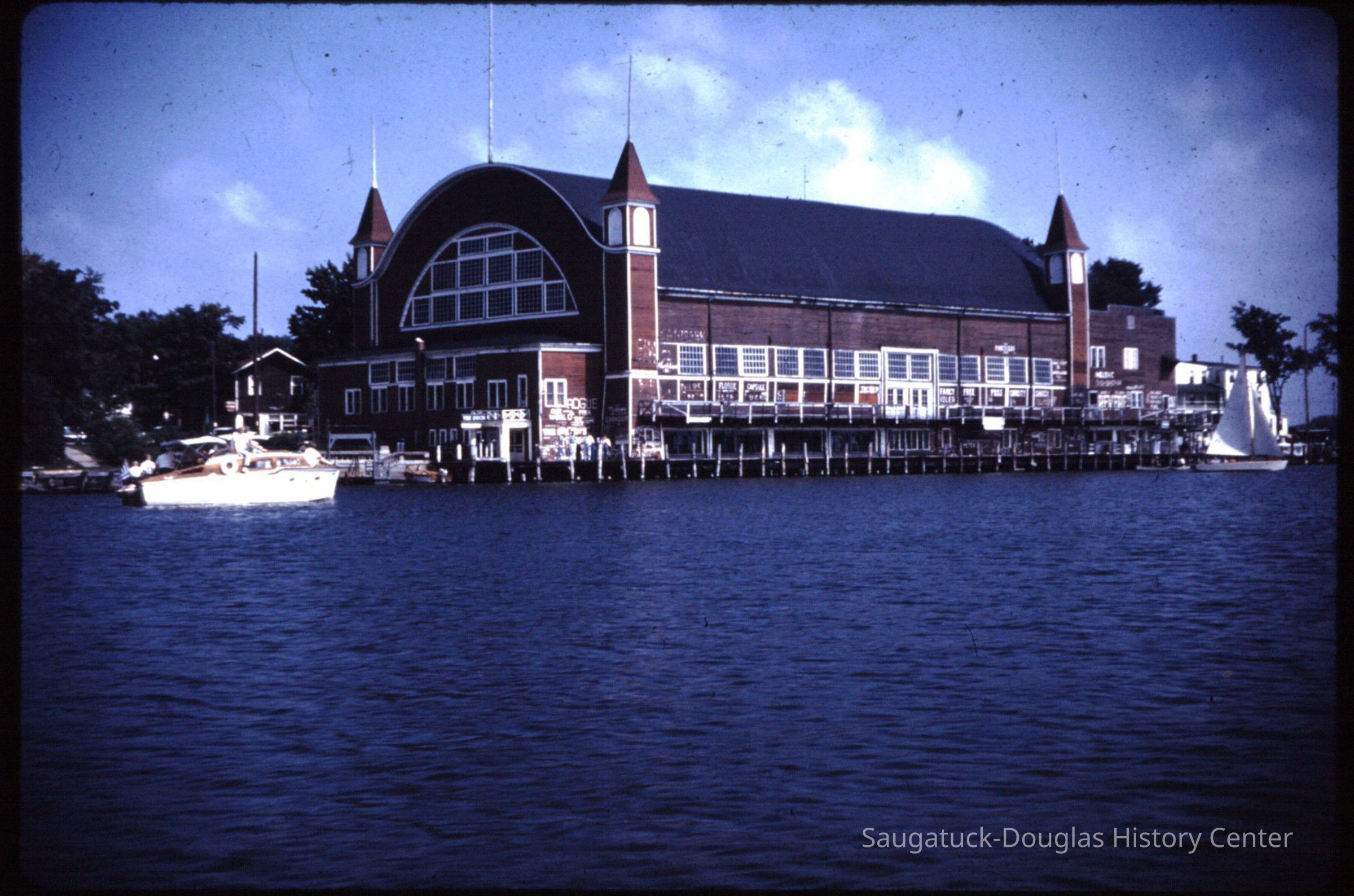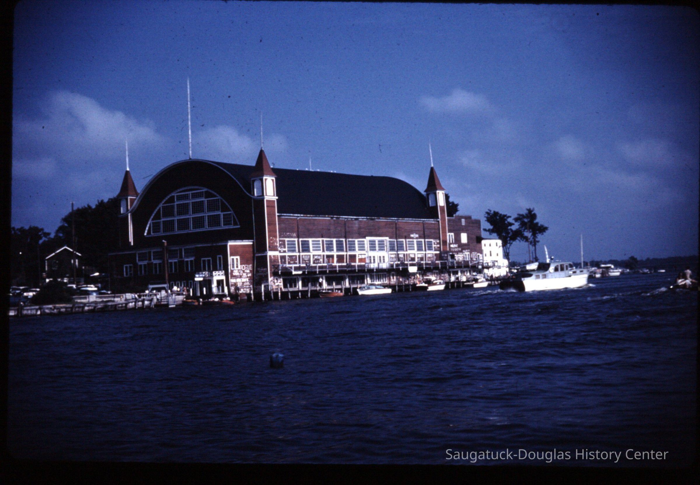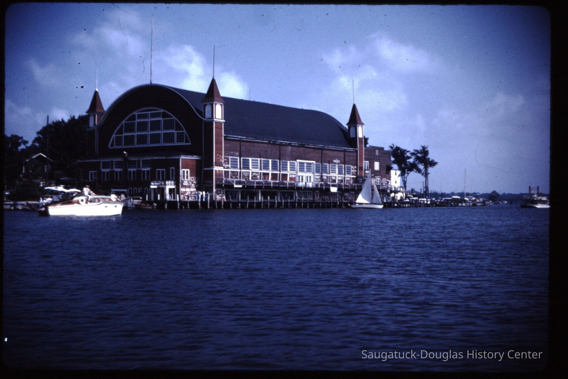 15 color photographic slides of the Big Pavilion as seen from a boat cruising by on Kalamazoo Lake. Views of the north side of the building and docks.Photograph Details