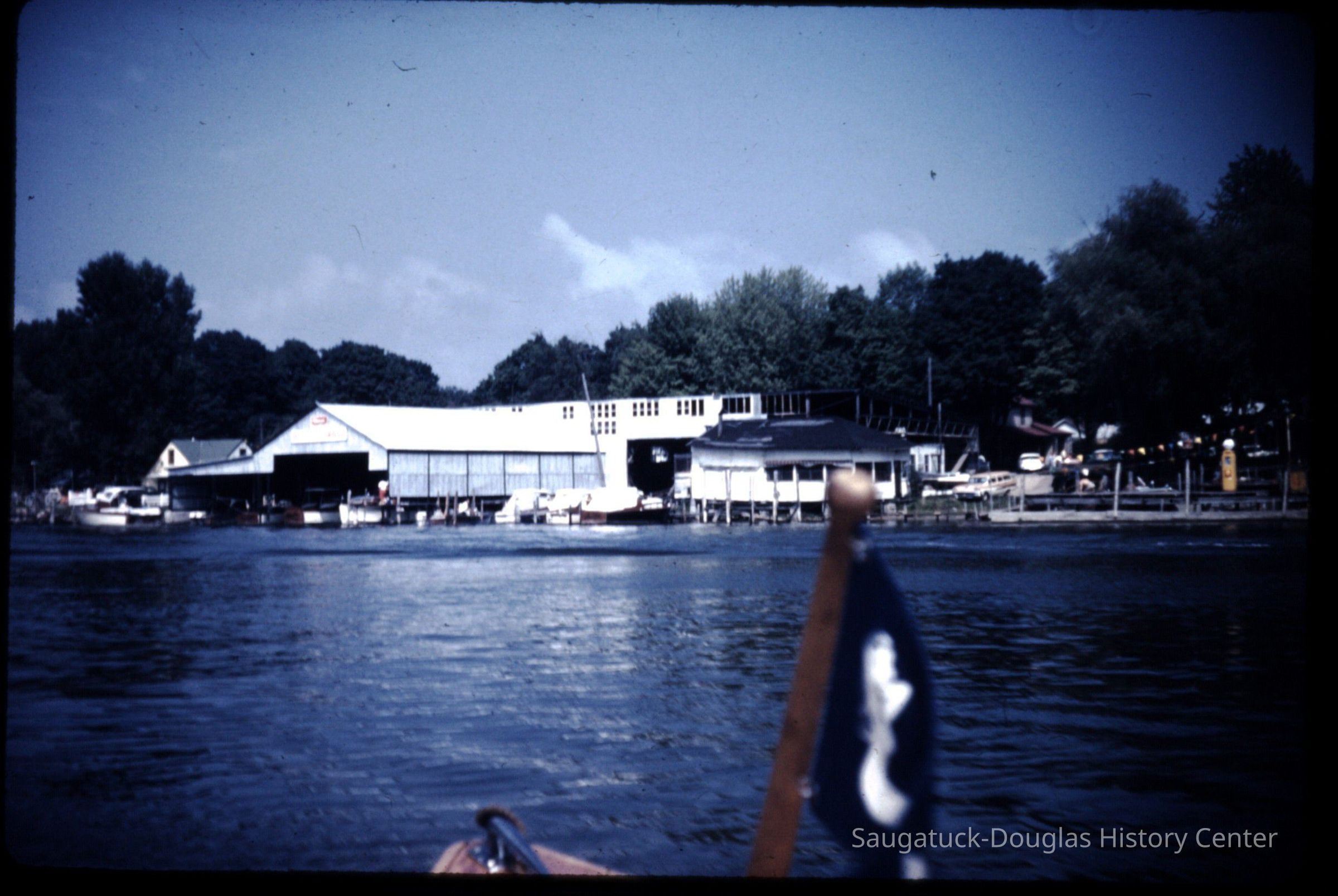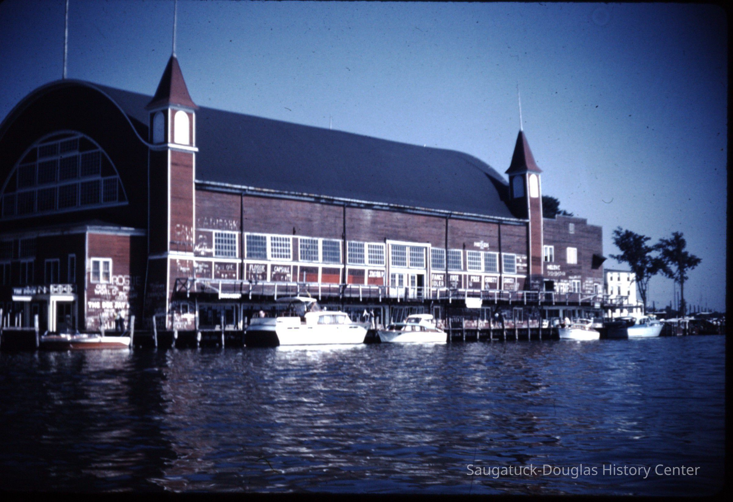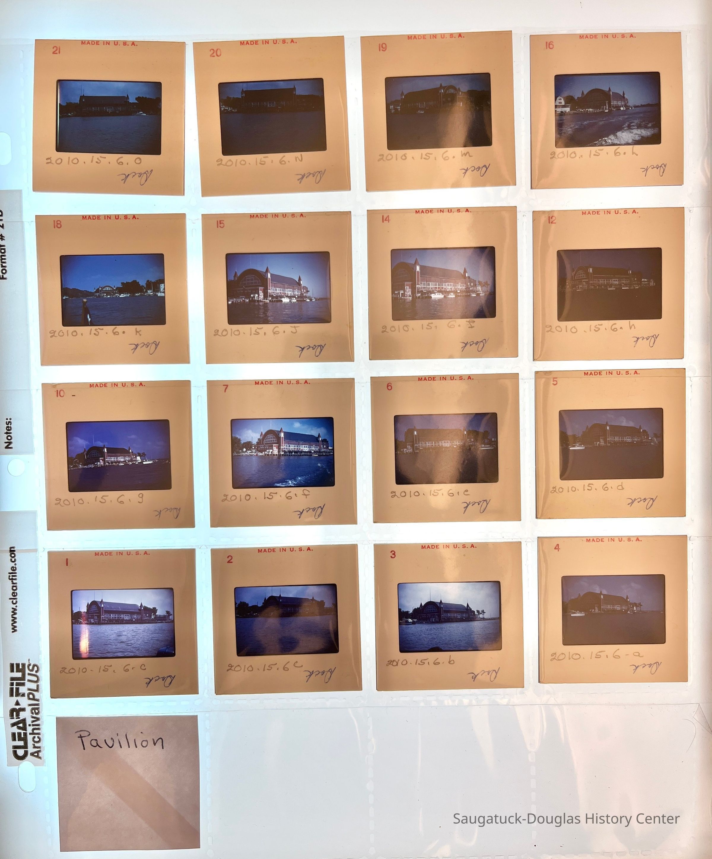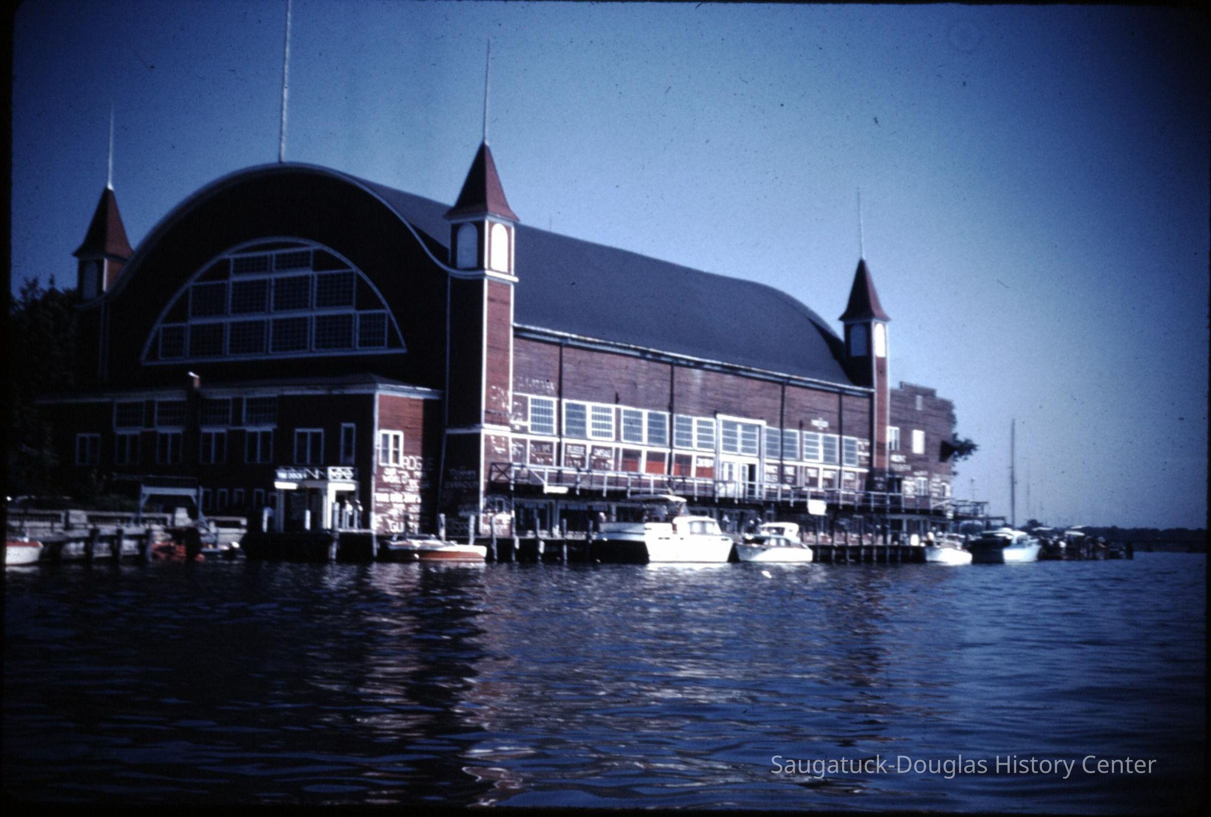 15 color photographic slides of the Big Pavilion as seen from a boat cruising by on Kalamazoo Lake. Views of the north side of the building and docks.Photograph Details