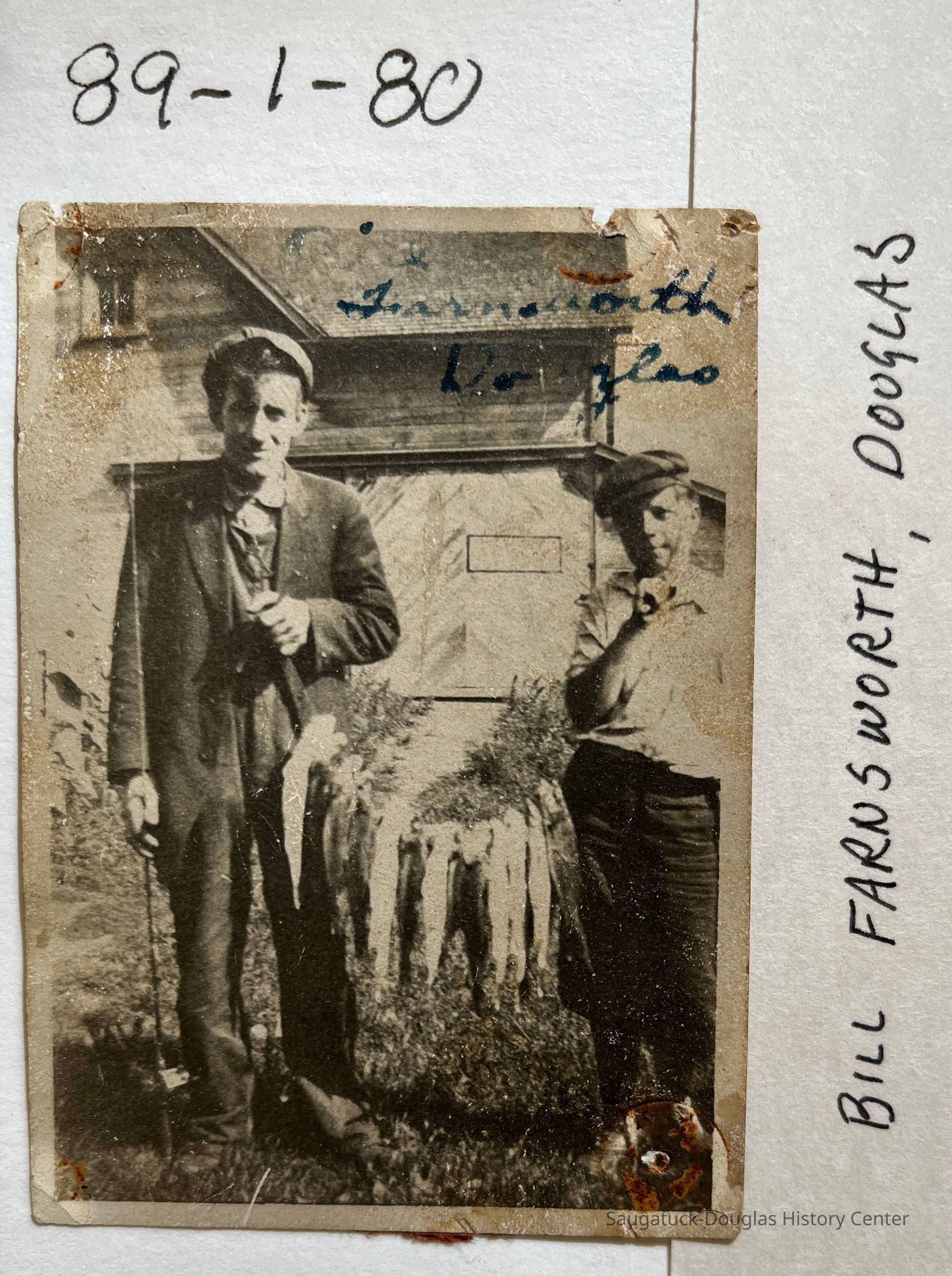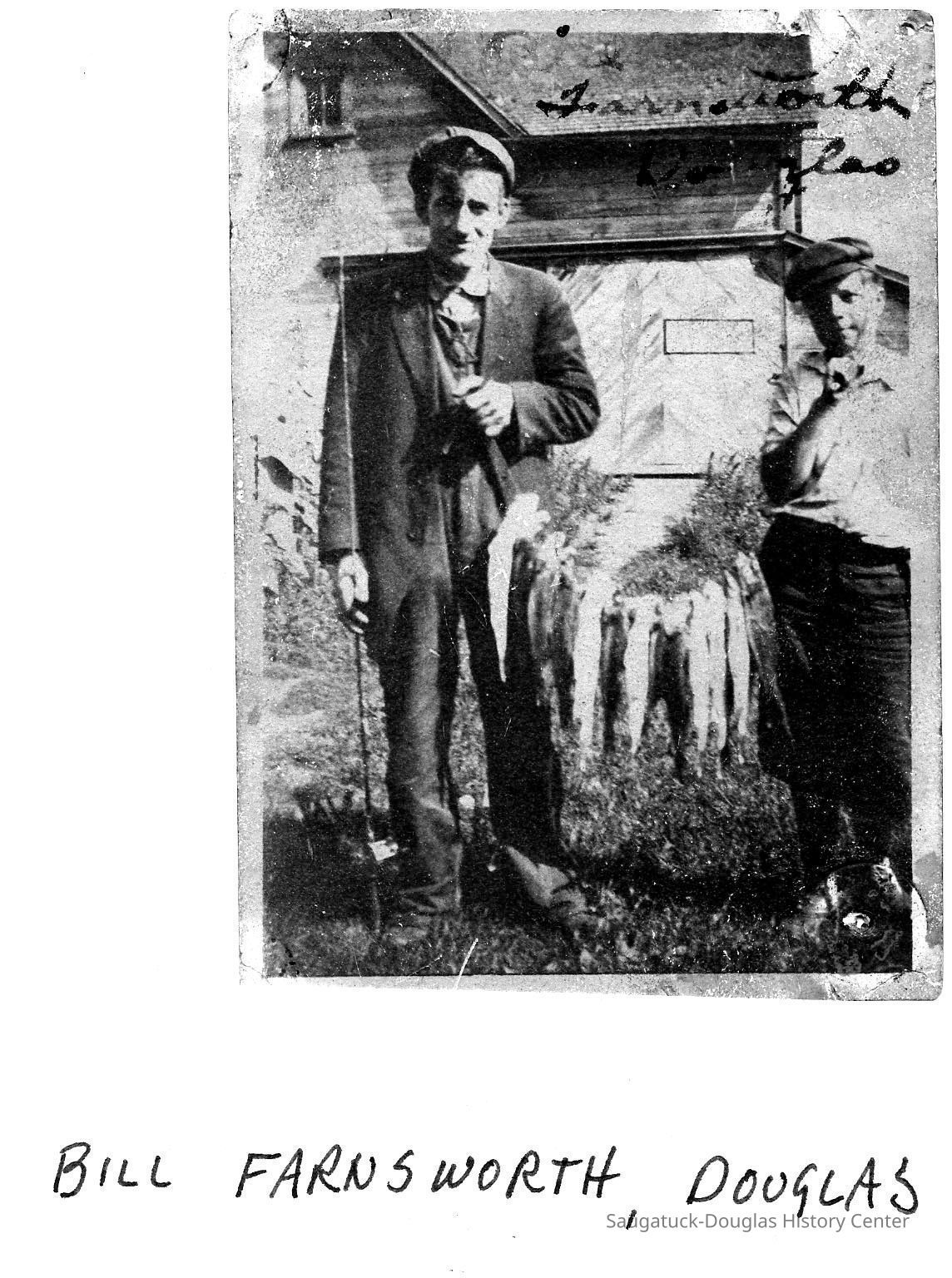 A man, armed with a fishing rod, is holding one end of a string of fish. A boy is holding the other end of the string. Both people are standing in front of a barn or farmhouse. Handwriting on the image reads "Bill Farnsworth Douglas"