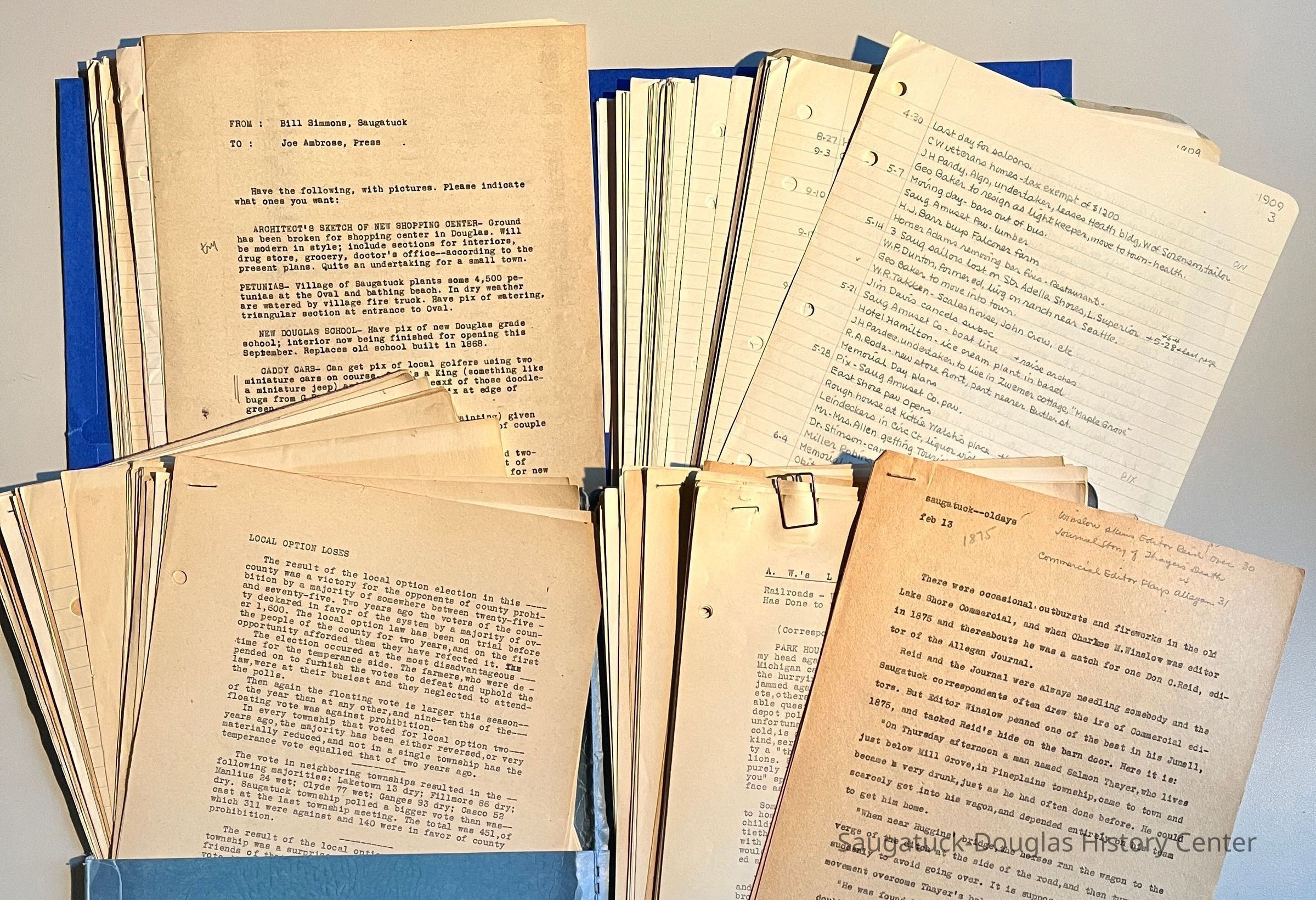Typewritten story text and neatly handwritten research notes compiled by William "Bill" Simmons, editor of the Commercial Record newspaper.