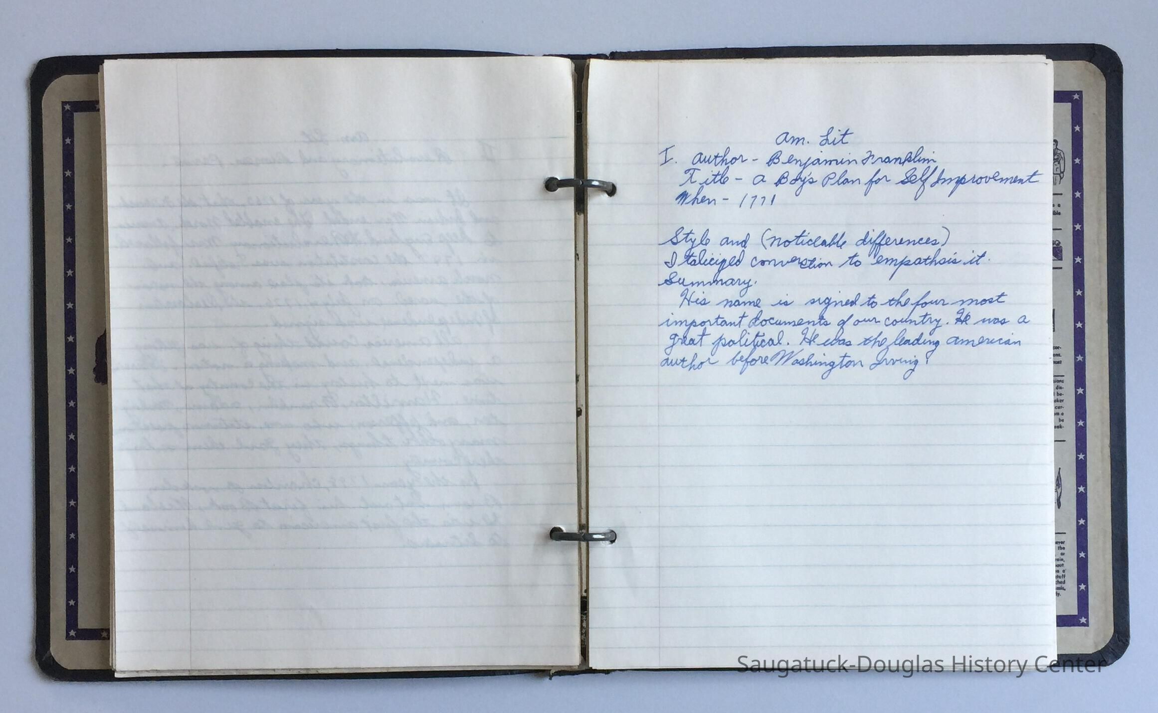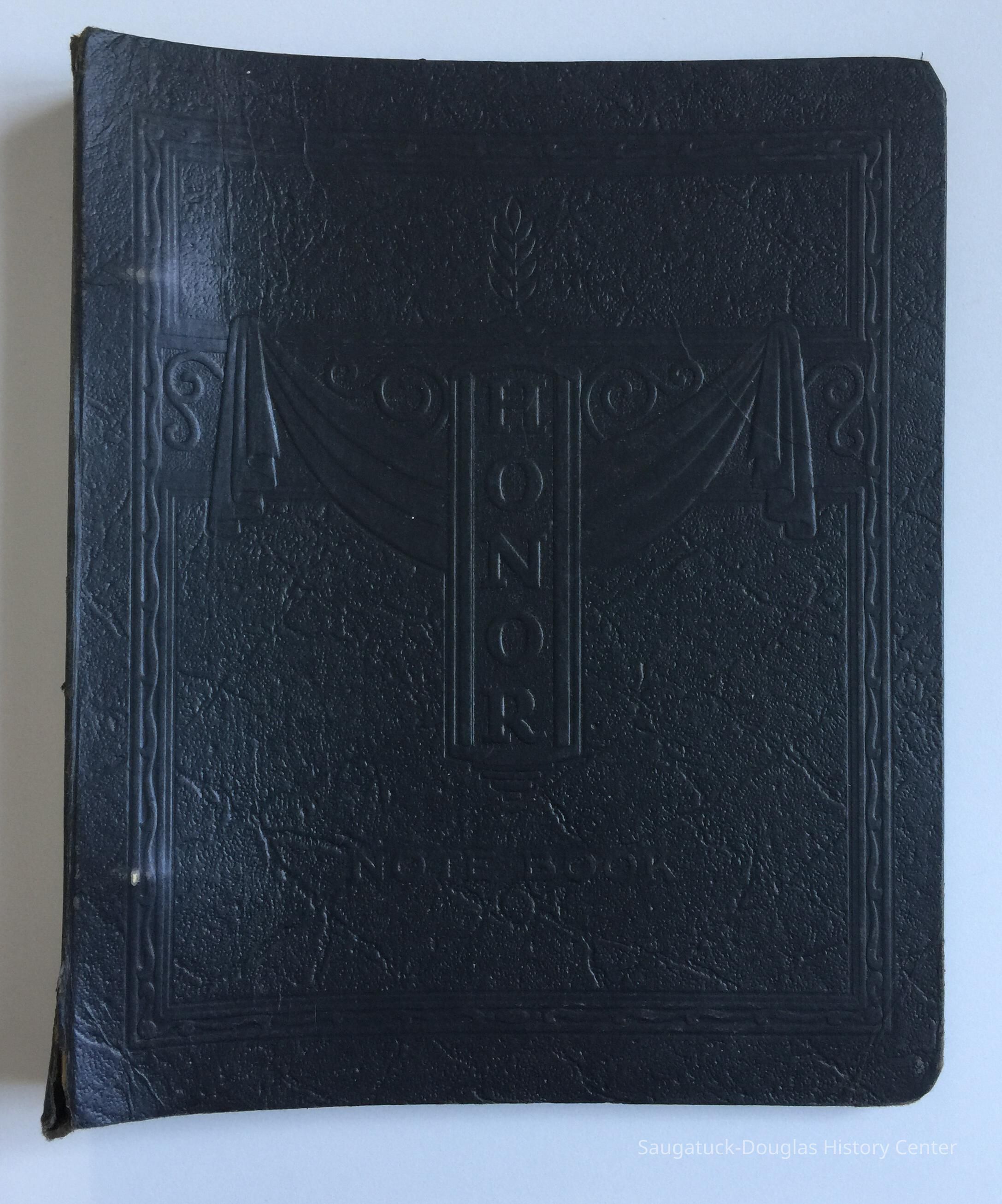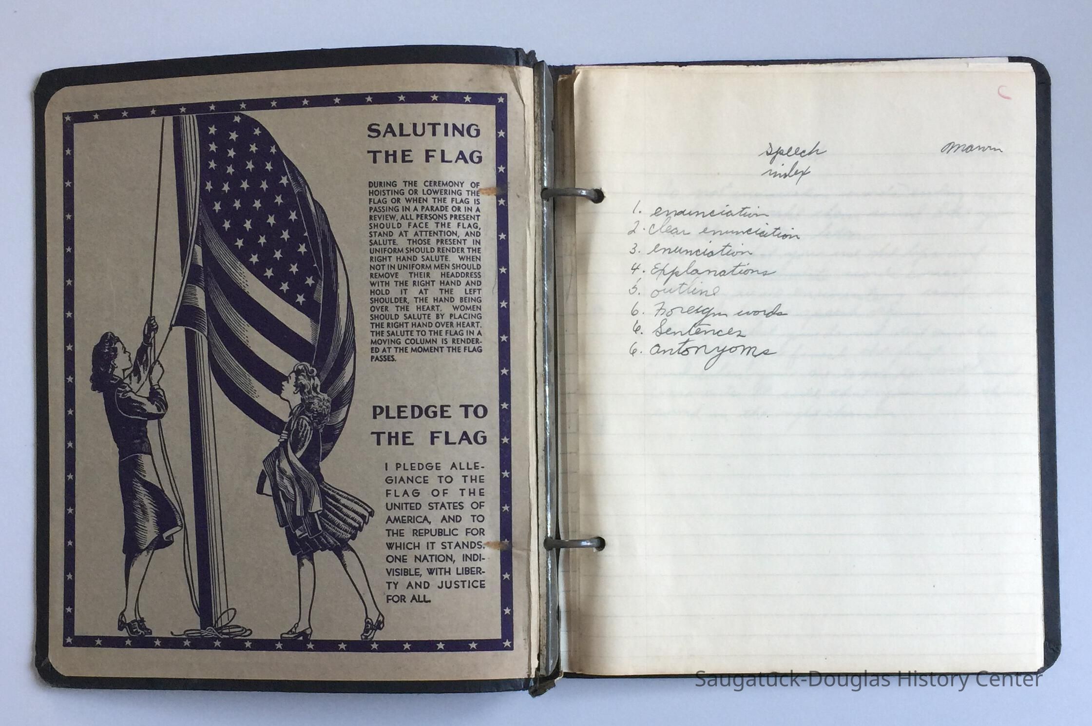 Black paperboard "Honor" 2-ring binder notebook with flag etiquette guidelines printed on inside cover. Binder contains collection of Marvin Demerest's school work handwritten in cursive on ruled paper.Context