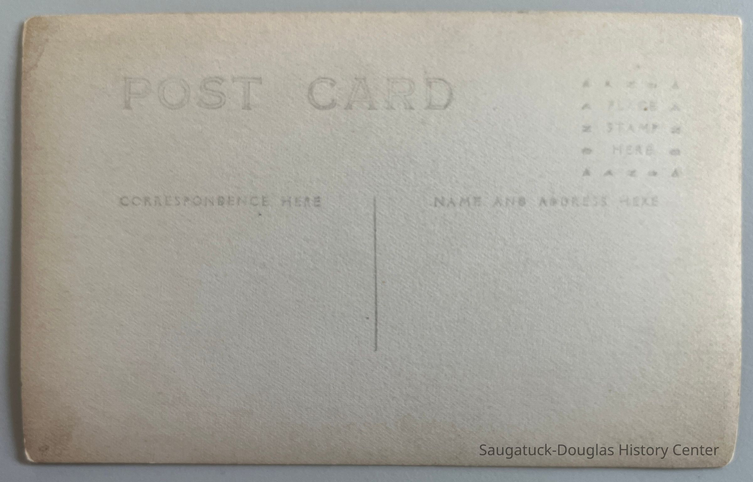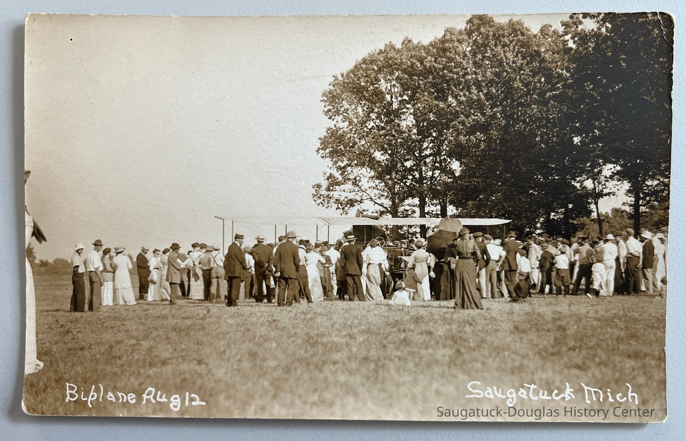 Real photo postcard, never mailed, that depicts a group of people gathered around a biplane, also called an airplane or an aeroplane. The photo in inscribed "Saugatuck Mich" but the location is unknown.Context
