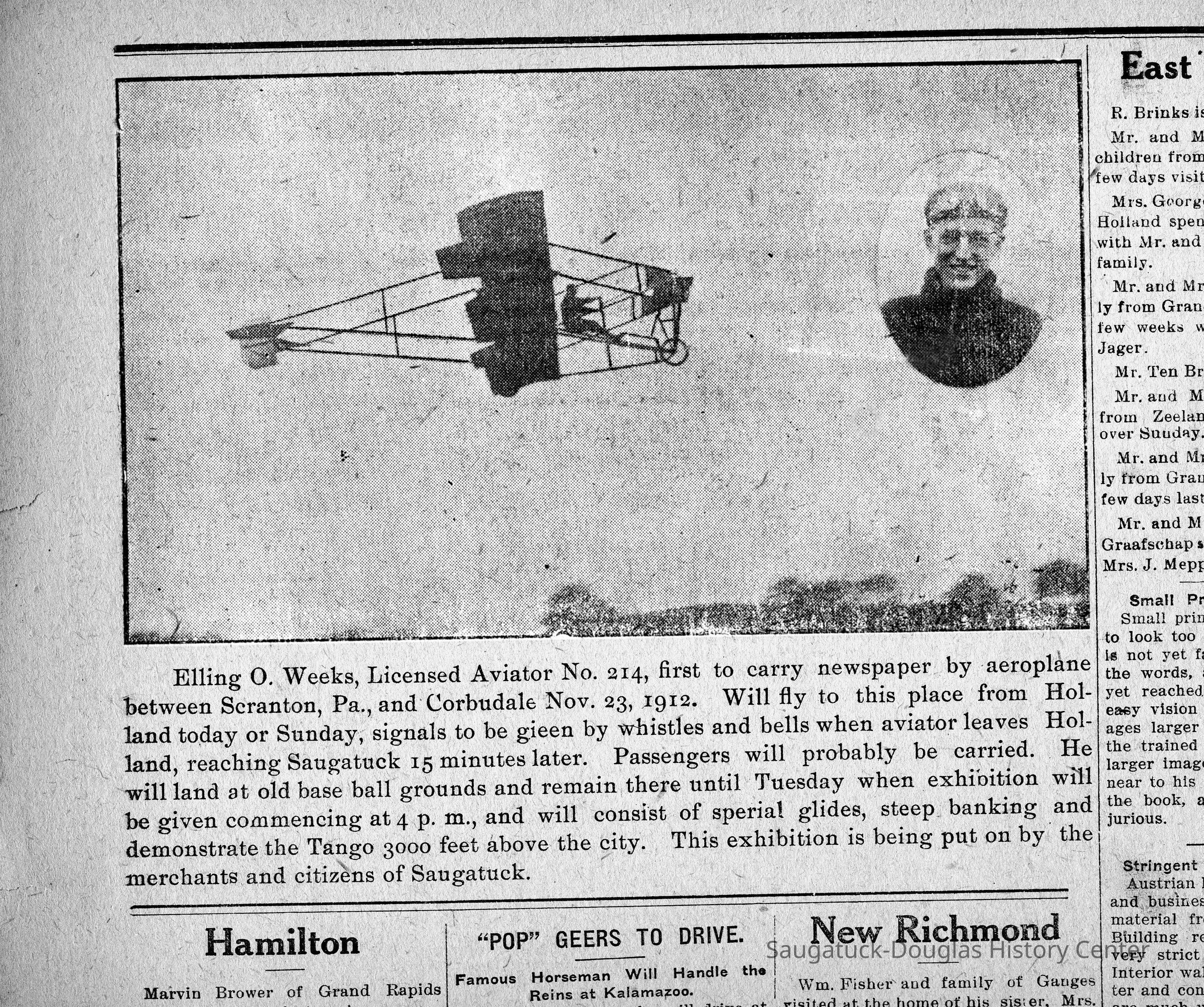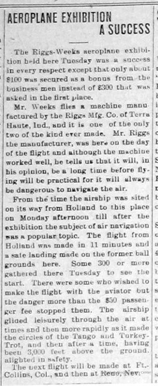 "E.O. Weeks, the aviator whose machine has been at the fairgrounds for the last two weeks, attempted a flight to Saugatuck, Sunday, at about 9:30, and many churchgoers of this city were astounded to see about 4,000 feet in the air an aeroplane going westward. He turned back when cloud cover entered but did make a successful flight to Saugatuck on Monday." -- Holland City News/The Holland Sentinel, Thursday, Aug. 14, 1913Cataloged By