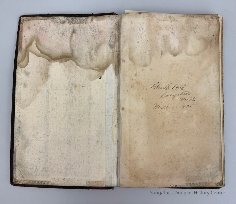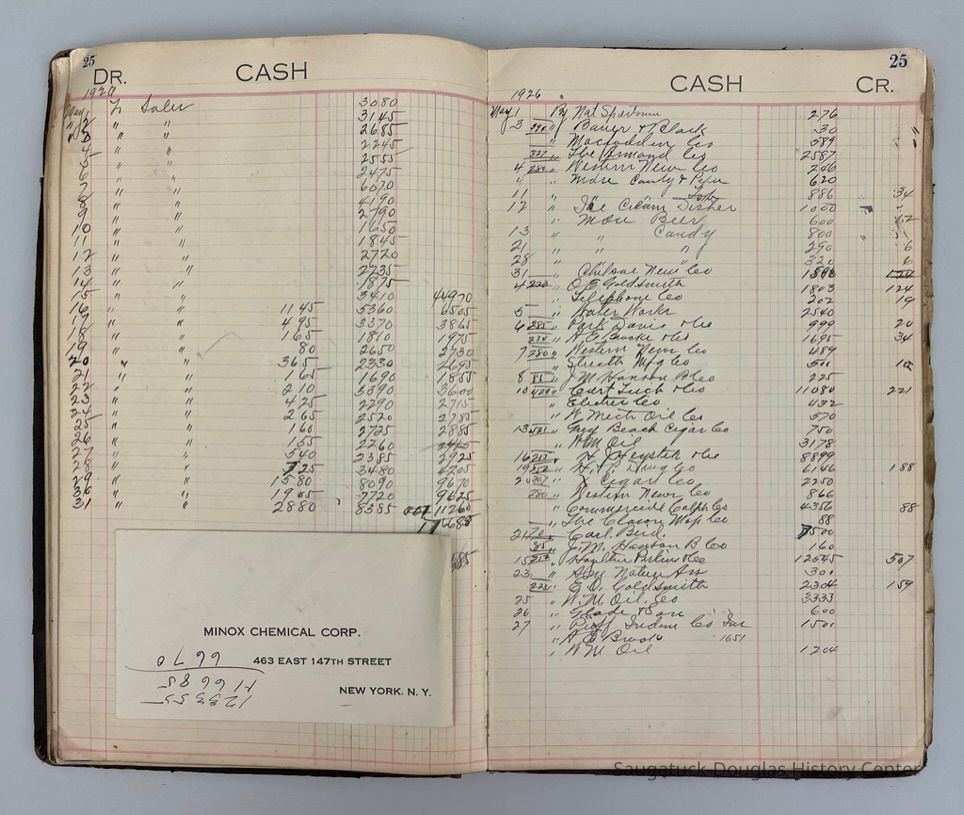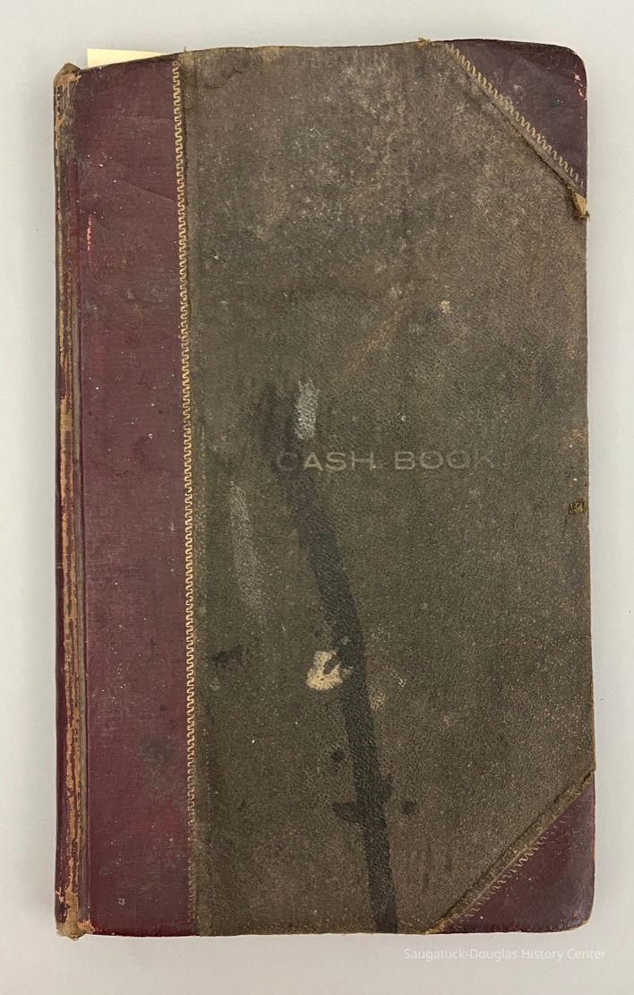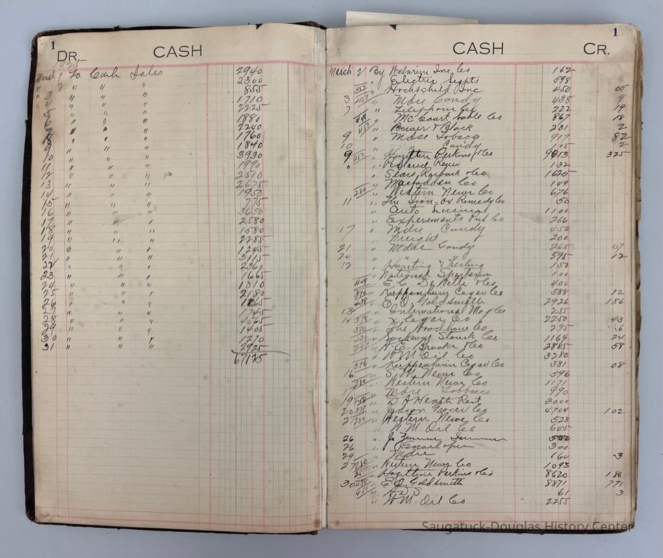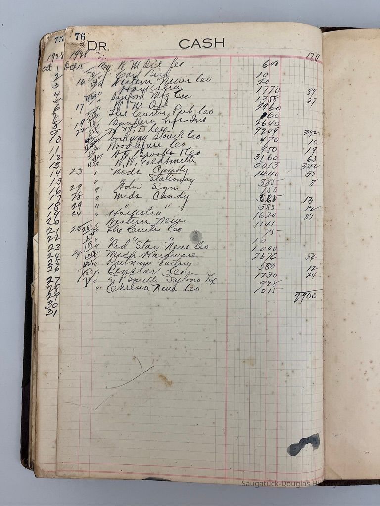 Black and dark red ledger with "Cash Book" stamped on the cover. "Charles E. Bird, Saugatuck Mich., March 1, 1925 is written on the inside cover. The 76 pages record cash "DR" [ debit record of purchase made for the store] and "CR" [credit record of items sold by the store] from 1925 to 1928. The ledgerContext
