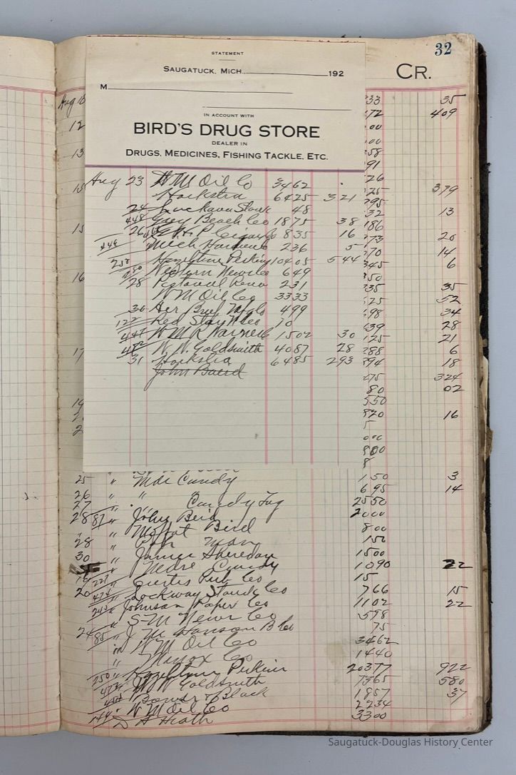 Details about purchases for and from a drug store in the 1920s with many community members' names listed. Bird's Drug Store sold a variety of items including fishing tackle, automobile fuel, souvenirs, etc.Collection