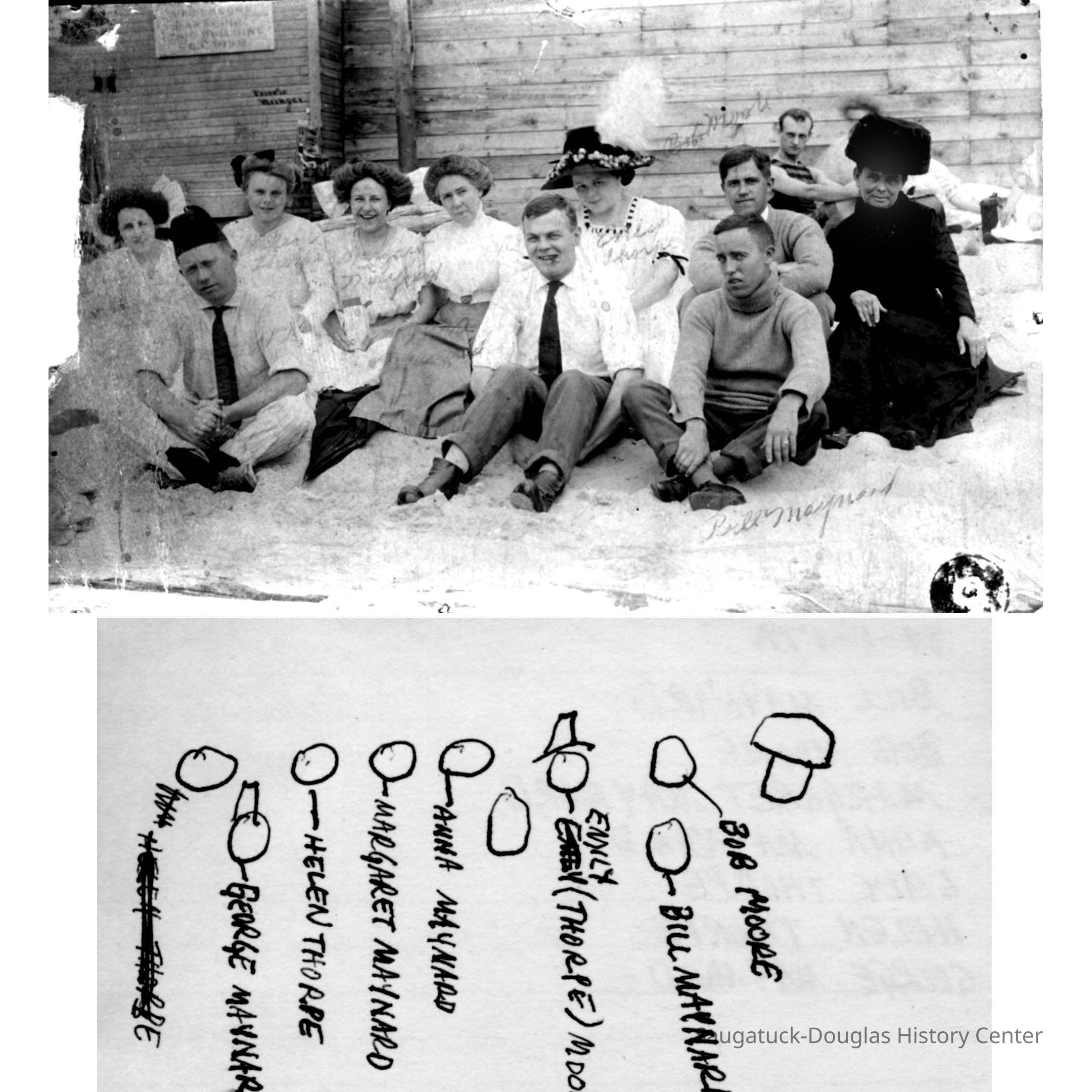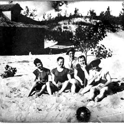 A. A mixed group of men and women dressed in street clothing and sitting on the sand in front of the beach house. Anna Maynard and a woman with a dark, cylindrical hat appear to be a generation older than the other sitters. Notes on the postcard and on an accompanying index card identifies some of the sitters as Bob Moore, Bill Menard, Emily (Thorpe) Moore [wearing hat adorned with flowers], Anna Menard, Margaret Menard, Helen Thorpe, and George Menard [wearing fez].