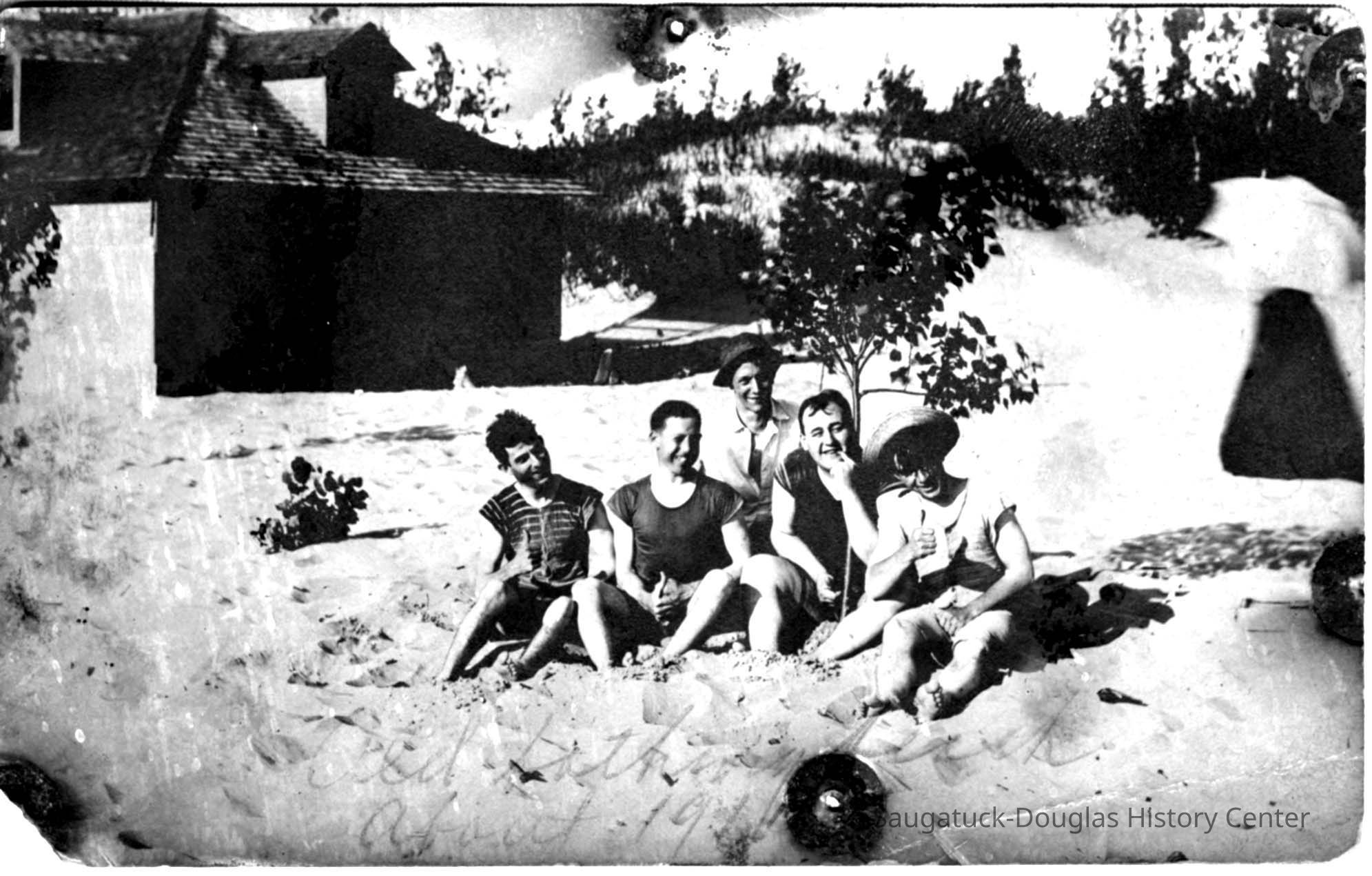 B. Five young men in swimming attire are sitting under a small tree and goofing for the camera. The beach house is behind the group to the left. A note written on the front of the card reads "Old bathing beach about 190?" [The final number in the year is obscured by thumbtack rust].