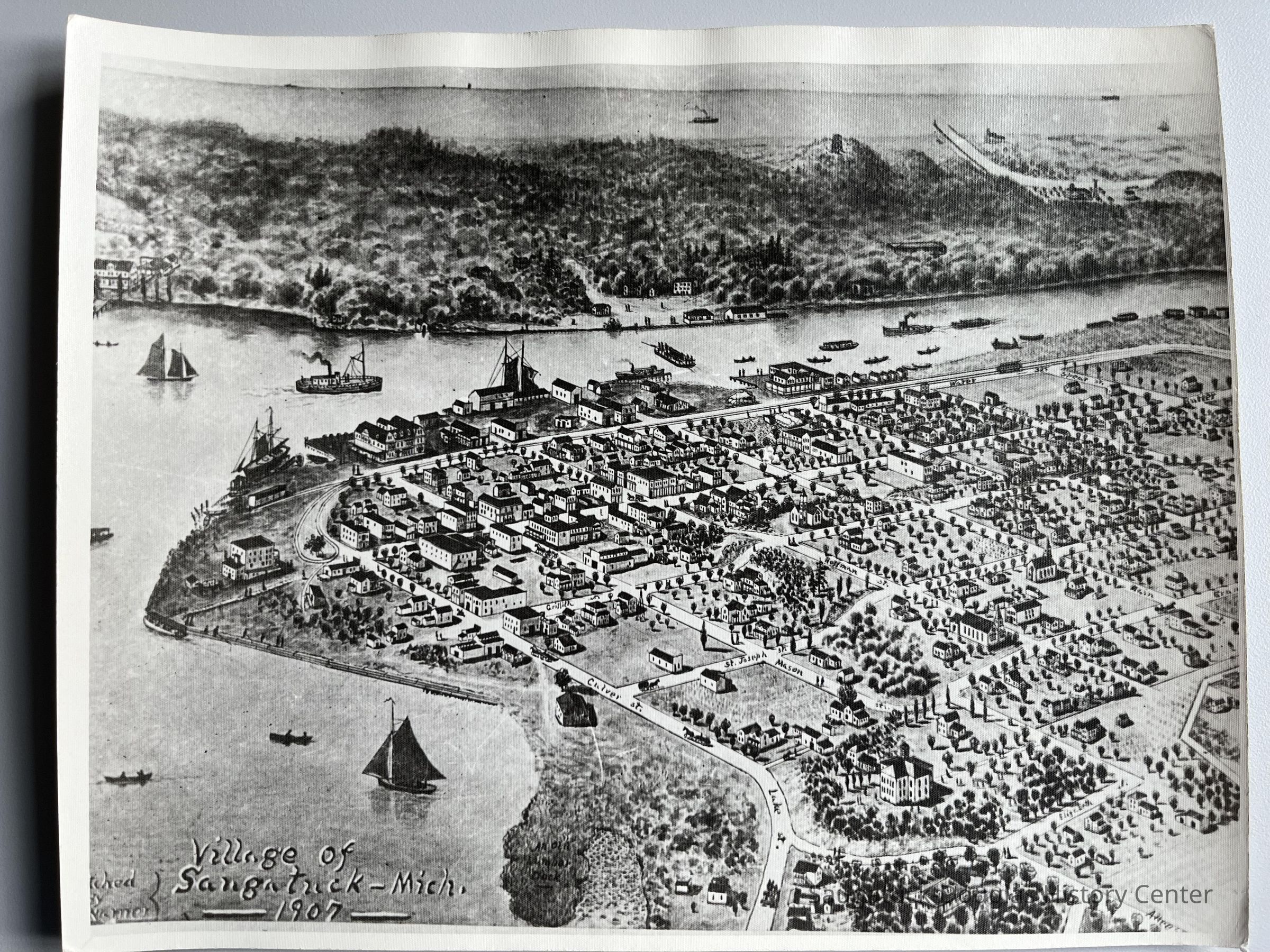 Reproduction of the Joseph Warner hand-drawn birds eye or aerial map of the Village of Saugatuck 1907Photograph Details